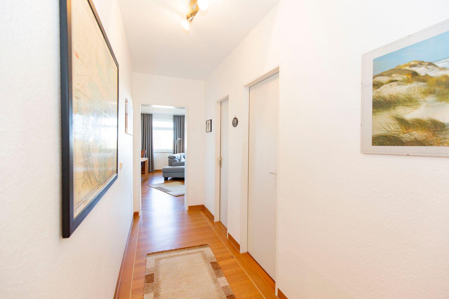 Haus "Trafalgar", Typ D, Appartement-Nr. 221 bis 4 Pers., 2.Etage, ca. 66 qm, Nord/Westseite (eingeschränkter Meerblick), Wohn/Schlafbereich mit Schrankbett, Schlafzimmer mit Doppelbett, 2. TV im Schlafzimmer, neue separate Küche mit Geschirrspüler, 4 Platten Ceranfeld und Mikrowelle, Dusche/WC, Nichtraucher-App. Balkon, Kabel-TV, kostenl. W-LAN-Anschluss, Tiefgaragenstellplatz, Strandkorb im Sommer 2026.