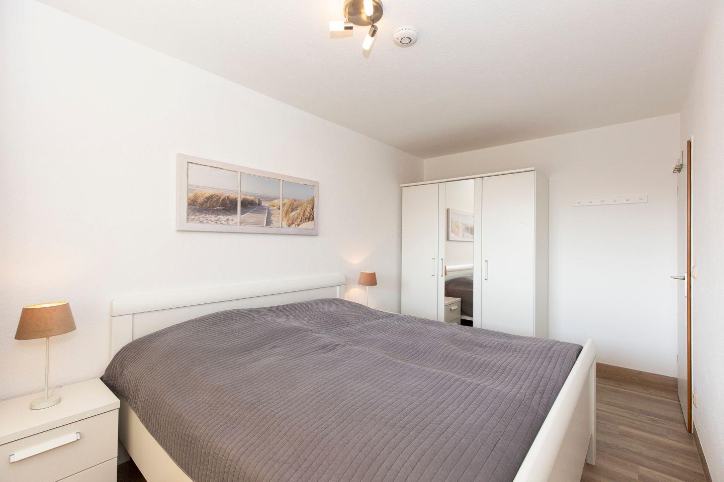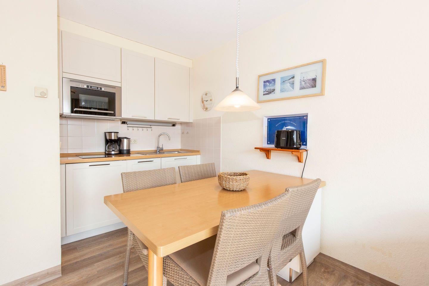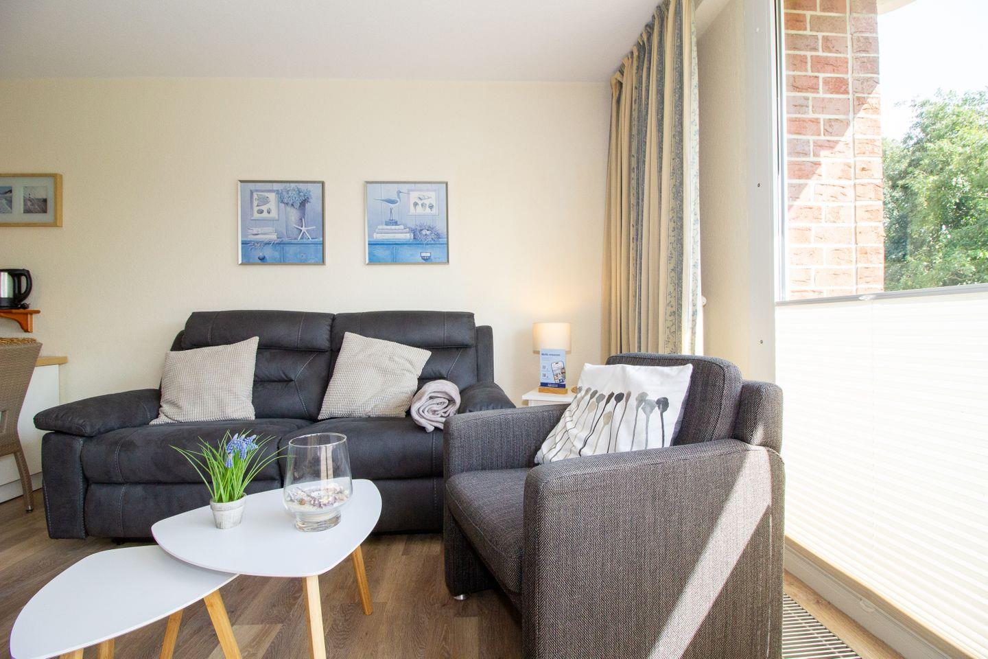 Haus "Trafalgar", Typ B, App-Nr. 145, bis 2 Pers., 1.Etage, ca. 46 qm, Südseite (ohne Meerblick), Schlafzimmer mit Doppelbett, Wohnzimmer mit Schlafcouch, Küchenzeile mit Geschirrspüler, Ceranfeld und Mikrowelle, Dusche/WC, Balkon, Kabel-TV, Telefon, kostenl. WLAN-Zugang im App., Tiefgaragenstellplatz, Nichtraucherappartement, Strandkorb im Sommer 2026, 1 Hund erlaubt.