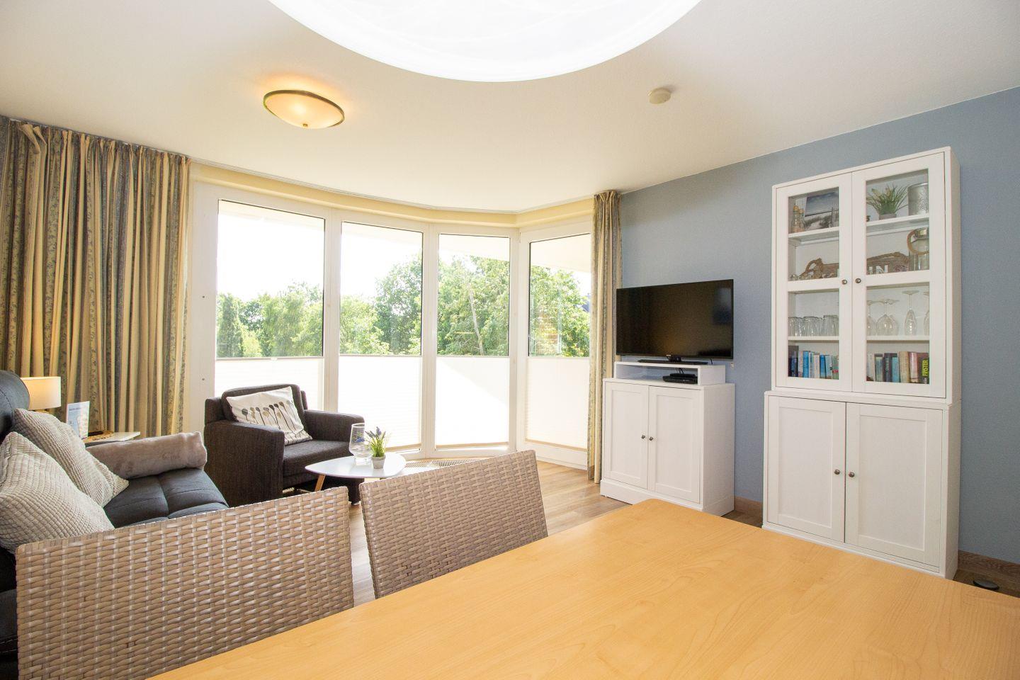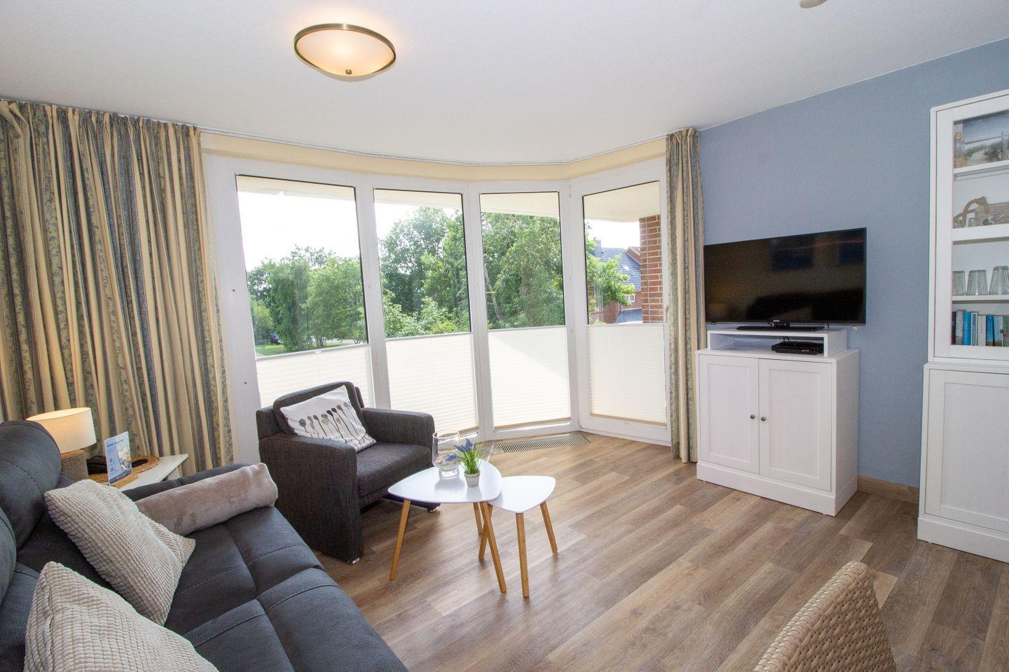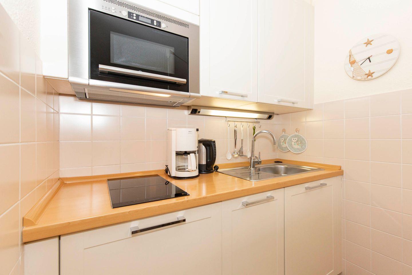 Haus "Trafalgar", Typ B, App-Nr. 145, bis 2 Pers., 1.Etage, ca. 46 qm, Südseite (ohne Meerblick), Schlafzimmer mit Doppelbett, Wohnzimmer mit Schlafcouch, Küchenzeile mit Geschirrspüler, Ceranfeld und Mikrowelle, Dusche/WC, Balkon, Kabel-TV, Telefon, kostenl. WLAN-Zugang im App., Tiefgaragenstellplatz, Nichtraucherappartement, Strandkorb im Sommer 2026, 1 Hund erlaubt.