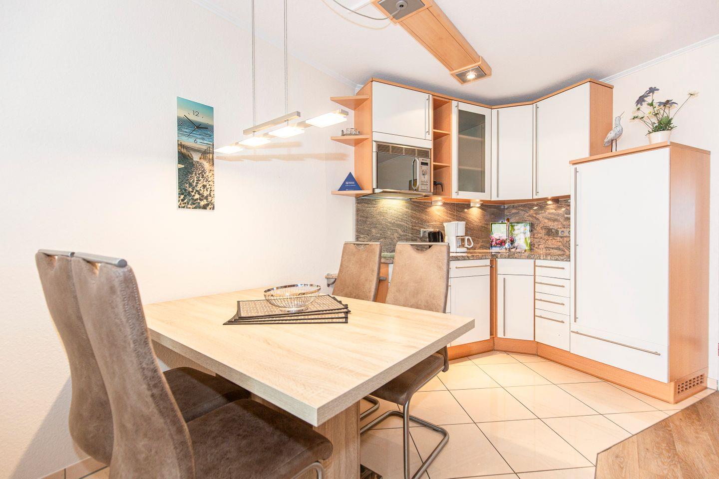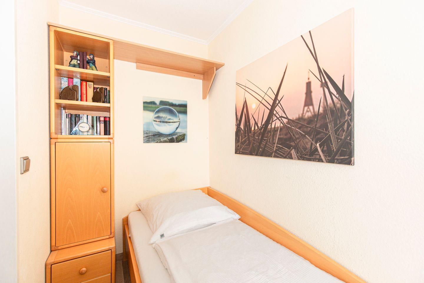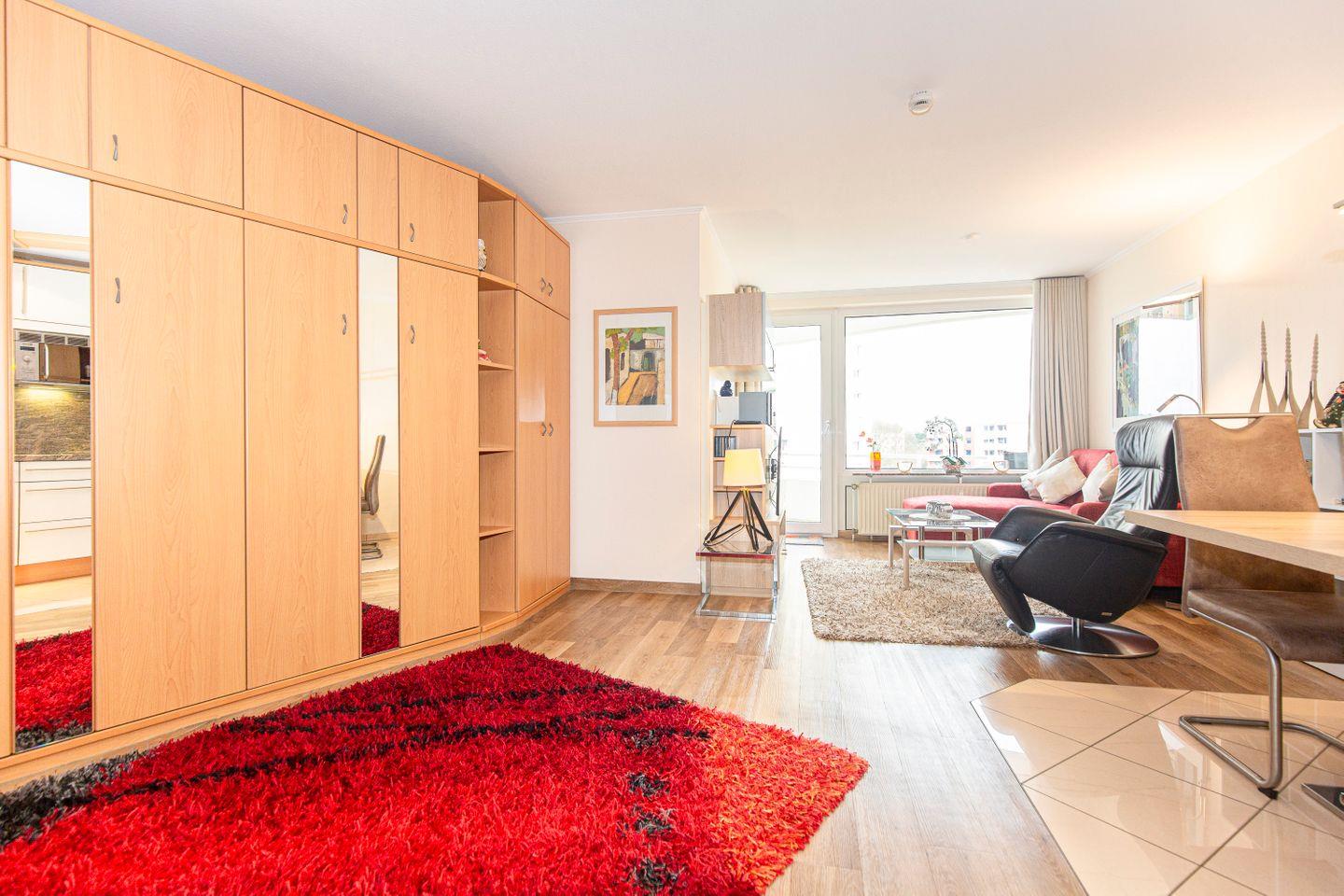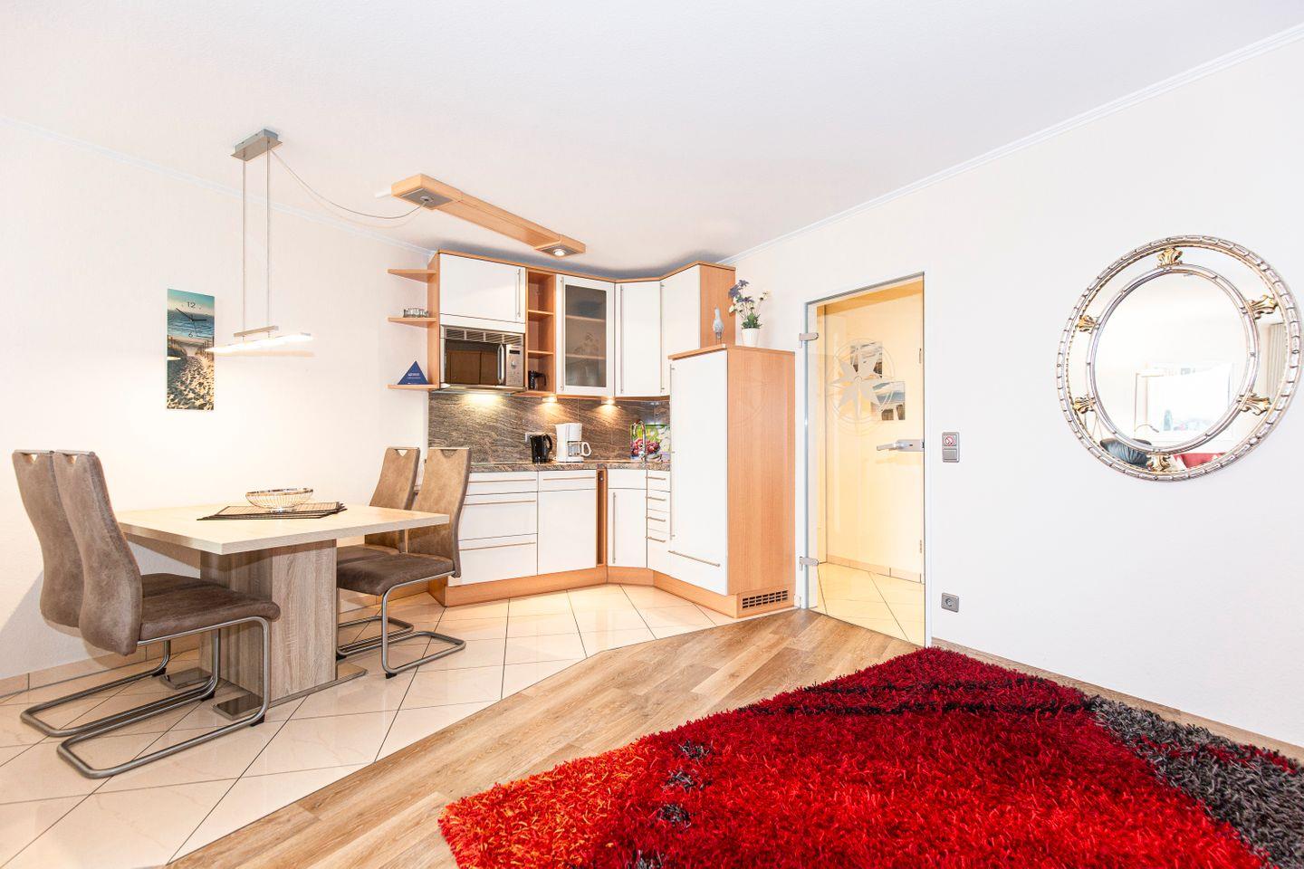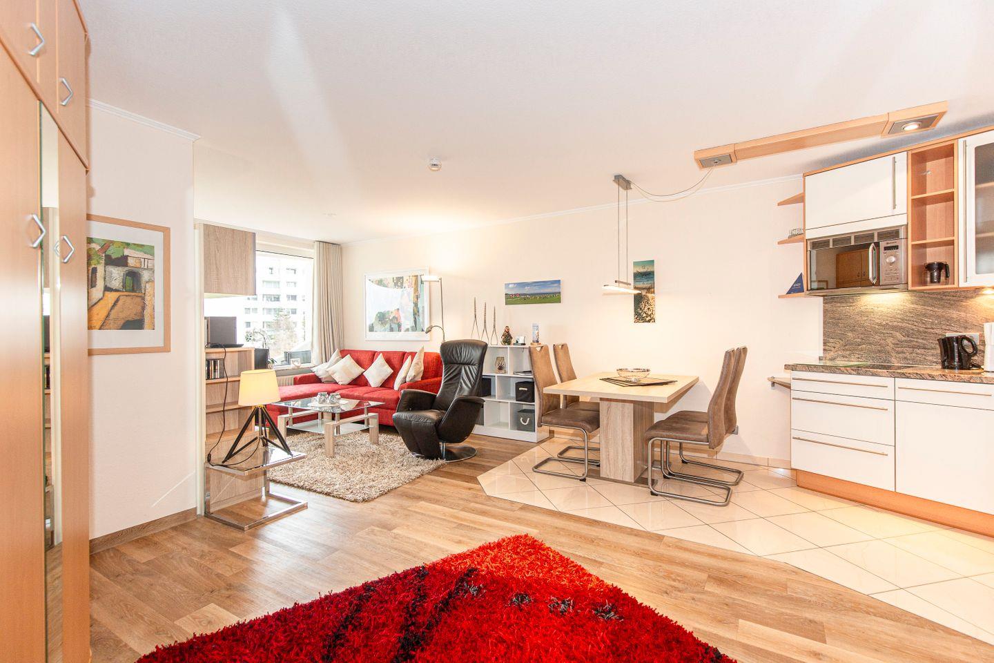 Haus "Lord Nelson", Typ 2, App.-Nr. "219", bis 3 Personen, 2. Etage, ca. 40 qm Wohnungsgröße, Ostseite (ohne Meerblick/Richtung Elbe), Balkon, Wohnbereich mit Schrankbett, separates kleines Kinderzimmer mit Einzelbett, Dusche/WC, Küchenzeile mit Mikrowelle, Cerankochfeld und Geschirrspüler, Kabel-TV, kostenl. WLAN-Zugang im App., Nichtraucherappartement, Haustiere sind nicht gestattet, Tiefgaragenstellplatz, Strandkorb im Sommer 2026.