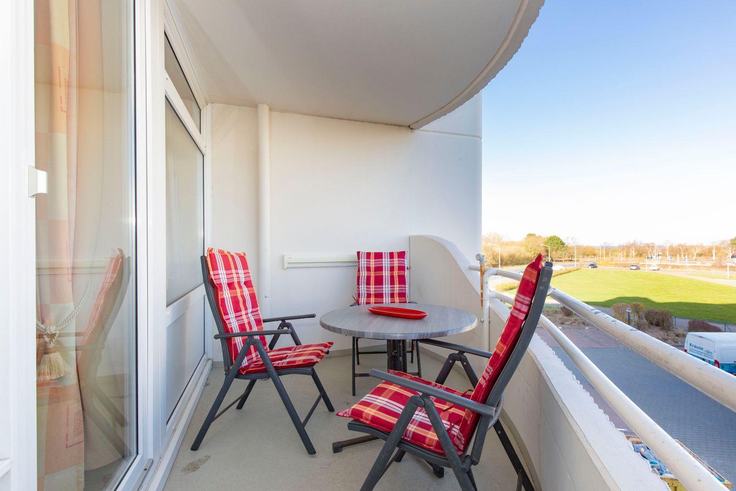 Auf der Terrasse können Sie jederzeit die frische Nordseeluft genießen und sich entspannt zurücklehnen. Dazu stehen bequeme Balkonmöbeln für Sie bereit. Von hier aus können Sie Schiffe auf dem Weltschifffahrtsweg beobachten.