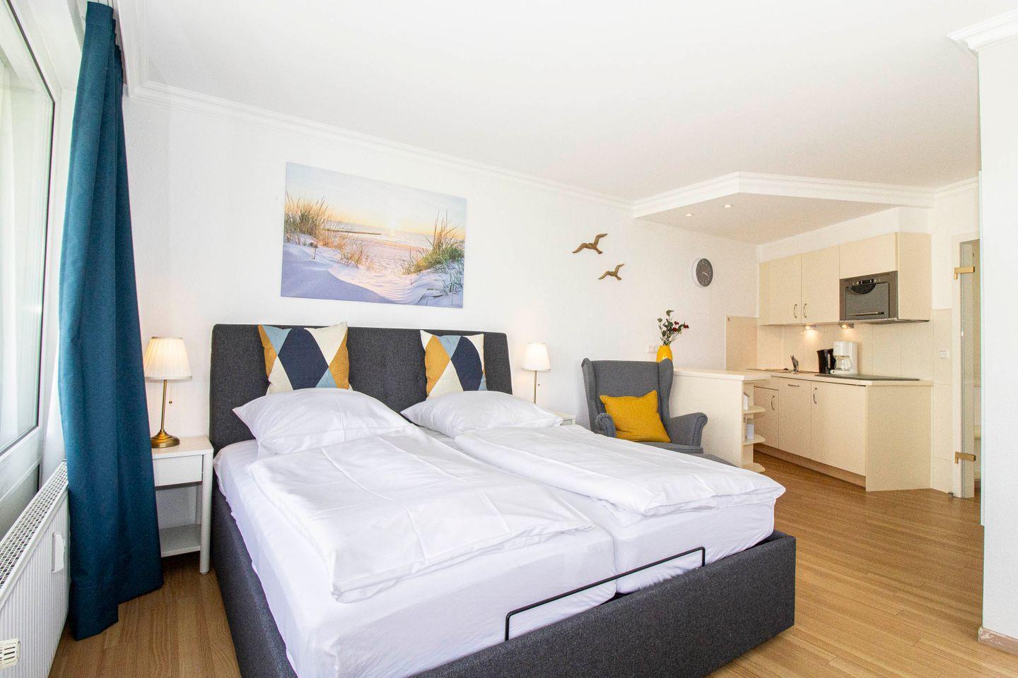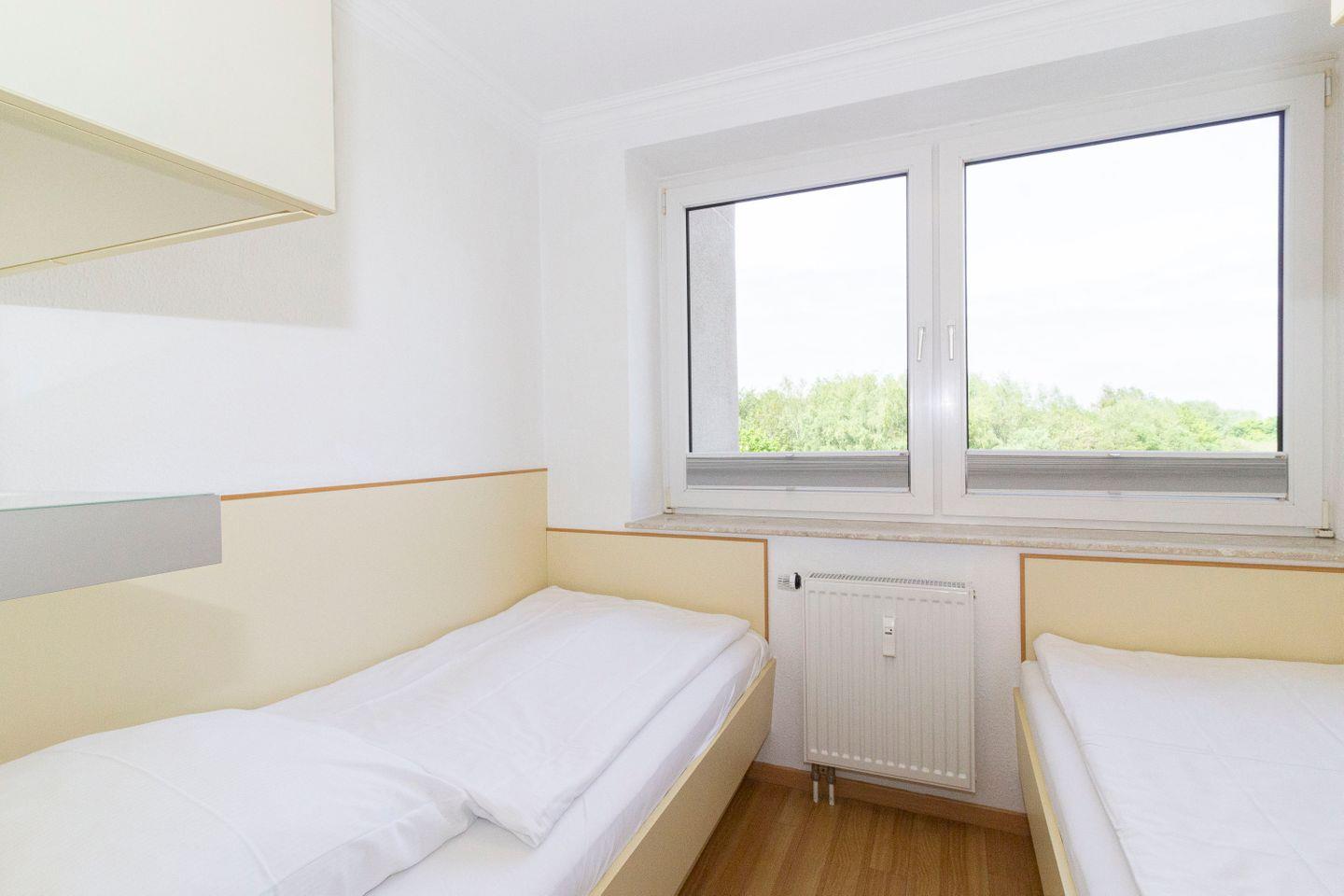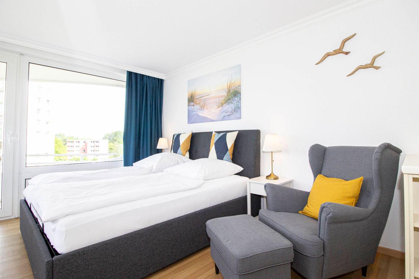 Haus "Lord Nelson", Typ 1, App.-Nr. 320, bis 4 Pers., 3. Etage, ca. 43 qm, Weltschifffahrtsweg, seitlicher Meerblick Richtung Elbe, Wohnbereich mit Doppelbett, kein Sofa, sep. Schlafzimmer mit zwei Einzelbetten, Dusche/WC/Föhn, Küchenzeile mit Geschirrspüler/4Platten-Ceranfeld und Mikrowelle, Balkon, Telefon, Kabel-TV (Flat-Screen-TV), kostenl. WLAN-Zugang im App., Außenstellplatz, Strandkorb im Sommer 2026, Haustiere sind nicht erlaubt, Nichtraucherwohnung