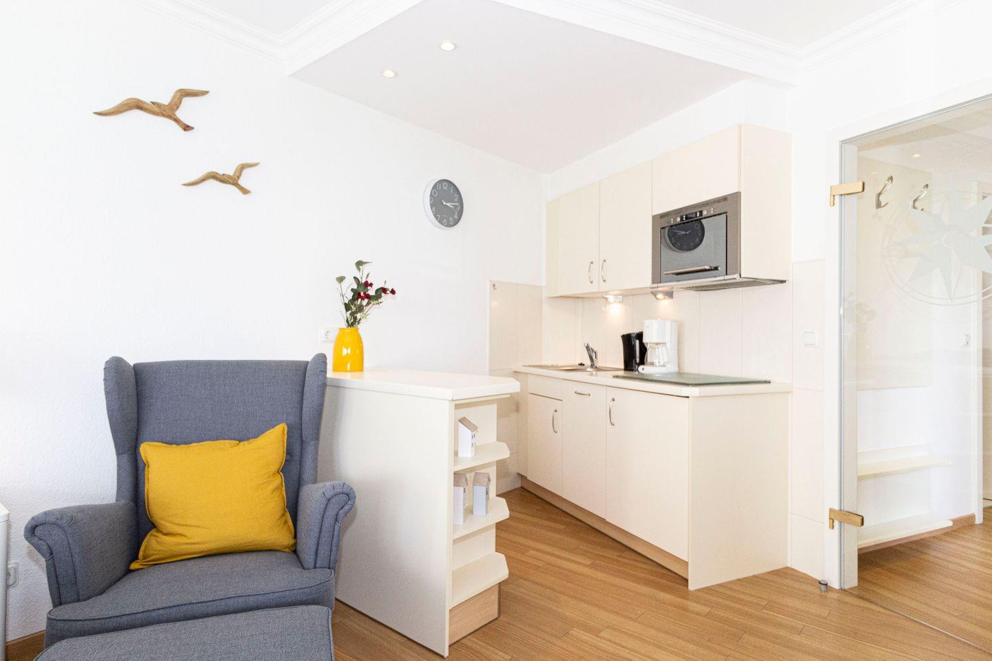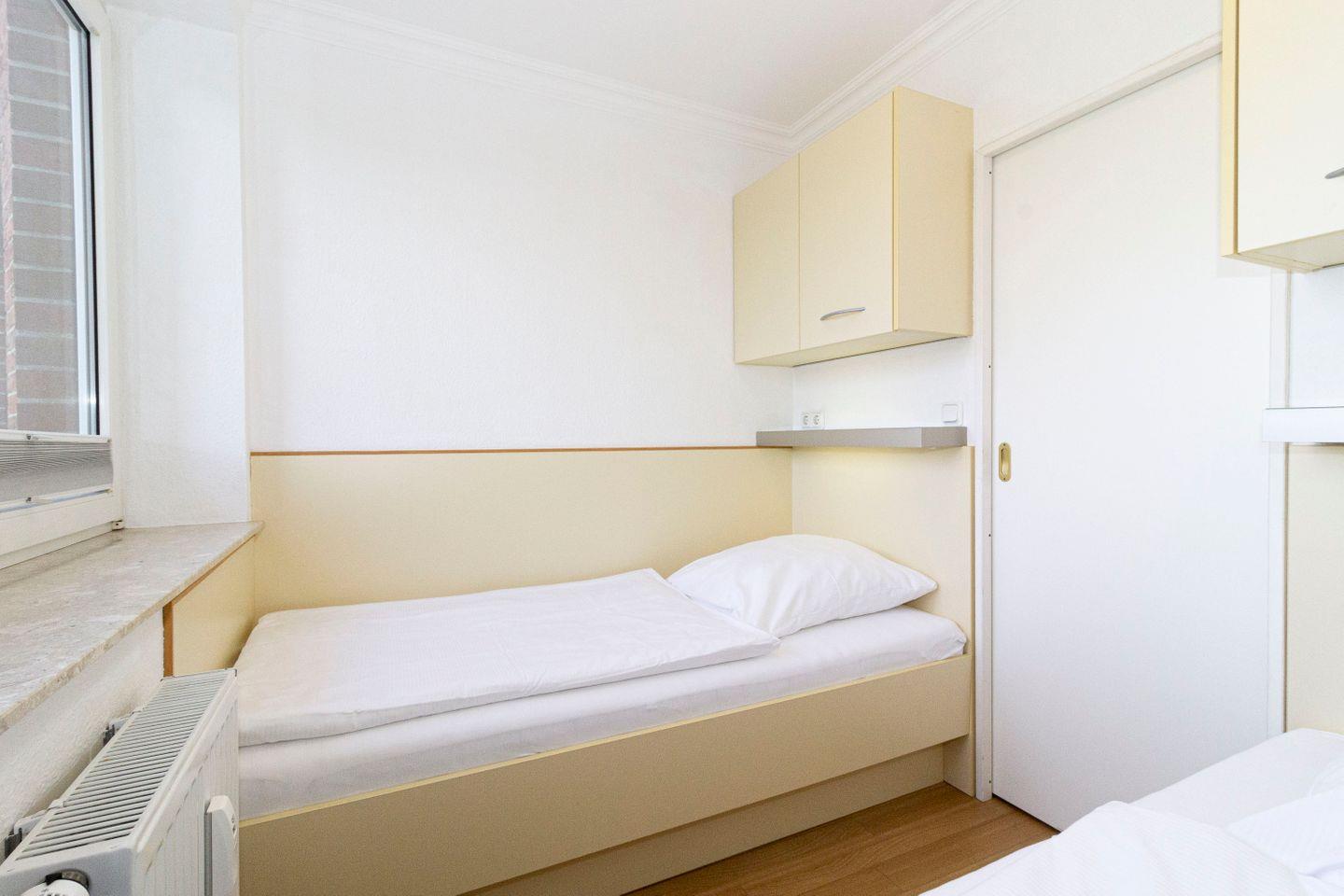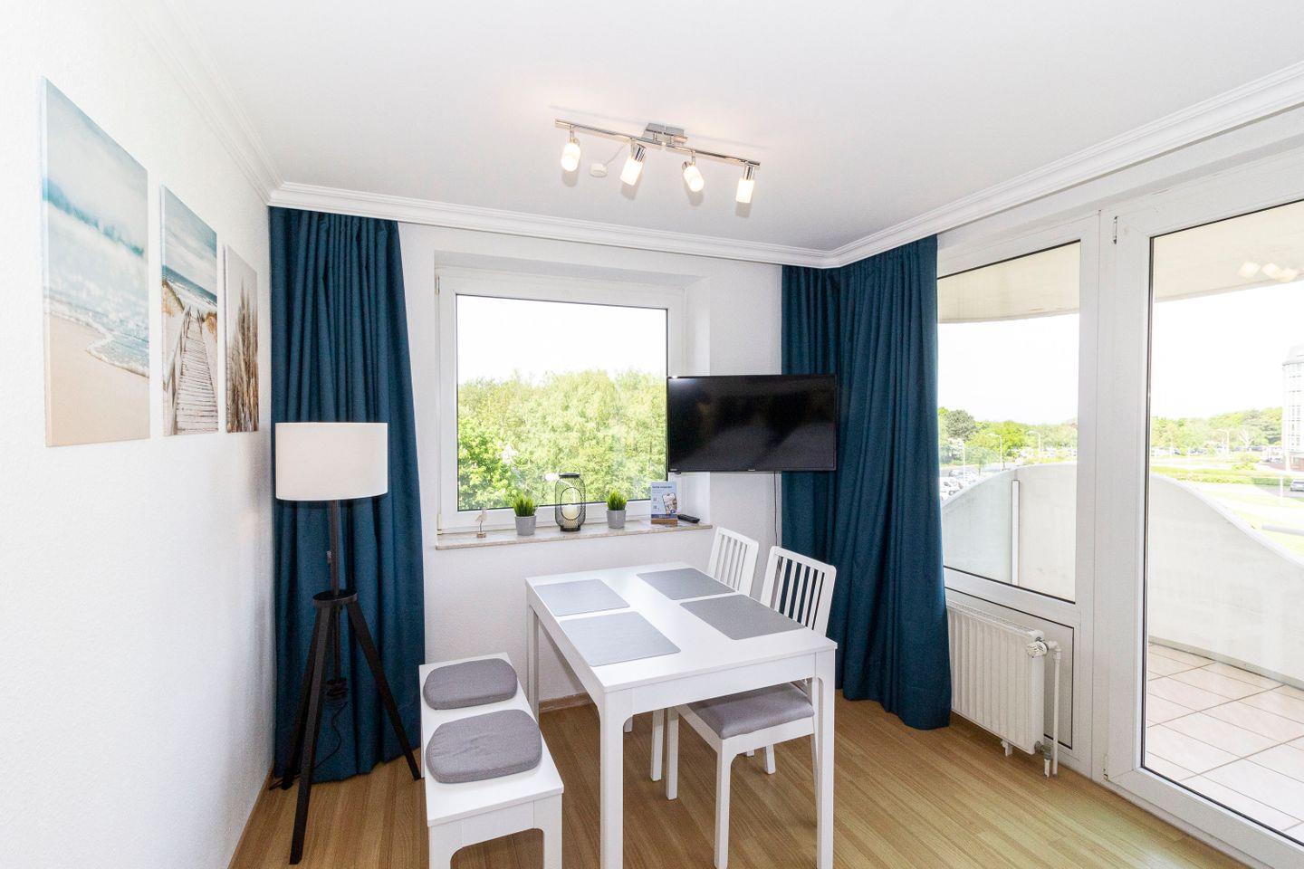 Haus "Lord Nelson", Typ 1, App.-Nr. 320, bis 4 Pers., 3. Etage, ca. 43 qm, Weltschifffahrtsweg, seitlicher Meerblick Richtung Elbe, Wohnbereich mit Doppelbett, kein Sofa, sep. Schlafzimmer mit zwei Einzelbetten, Dusche/WC/Föhn, Küchenzeile mit Geschirrspüler/4Platten-Ceranfeld und Mikrowelle, Balkon, Telefon, Kabel-TV (Flat-Screen-TV), kostenl. WLAN-Zugang im App., Außenstellplatz, Strandkorb im Sommer 2026, Haustiere sind nicht erlaubt, Nichtraucherwohnung