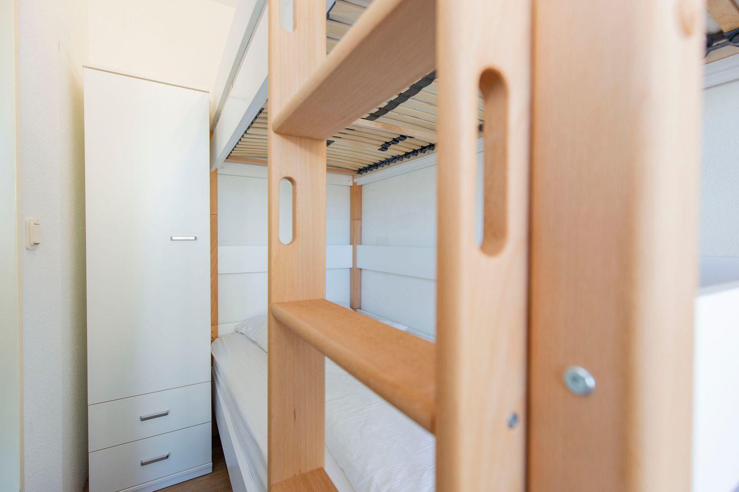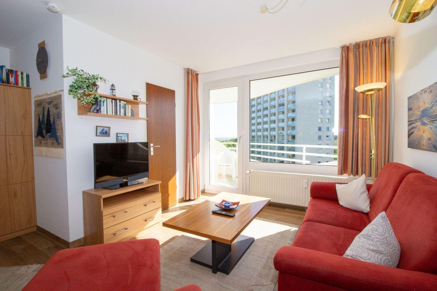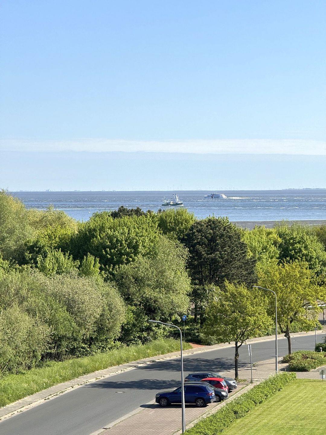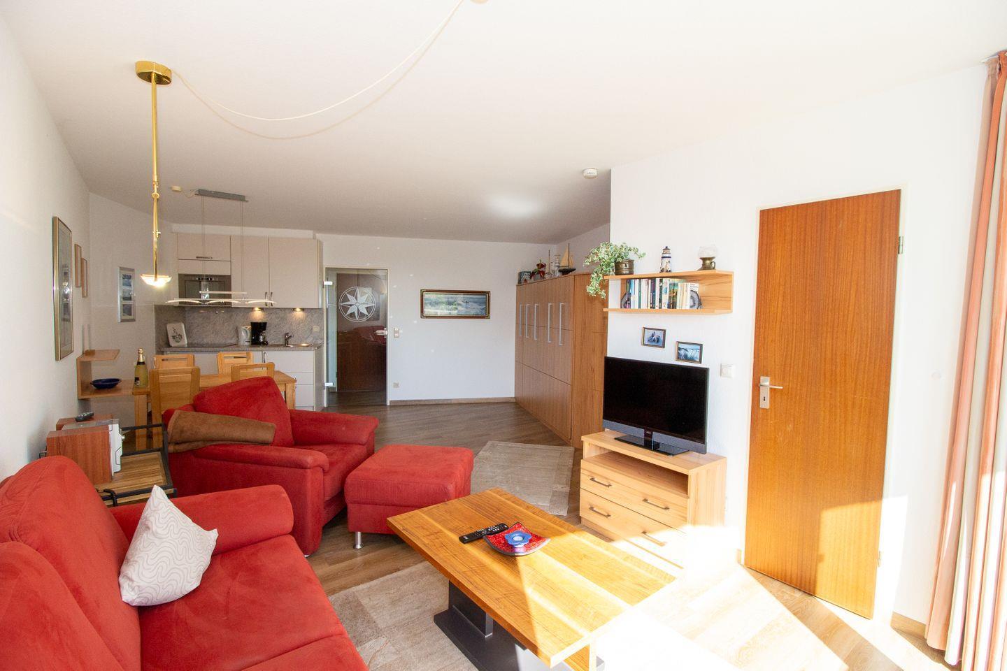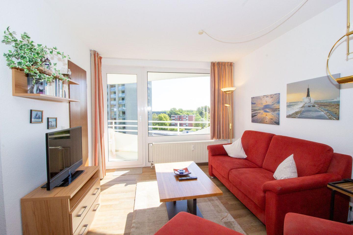 Haus "Lord Nelson", Typ 2, App.-Nr. 518, bis 4 Personen, ca. 40 qm, Richtung Weltschifffahrtsweg, seitlicher Meerblick Richtung Elbe, Wohnbereich mit neuem Schrankbett (einzeln klappbar), separates Schlafzimmer mit Etagenbett mit hohem Einstieg, Dusche/WC erneuert Ende 2023, Küchenzeile mit Geschirrspüler, 4-Platten-Ceranfeld, Mikrowellen-Grillkombination, Bodenbelag neu: Vinyl-Design-Boden, Balkon, Telefon, Flatscreen-TV, kostenl. W-Lan Zugang im App., Radio/CD, für Haustiere zugelassen, Tiefgaragenstellplatz, Strandkorb im Sommer 2026.