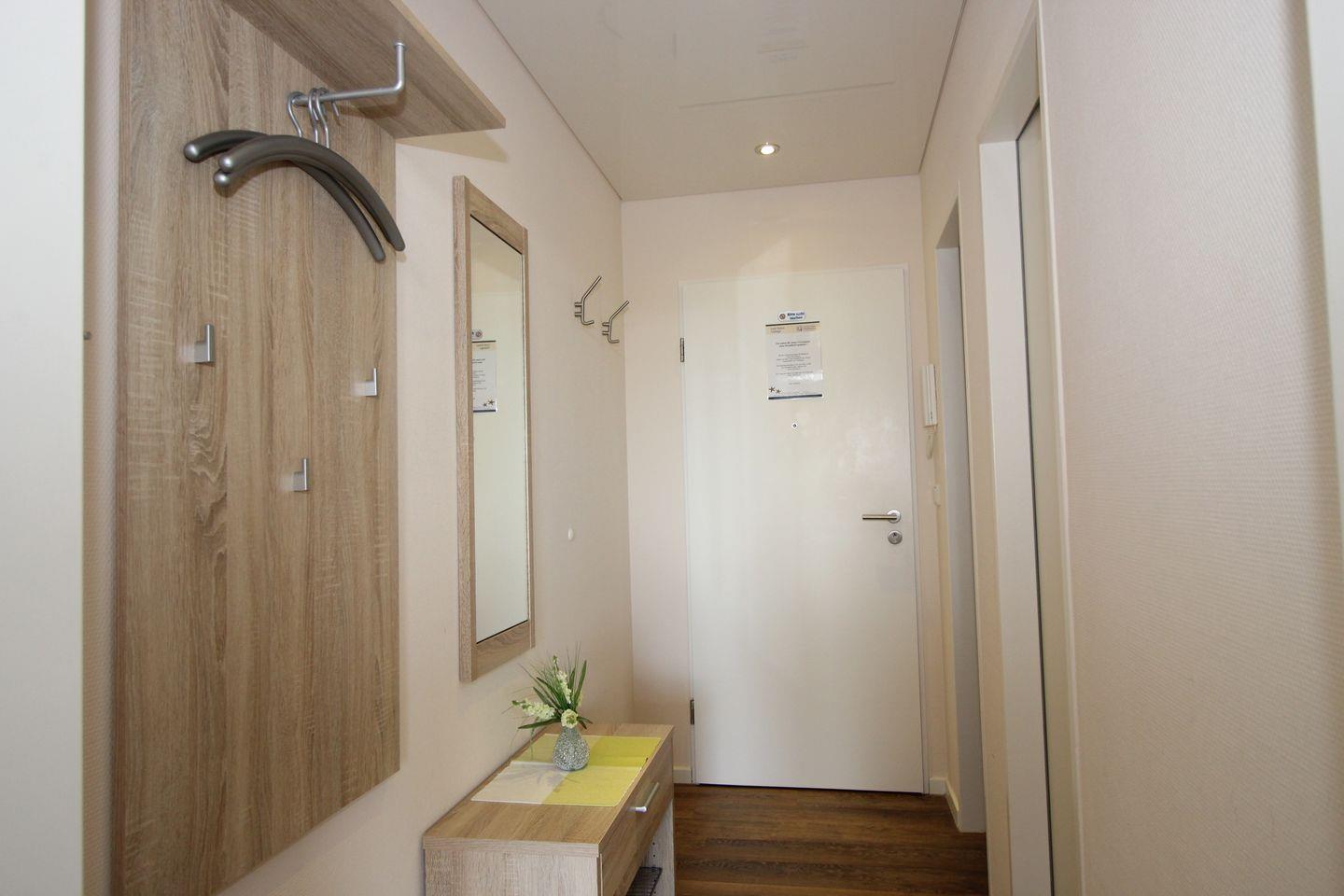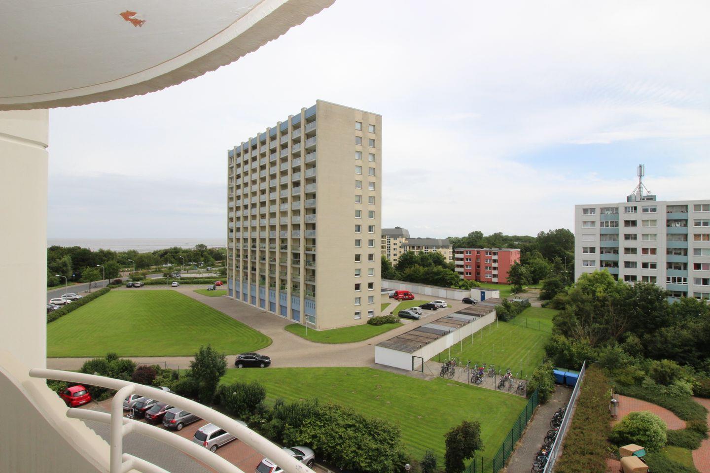 Haus "Lord Nelson", Typ 2, App.-Nr. "516", bis 2 Personen, 5. Etage, ca. 40 qm Größe, Richtung Weltschifffahrtsweg (seitlicher Meerblick Richtung Elbe), separater Schlafbereich (innenliegend) mit zwei Einzelbetten, Küchenzeile mit Geschirrspüler, Backofen und Mikrowelle, Balkon, ohne Telefon, Kabel-TV, DVD-Player, Dusche/WC, kostenl. WLAN-Zugang im App., Außenstellplatz, Strandkorb im Sommer 2026, ab 7 Nächten wird einmalig p.P. Bettwäsche gestellt, Nichtraucherwohnung, Haustiere sind nicht gestattet
