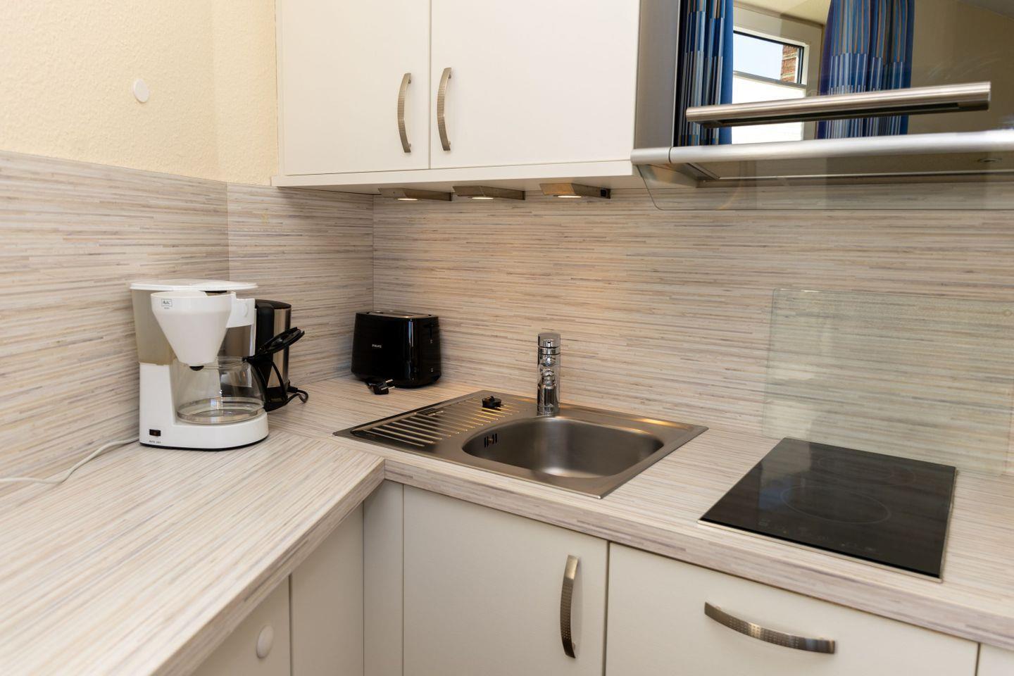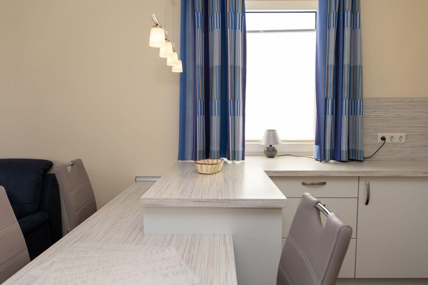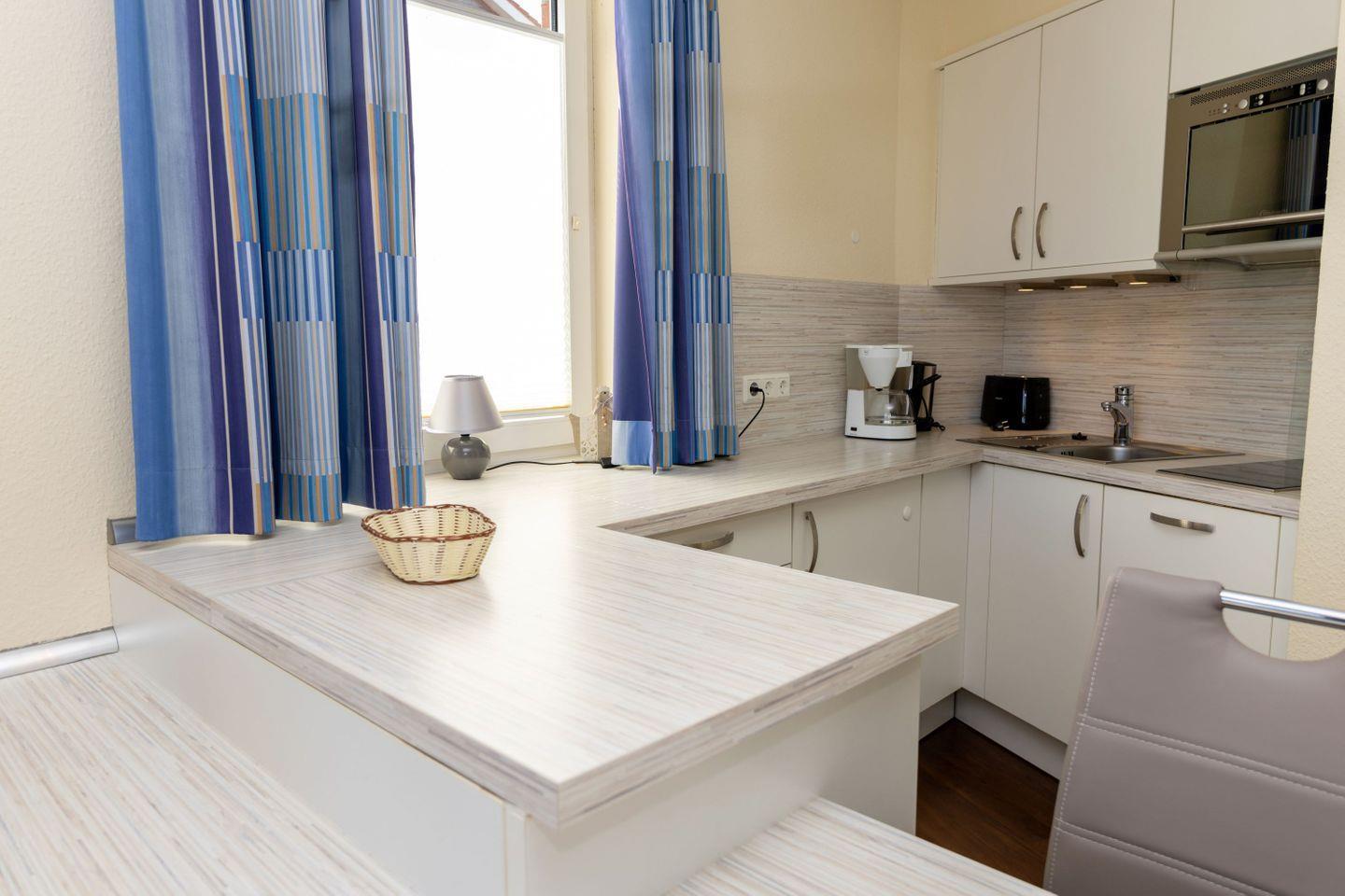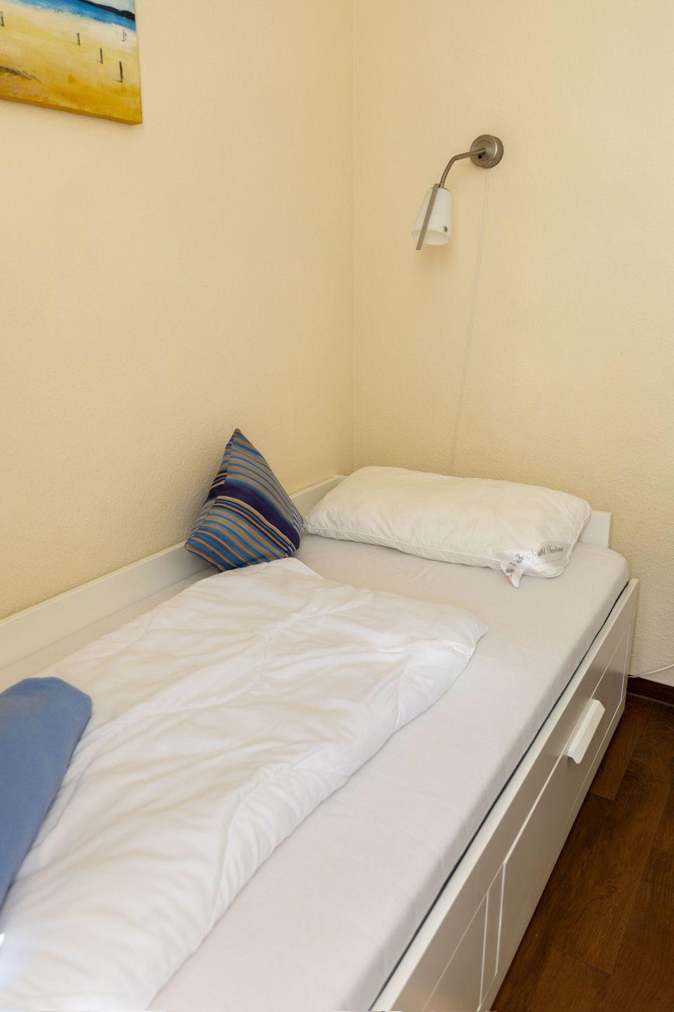 Haus "Lord Nelson", Typ 7, App.-Nr. "111", 1. Etage, bis 3 Pers., ca. 43 qm Größe, Weltschifffahrtsweg (ohne Meerblick, Richtung Elbe), Wohnbereich mit Schrankbett (einzeln klappbar), sep. Schlafzimmer mit Einzelbett, Dusche/WC (sep. Zugang zum Bad aus beiden Zimmern möglich), helle Küchenzeile mit Fenster im Essbereich mit Mikrowelle/Grillfunktion und Geschirrspüler, Nichtraucher App., Balkon, Kabel-TV mit DVD-Player, CD-Player, kostenl. W-Lan-Zugang im App., Haustiere sind auf Anfrage gestattet, Außenstellplatz, Strandkorb im Sommer 2026