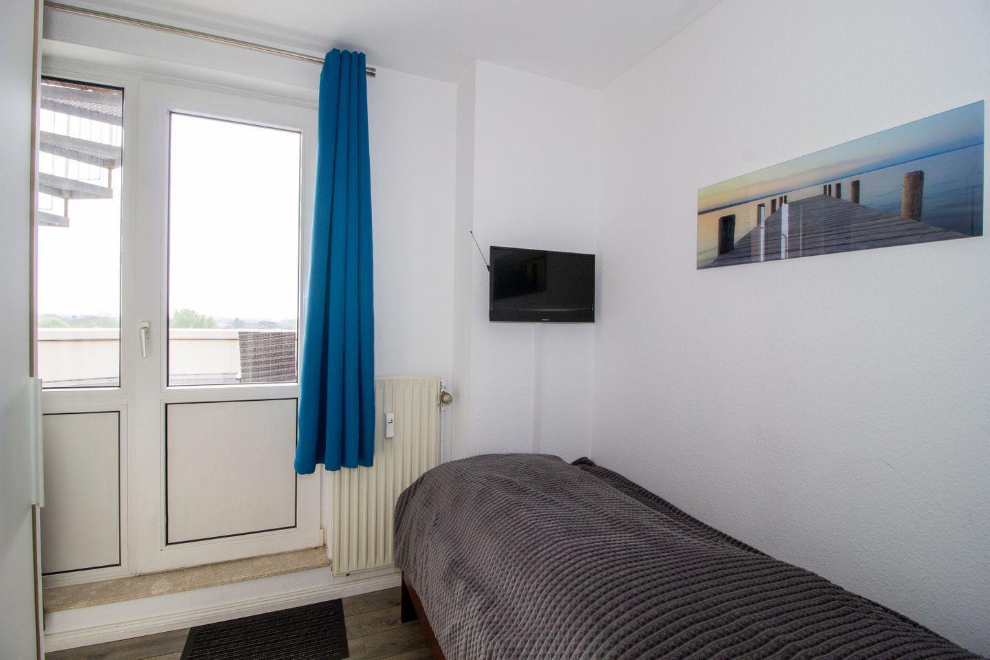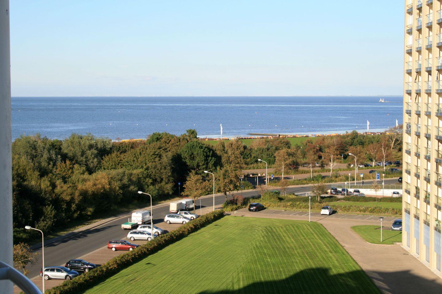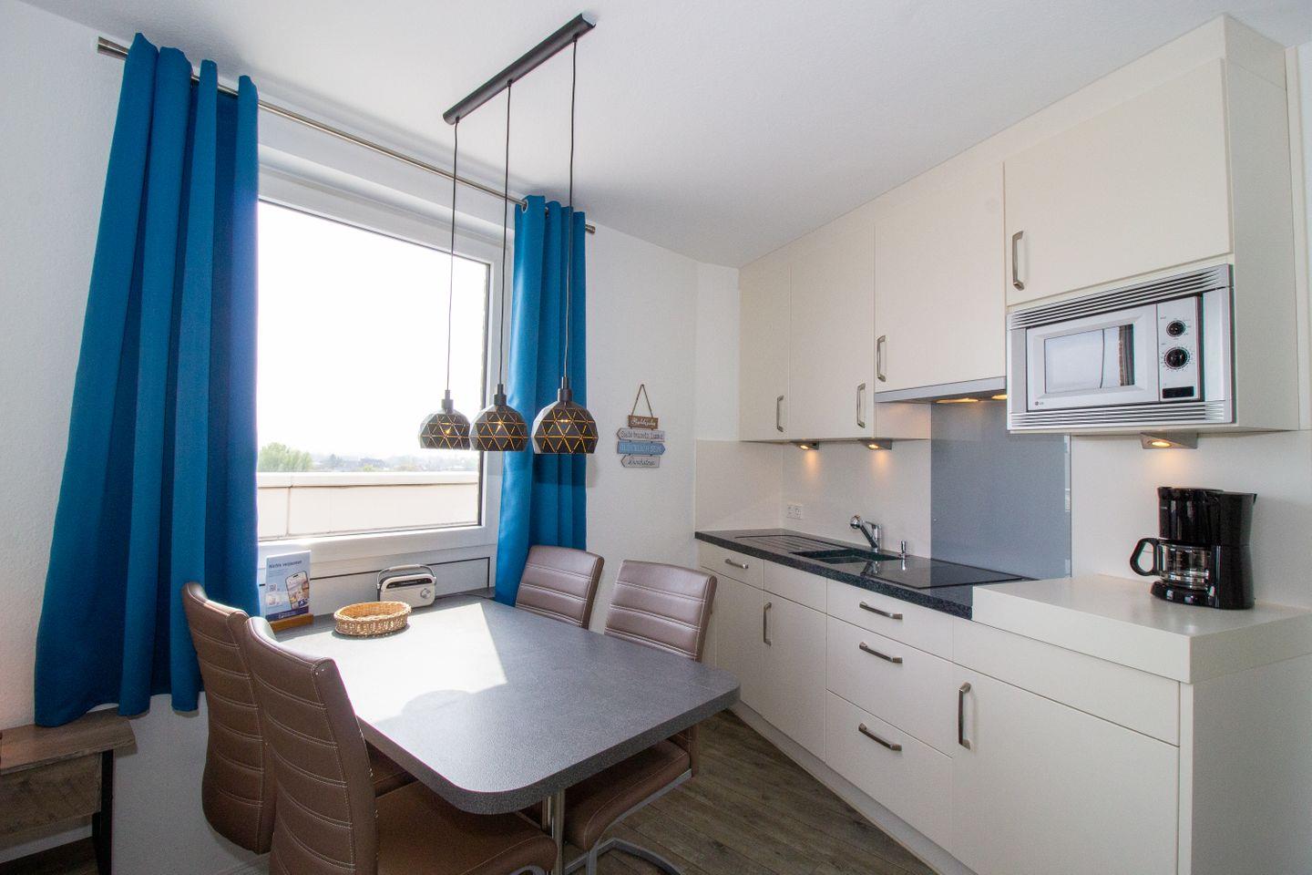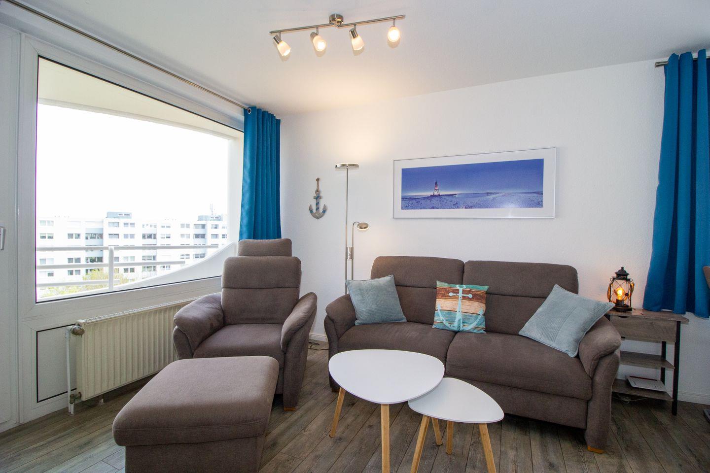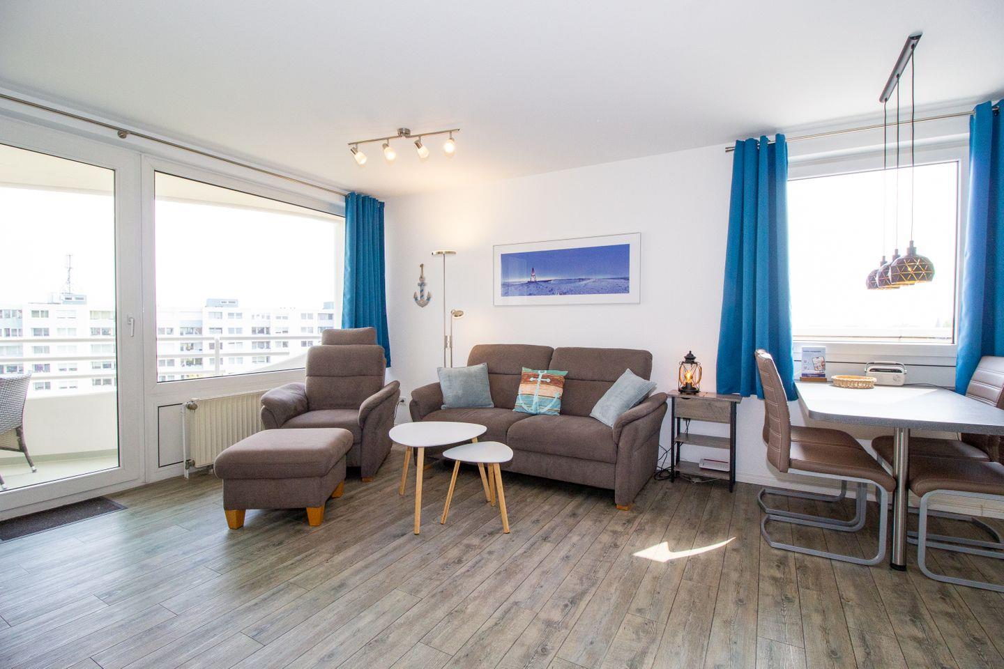 Haus "Lord Nelson", Typ 1, App.-Nr. "713", bis 3 Pers., 7. Etage, ca. 43 qm groß, Süd-Ostseite, Meerblick zur Elbmündung, von der Dachterrasse (ca. 40 qm) auch Richtung Cuxhaven, sep. Schlafzimmer mit 1 Einzelbett und 2. TV (hier nur öffentlich-rechtliche Sender), Schrankdoppelbett im Wohnbereich, Dusche/WC, Küchenzeile mit Geschirrspüler, Mikrowelle, 2-Platten-Ceranfeld, Kabel-TV im Wohnzimmer, kostenl. WLAN-Zugang im App., Balkon, Dachterrasse, Nichtraucher, Haustiere nicht erlaubt, Tiefgaragenstellplatz, im Sommer 2026 Strandkorb am Sandstrand.