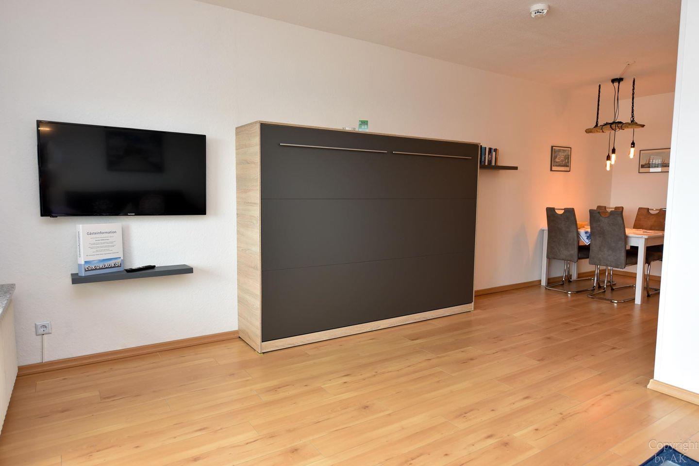 Die Wohnung verfügt über ein Wohnzimmer mit integriertem Schrankbett sowie eine separate Schlafnische mit zwei Einzelbetten. Die Küchenzeile ist mit einem Kühlschrank, einer Kaffeemaschine und einem Elektroherd ausgestattet. Für Ihre Unterhaltung steht ein Flachbildfernseher zur Verfügung. Das Badezimmer ist mit einer Dusche und einem WC ausgestattet. Die Wohnung verfügt zudem über einen Balkon, der einen malerischen Seeblick bietet. Ein Parkplatz in der Tiefgarage rundet das Angebot ab.