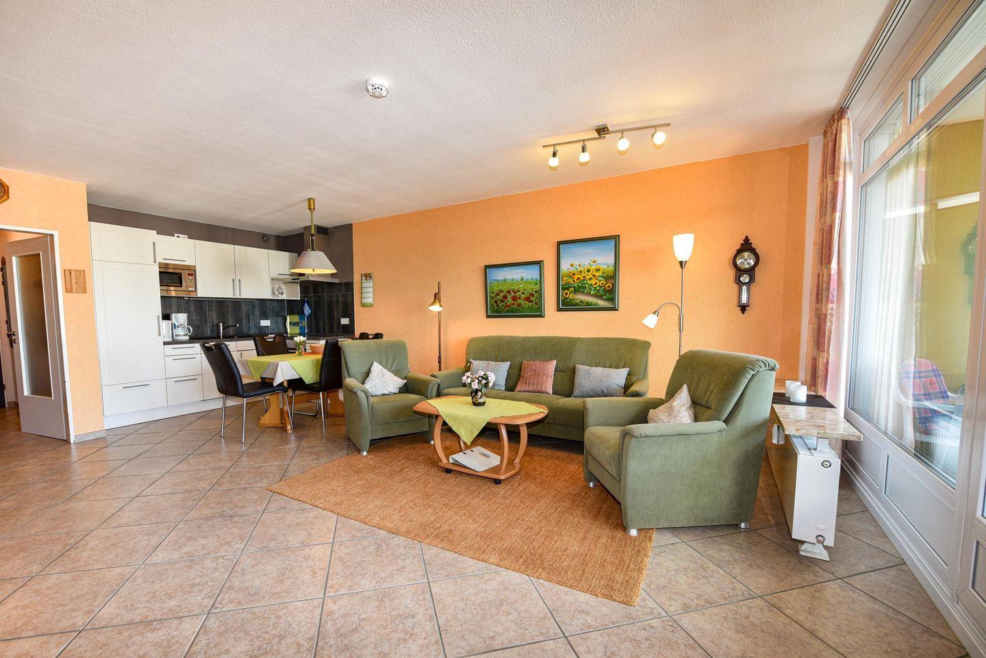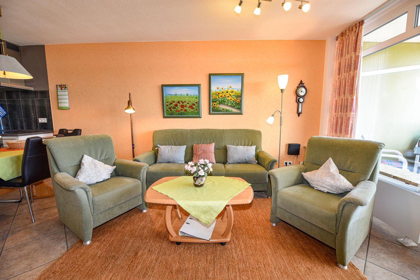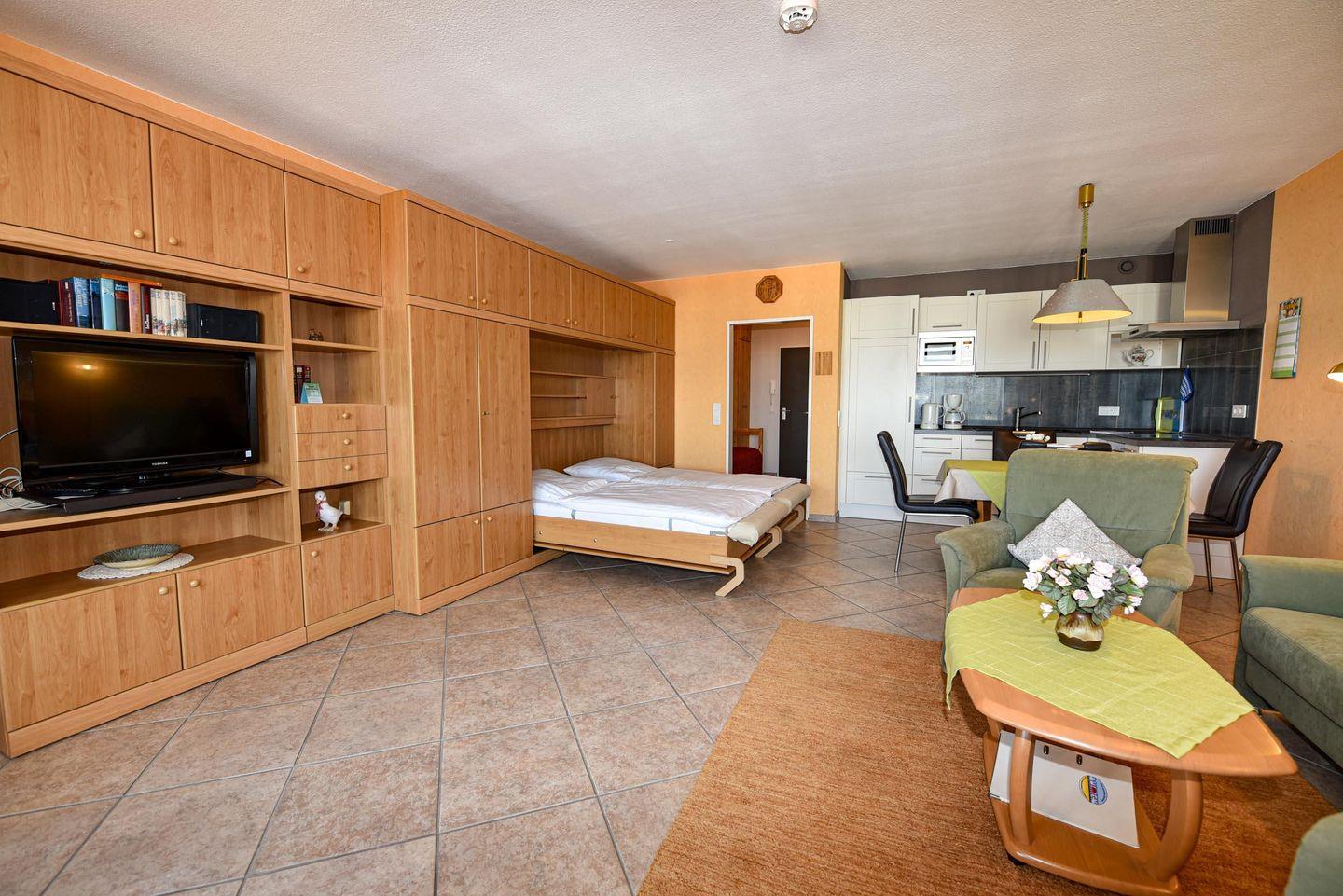 Die Wohnung ist aufgeteilt in einen Wohn-/Schlafraum mit 2 Schrankklappbetten und Küchenzeile mit Kühlschrank, Kaffeemaschine, Wasserkocher, Toaster, E-Herd mit Cerankochfeld, Mikrowelle; Flachbildfernseher und Radio sind vorhanden; Bad mit Dusche und WC; Balkon. Pkw-Tiefgaragenstellplatz.