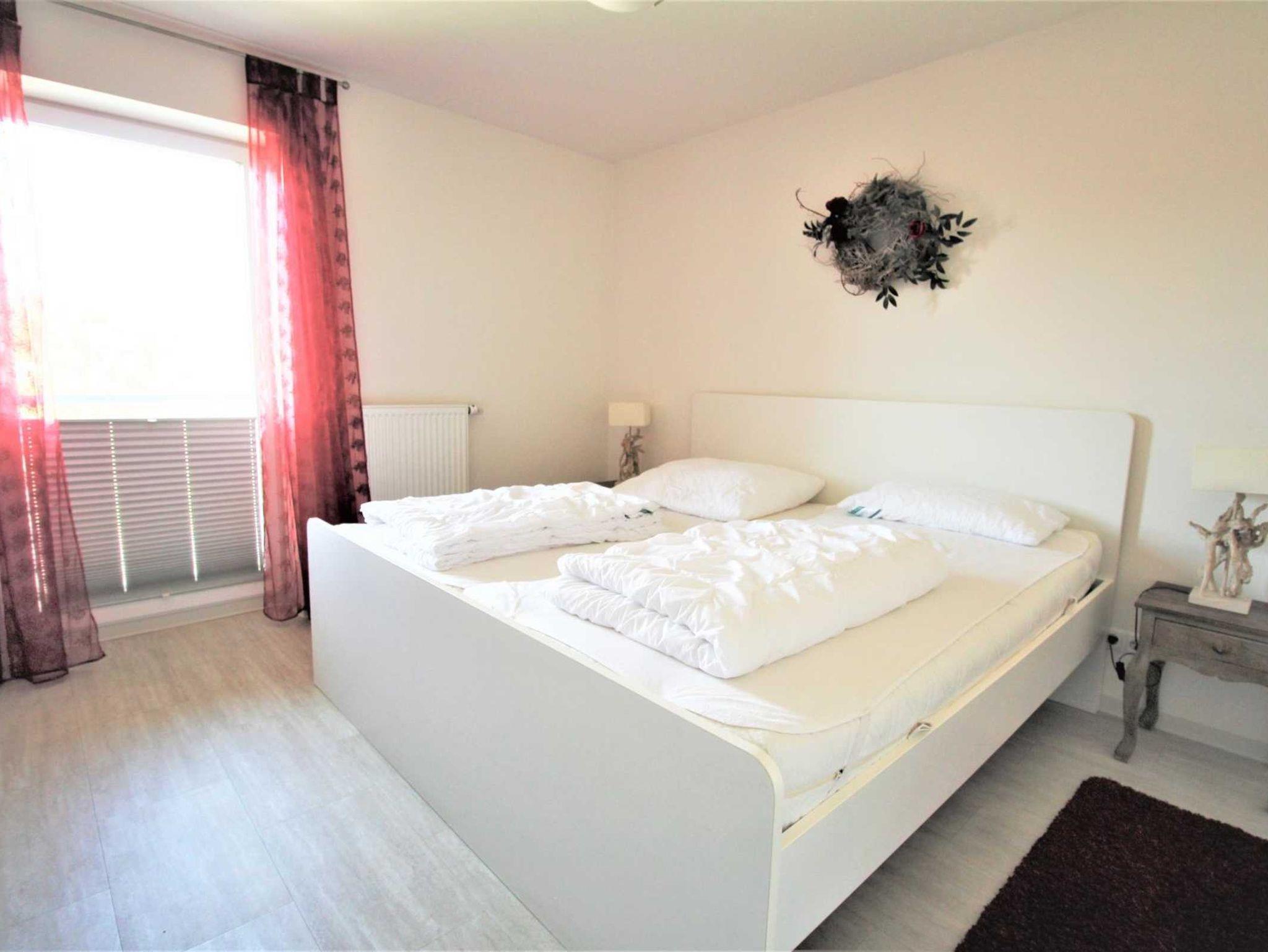 Das Schlafzimmer ist mit einem 200 cm x 200 cm großen Bett ausgestattet, von dem Sie gleich nach dem Aufwachen einen kleinen feinen Blick auf das Wattenmeer genießen. Die Einrichtung ist vom Tischler gefertigt, modern u. romantisch: