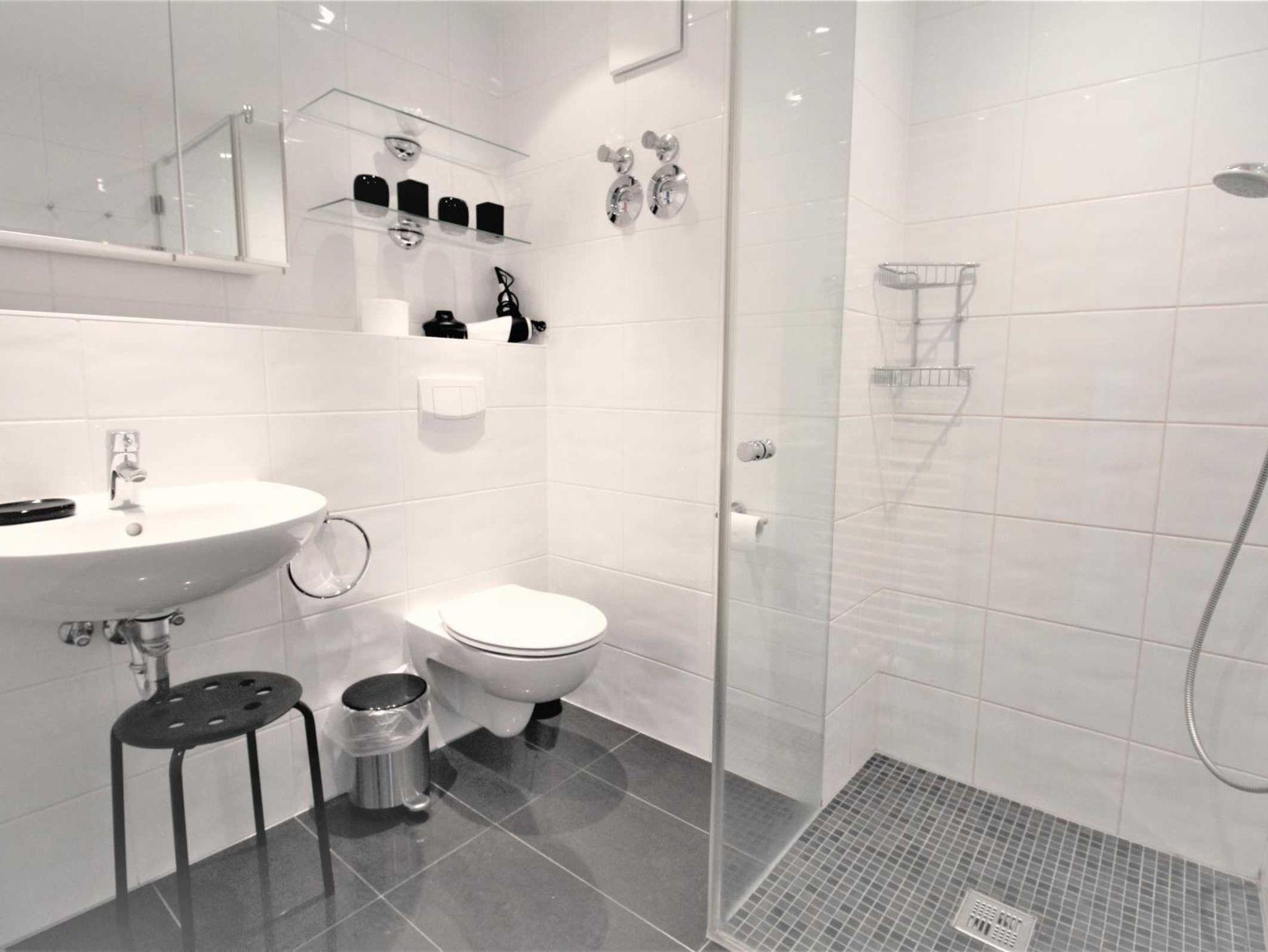 Im stilvollen Bad gibt es eine bodengleiche, barrierefreie Dusche mit Glastrennwand und rutschfesten Mosaikfliesen.