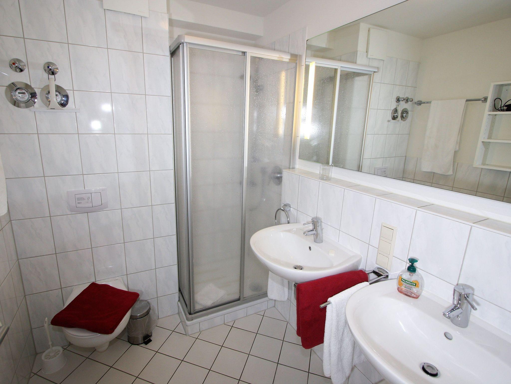 Unser Badezimmer hat eine Dusche mit extra flacher Duschtasse. Ein separates Gäste?WC mit großem Waschbecken sorgt dafür, dass es auch bei Vollbelegung der Wohnung nicht zu Engpässen kommt.