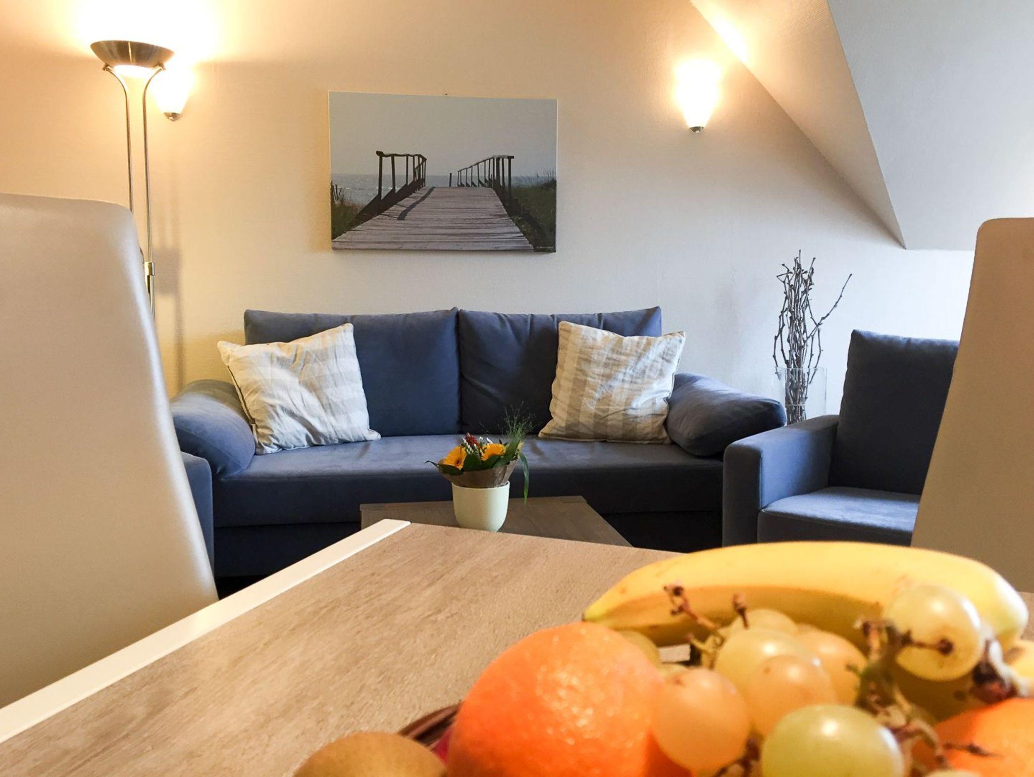 Sie wohnen in einem 2-Zimmer-Appartement für bis zu 4 Personen auf ca. 46 m² im Dachgeschoss. Ein Schlafzimmer mit Doppelbett mit SAT-Flachbild-TV, , Wohn-/Schlafraum mit bequemer Doppelbettcouch, SAT-Flachbild-TV, Laptop und kostenfreien WLAN-Zugang, separater Essplatz, voll ausgestatteter Küchenbereich, Dusche/WC mit Föhn, Balkon und Telefon. PKW-Stellplatz in der Tiefgarage.