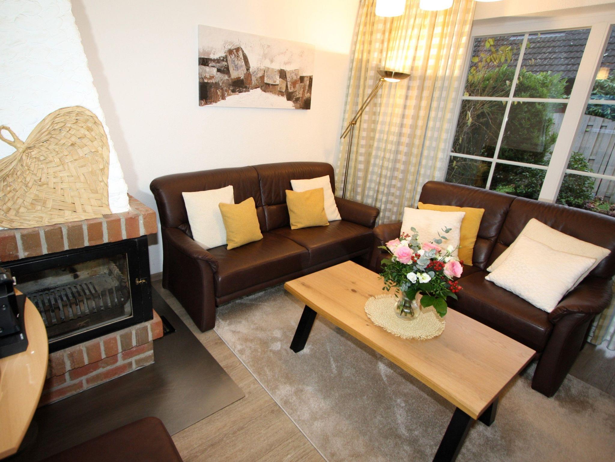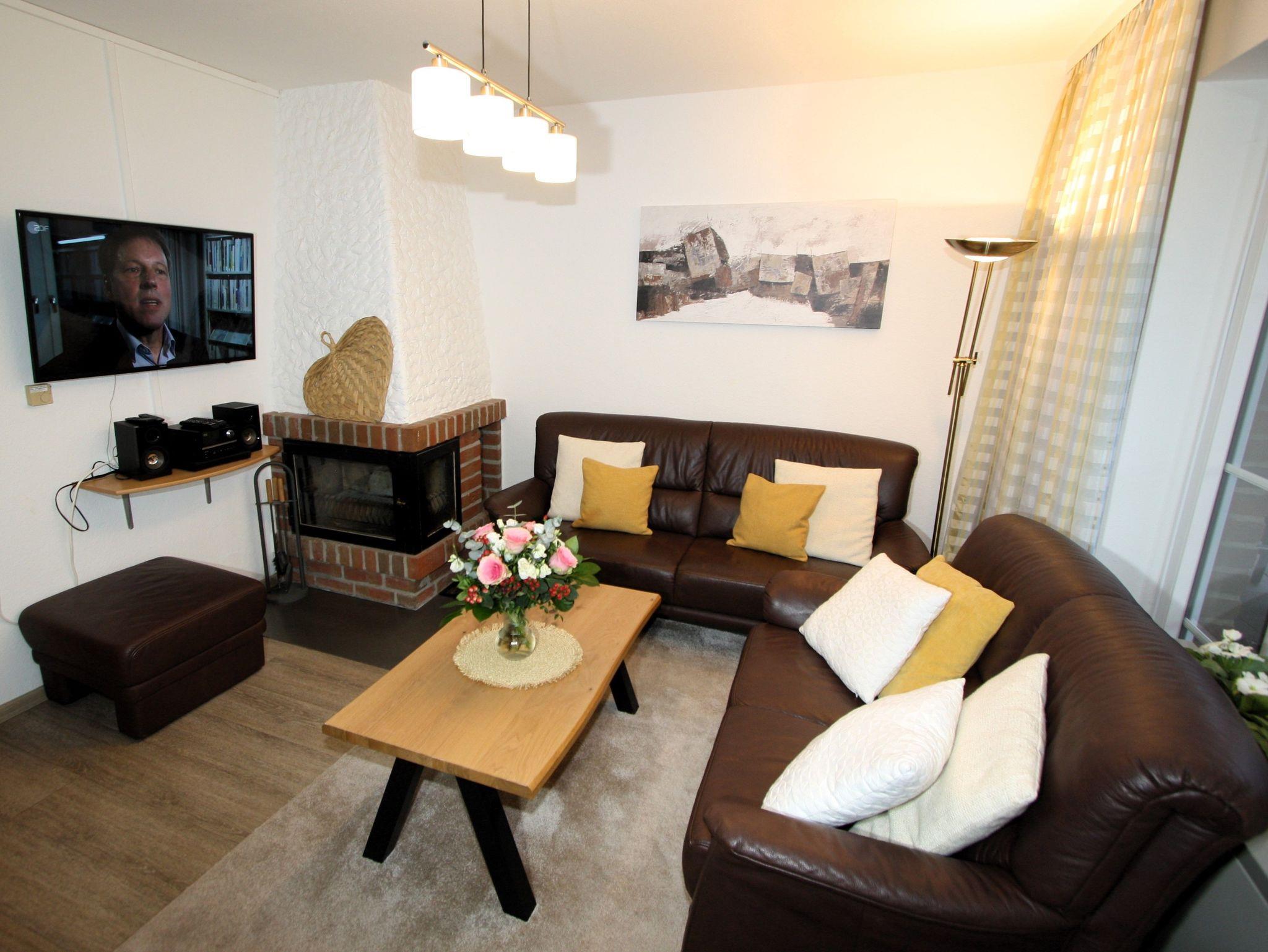 Der Wohnbereich hat einen gemauerten Kamin mit Heizeinsatz, eine Ledergarnitur, Flachbild Fernsehgerät mit SAT TV, eine Stereoanlage mit CD-Wechsler u. DVD Player.