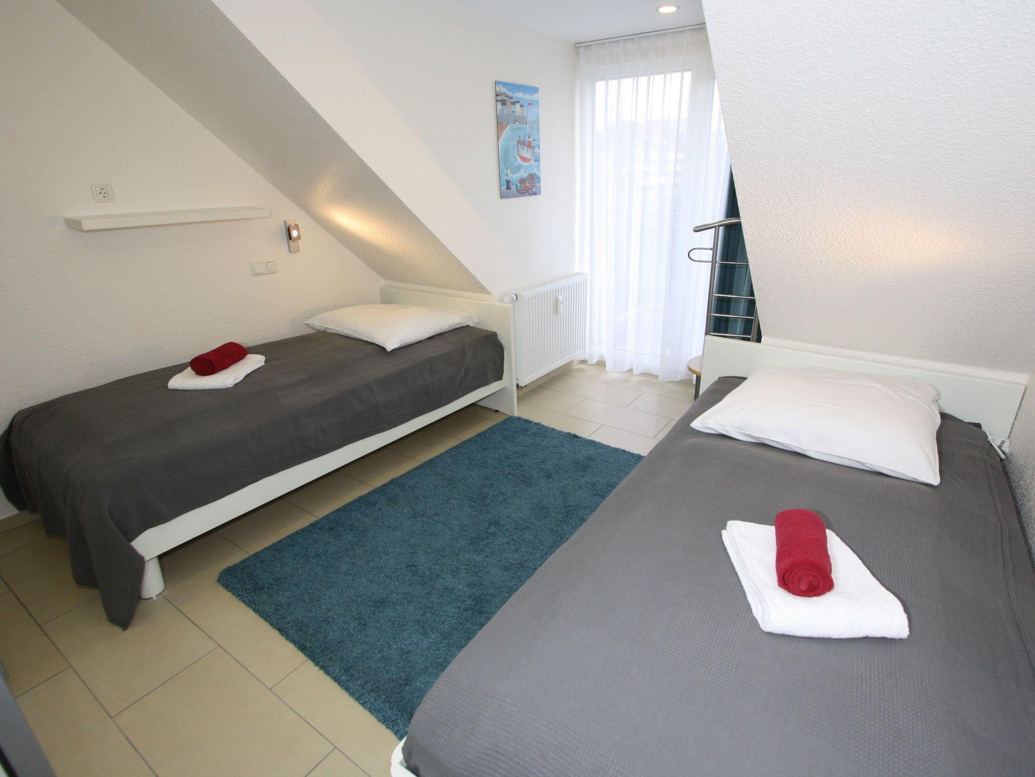 3-Zimmer-Appartement für bis zu 4 Personen auf ca. 5 m². Zwei Schlafzimmer mit Doppelbett bzw. Einzelbetten, Wohnraum mit Couch, TV, separatem Essplatz, voll ausgestattetem Küchenbereich, Balkon, Bad mit Dusche/WC. WLAN und PKW-Stellplatz vorhanden.