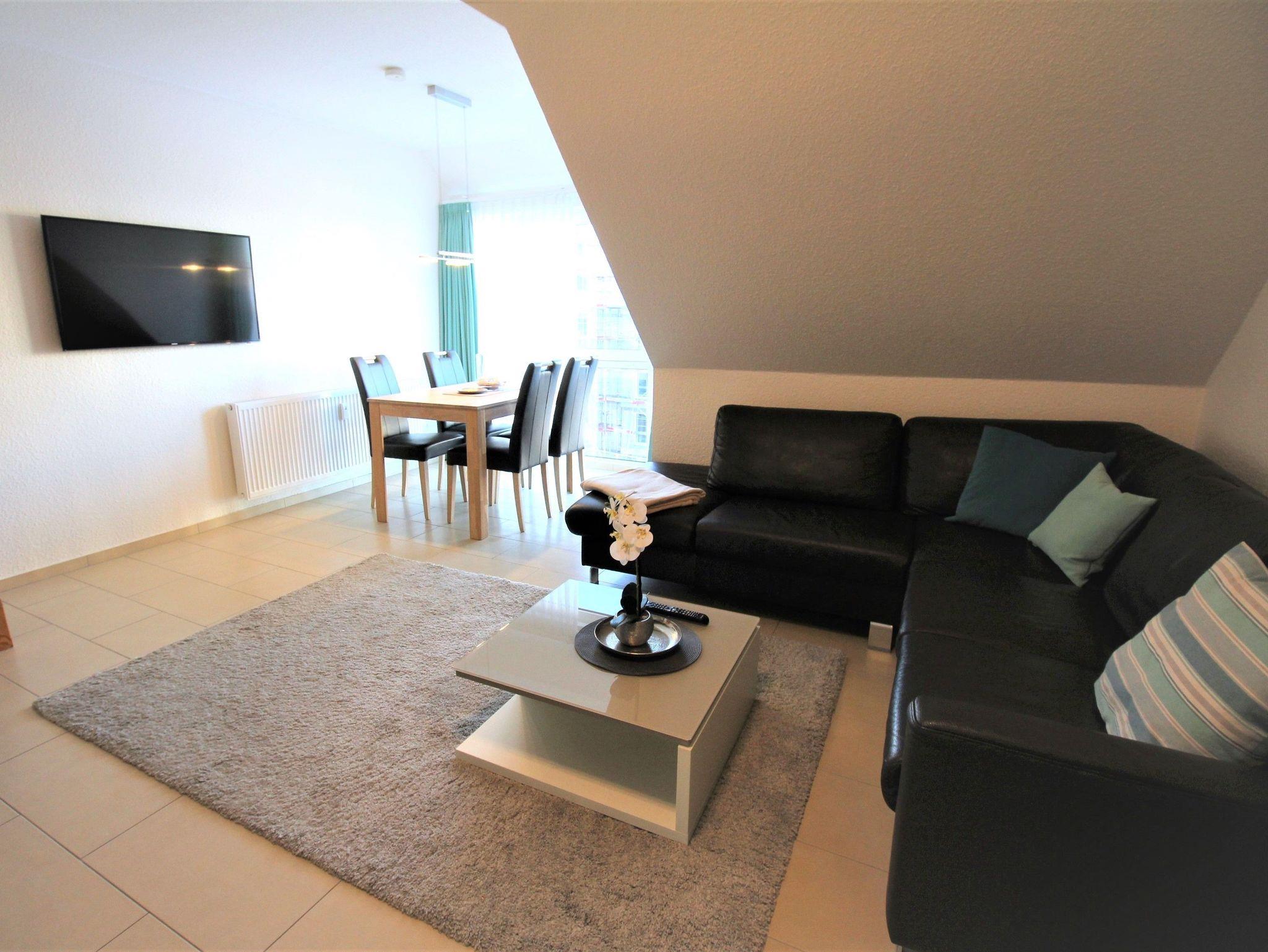 Im offenen Wohnraum befindet sich eine bequeme Couchgarnitur mit Blick auf einen Smart-TV. Zudem steht Ihnen ein kostenloser Internetzugang unbegrenzt zur Verfügung. Von dem separaten Essbereich aus können Sie durch die große, bodentiefe Fensterfront den seitlichen Blick auf die Nordsee genießen.