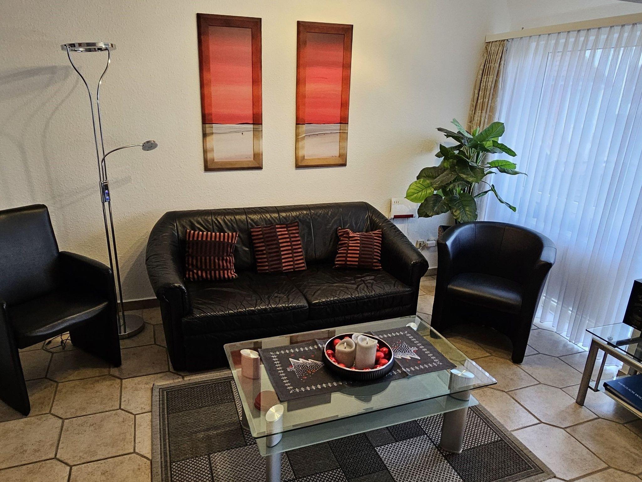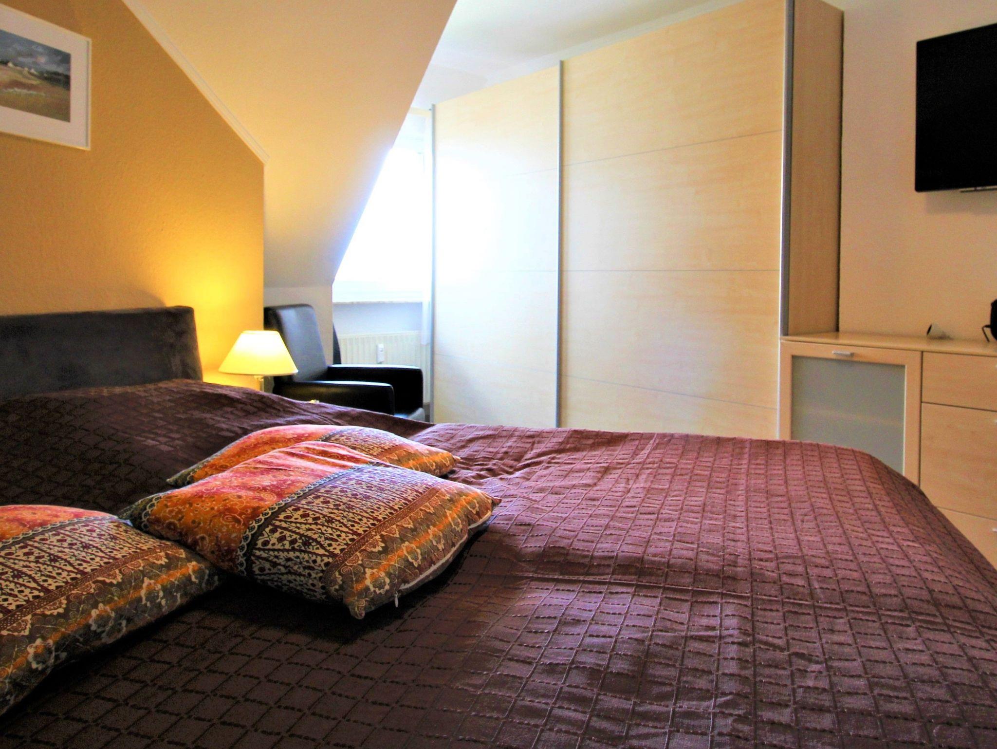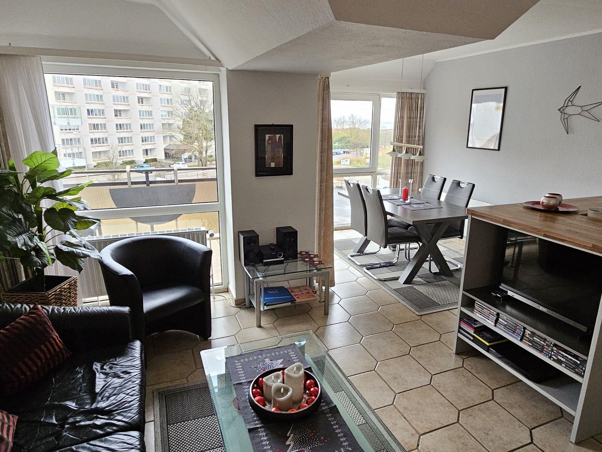 3-Zimmer-Appartement für bis zu 4 Personen auf ca. 70 m². Zwei Schlafräume mit Doppelbett oder Einizelbetten. Wohnraum mit Couch, TV, separatem Essplatz, Küchenbereich, Balkon. Bad mit Dusche/WC. PKW-Stellplatz vorhanden.