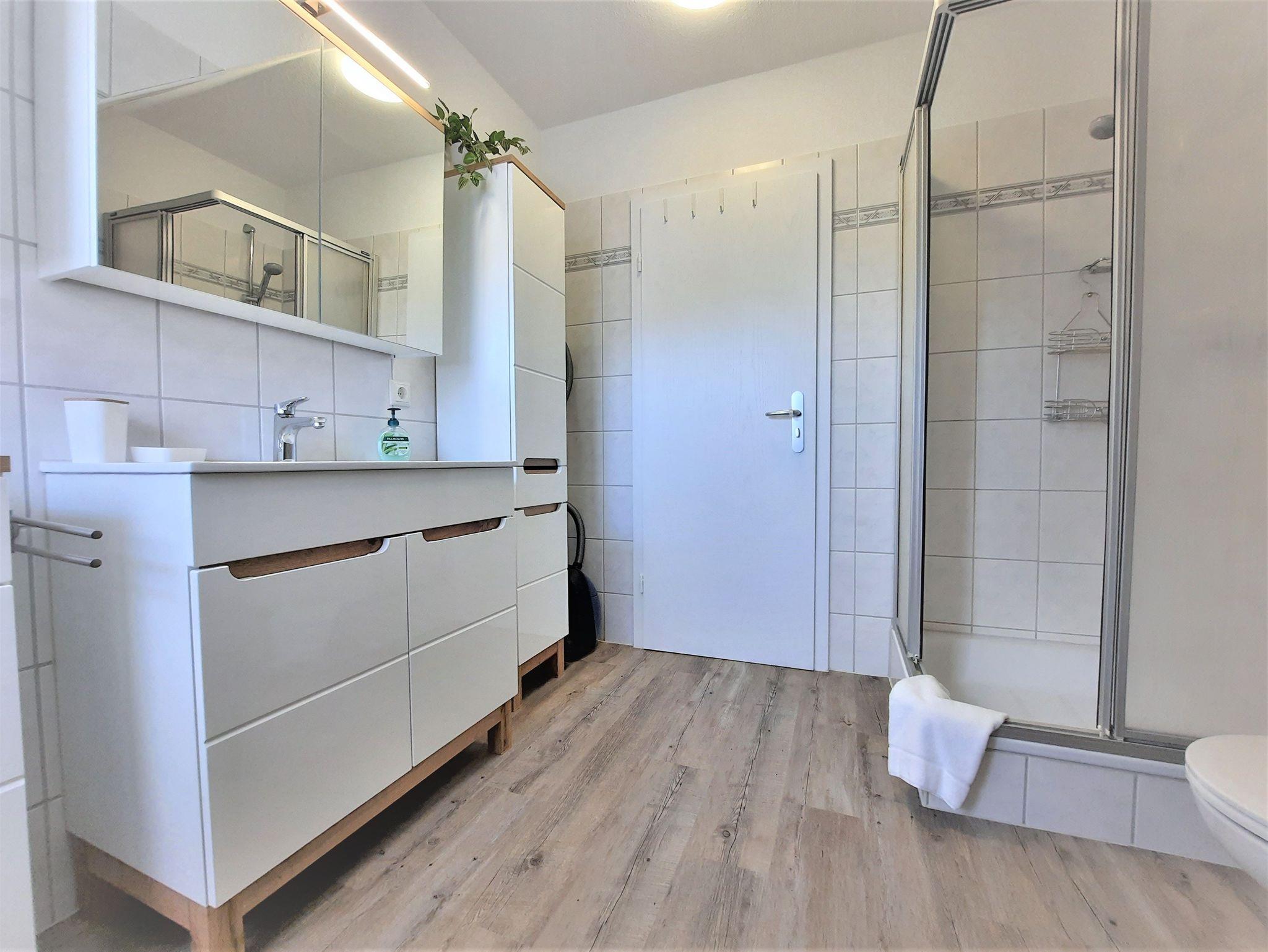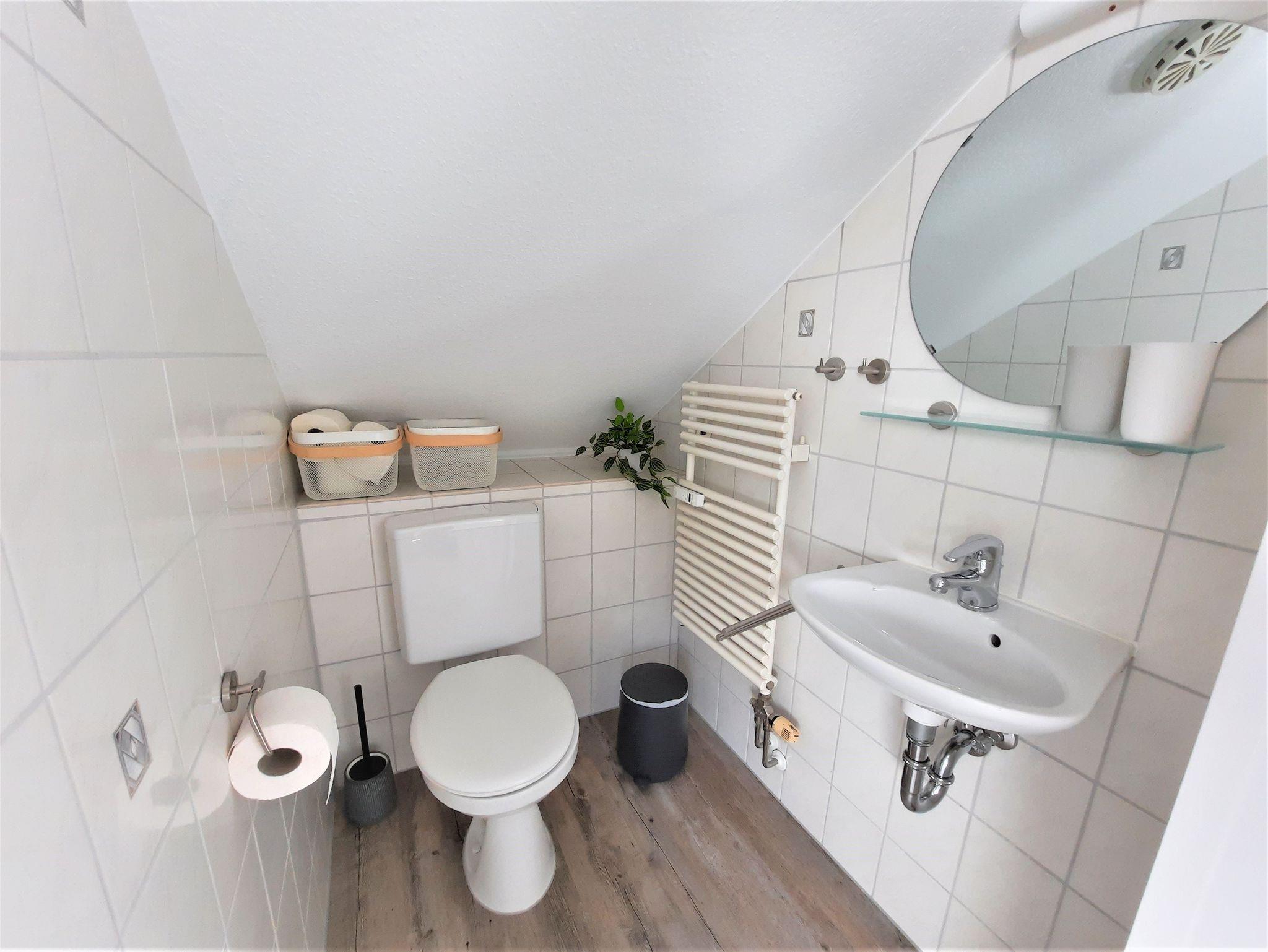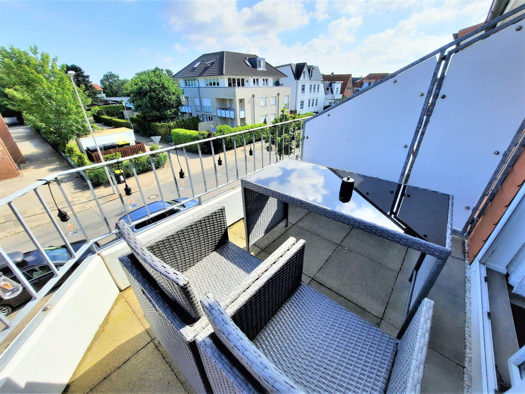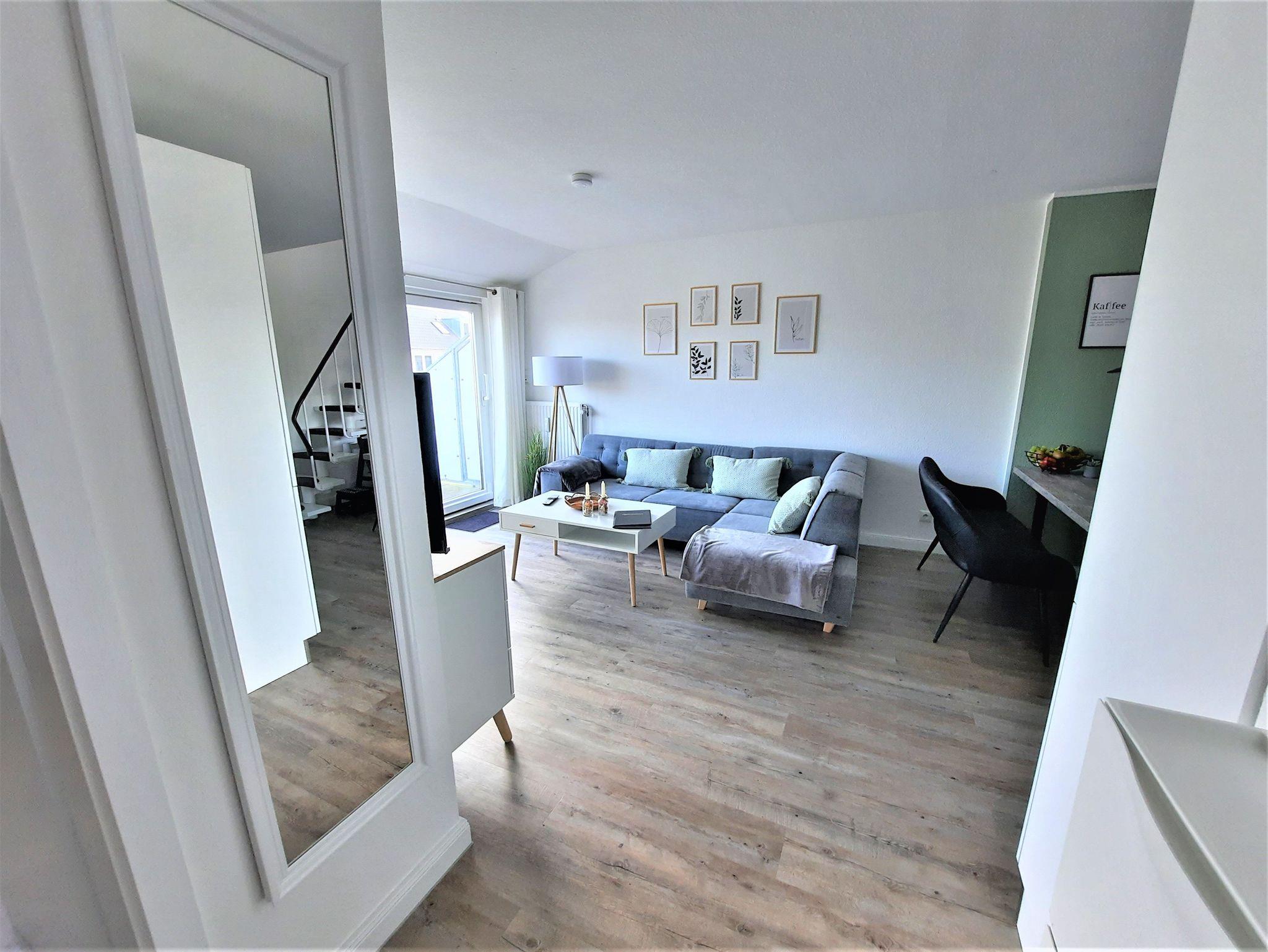 Sie wohnen in einem modernen 2,5-Zimmer-Appartement für bis zu 4 Personen auf 40 m² Wohnfläche im 2. OG. Ein Schlafzimmer mit Doppelbett, ein Schlafzimmer mit zwei Einzelbetten (2. Schlafzimmer ist ein Durchgangszimmer zum Elternschlafzimmer und offen zum Wohnzimmer - aber mit Kindersicherung vor dem Treppenabgang), beide Schlafräume befinden sich im Dachbereich, haben eine geringe Deckenhöhe und sind über eine halb gewendelte Treppe vom Wohnraum aus zu erreichen, ein zusätzliches WC ist im Dachbereich vorhanden. Wohnraum, separater Essplatz und voll ausgestatteter Küchenbereich mit Geschirrspüler und Mikrowelle, Dusche/WC, Balkon, TV, Stereoanlage und WLAN. Ein Kinderreisebett und ein Kinderhochstuhl wird kostenfrei gestellt.