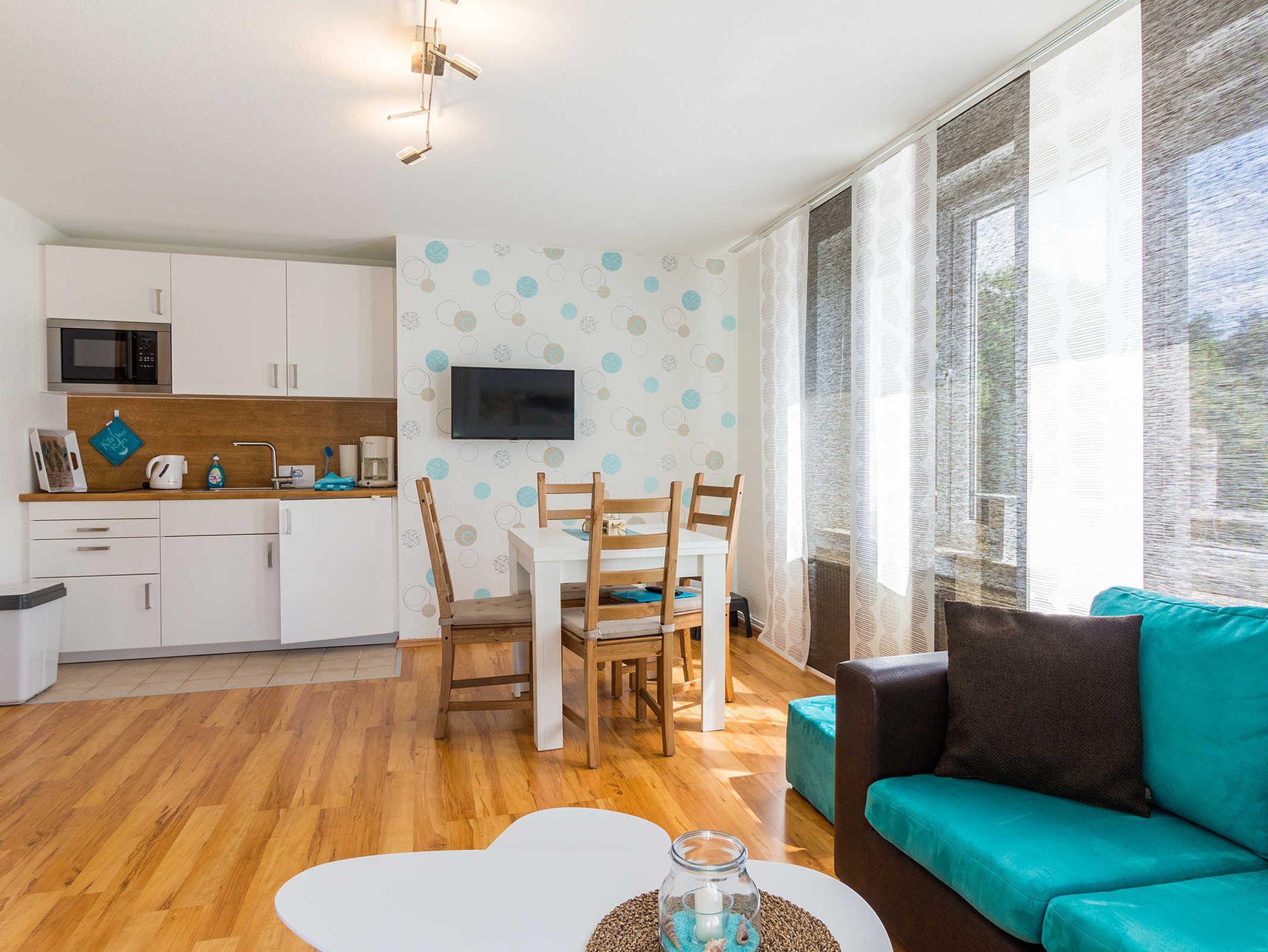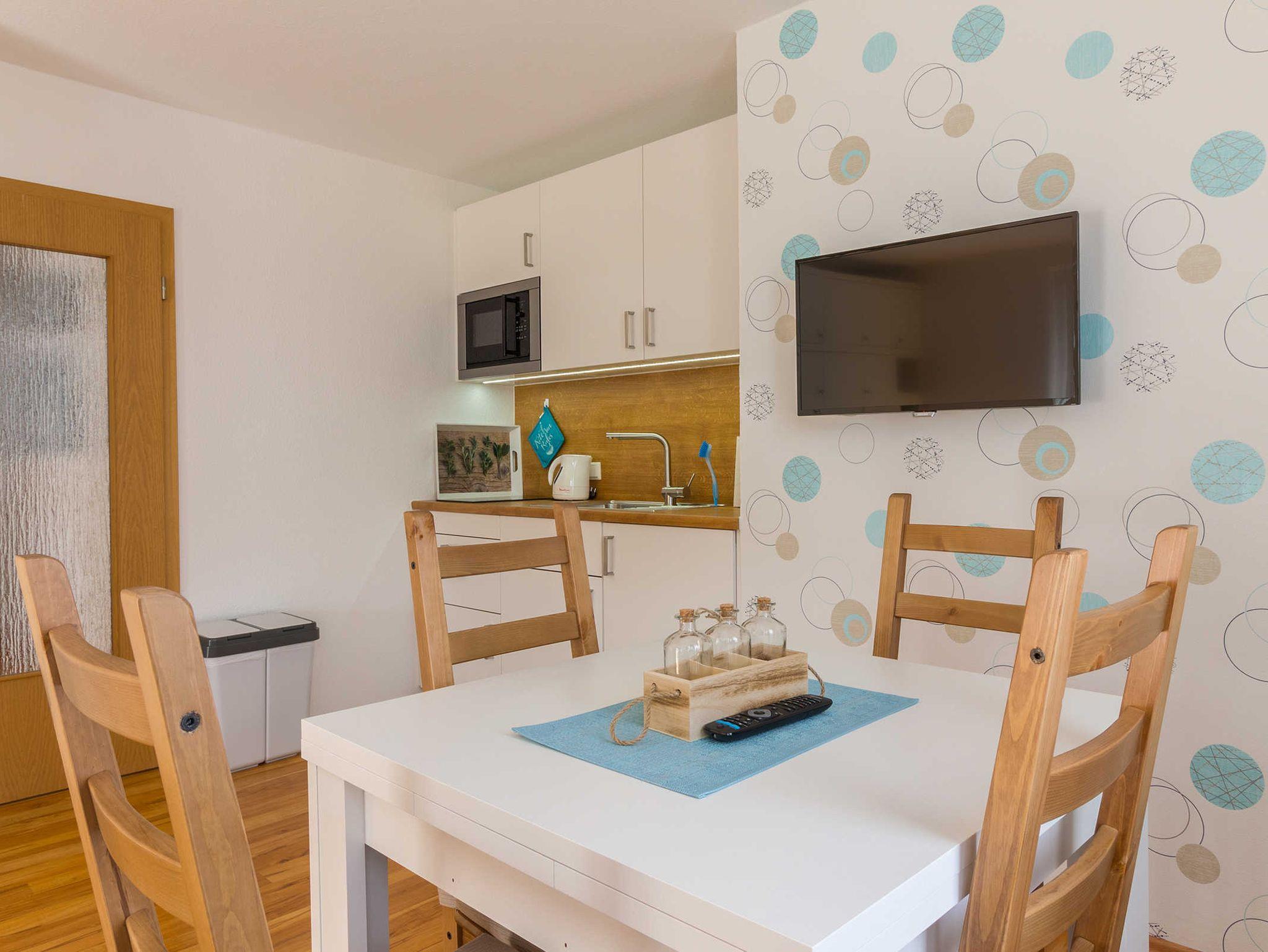 Ein Flachbildschirm mit Kabel TV sowie kostenloses WLAN mit schneller Internetanbindung steht Ihnen zur Verfügung. Die im Wohn - Schlafraum integrierte Küchenzeile ist mit einem großen Kühlschrank mit Gefrierfach sowie einer Mikrowelle und einem Induktionskochfeld ausgestattet. Außerdem finden Sie in der Küche alles, was für eine unbeschwerte Zeit nötig ist.