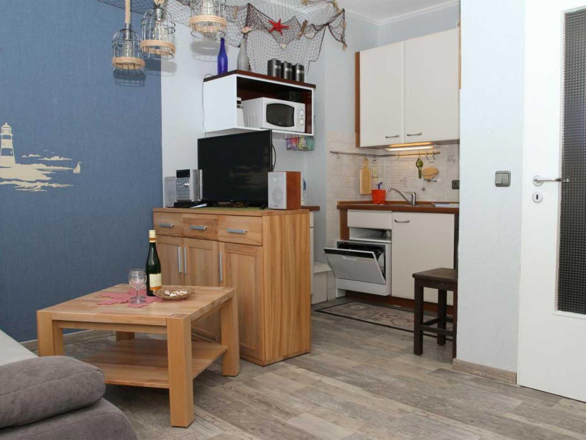 Der Wohnraum ist mit einer gemütlicher Schlafcouch, einem LED?TV (SAT) mit integriertem DVD-Player sowie einer kleinen DVD Auswahl und einem separatem Essplatz eingerichtet. Die voll ausgestattete Küche verfügt über einen Backofen, einen Herd, einen Kühlschrank mit Gefrierfach, eine Mikrowelle und eine kleine Geschirrspülmaschine. Der separate Schlafraum wird vom Wohnzimmer mittels eines offenen Durchganges erreicht. Beim Schlafzimmer haben wir uns für ein großes Doppelbett mit 180 cm x 200 cm Liegefläche entschieden. Ein Duschbad mit WC rundet die Wohnung ab.