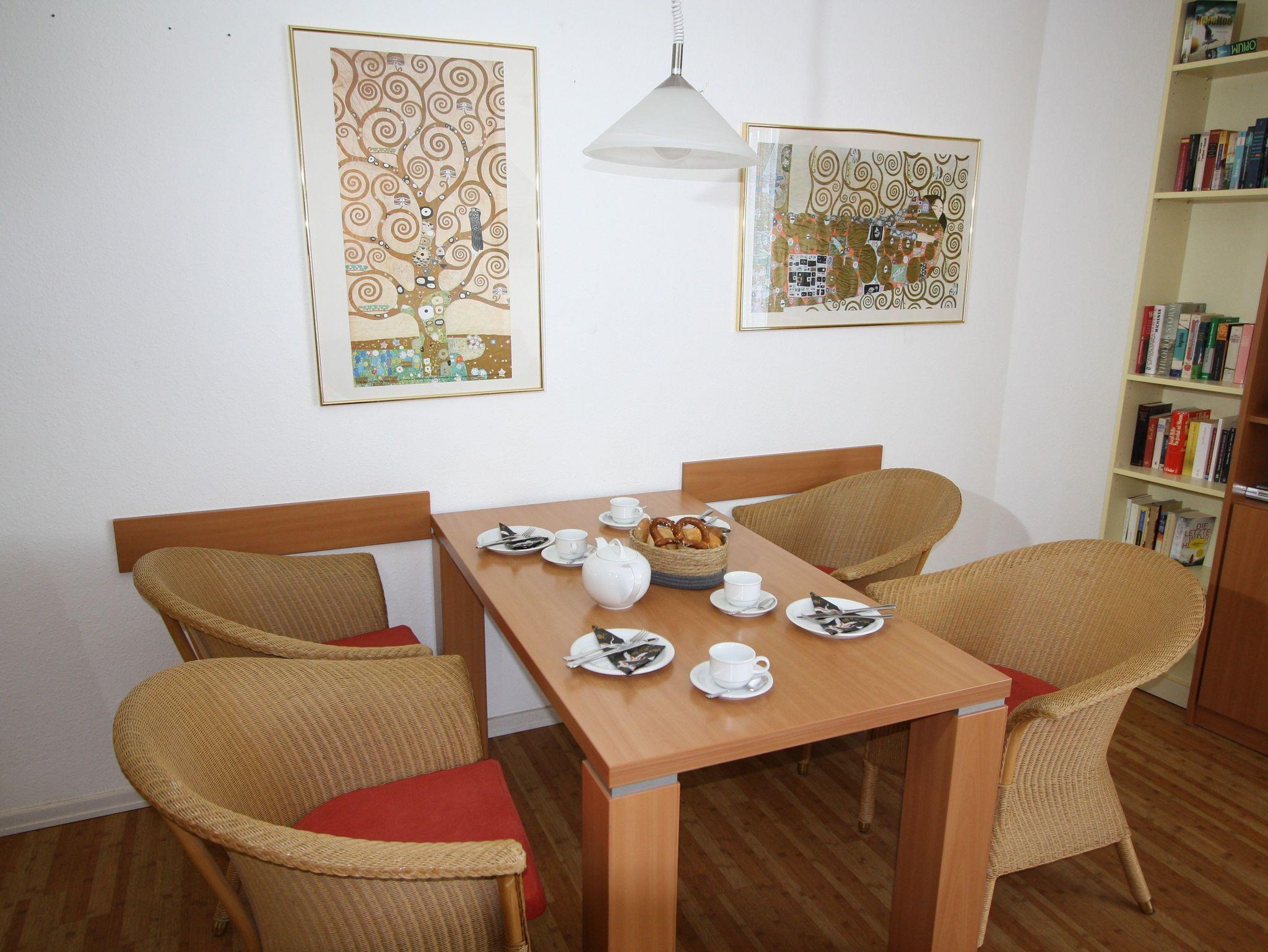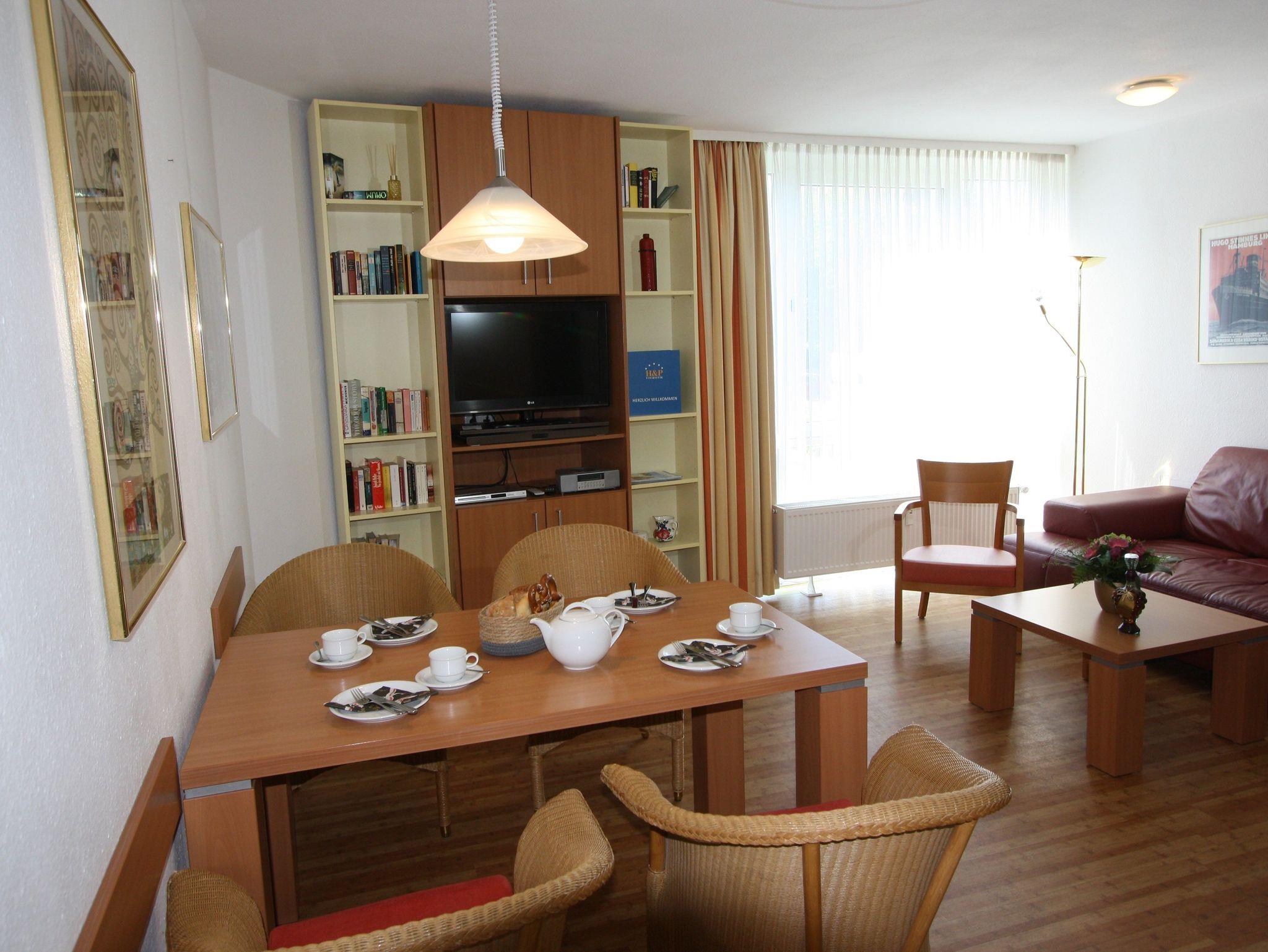 Zusätzlich zur üblichen Unterhaltungselektronik (SAT-TV, Radio-CD-Player, DVD-Player) steht Literatur im Bücherschrank bereit.