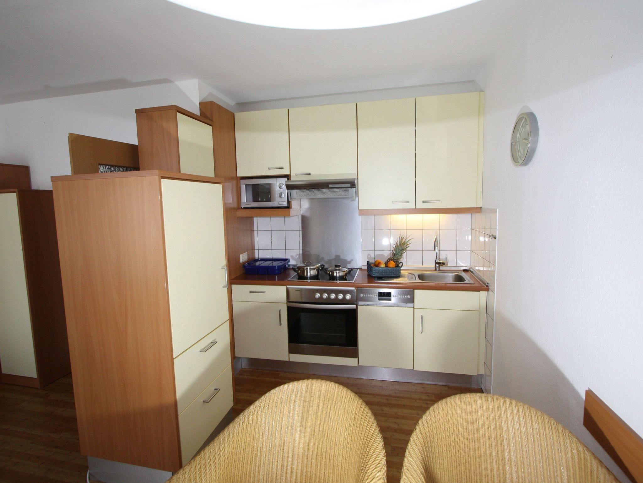 Zum Wohnraum gehört eine optisch abgetrennte, modern eingerichtete Küchenzeile mit Kaffeemaschine, Toaster, Herd, Backofen, Mikrowelle und Geschirrspüler. Die modernen Schränke bieten reichlich Stauraum. Neben der Küchenzeile befindet sich der Esstisch.