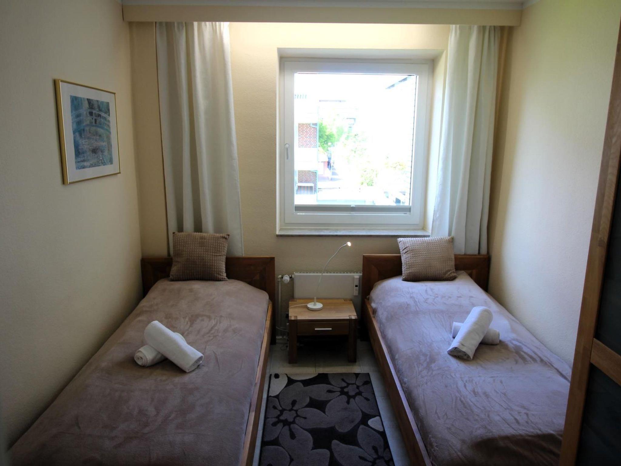 Die beiden Schlafzimmer sind über einen kleinen Flur erreichbar, das größere mit Doppelbett (180 cm x 200 cm), großem Kleiderschrank und internetfähigem Fernseher, das kleinere mit zwei Einzelbetten (90 cm x 200 cm), Schreibtisch und Kleiderschrank.