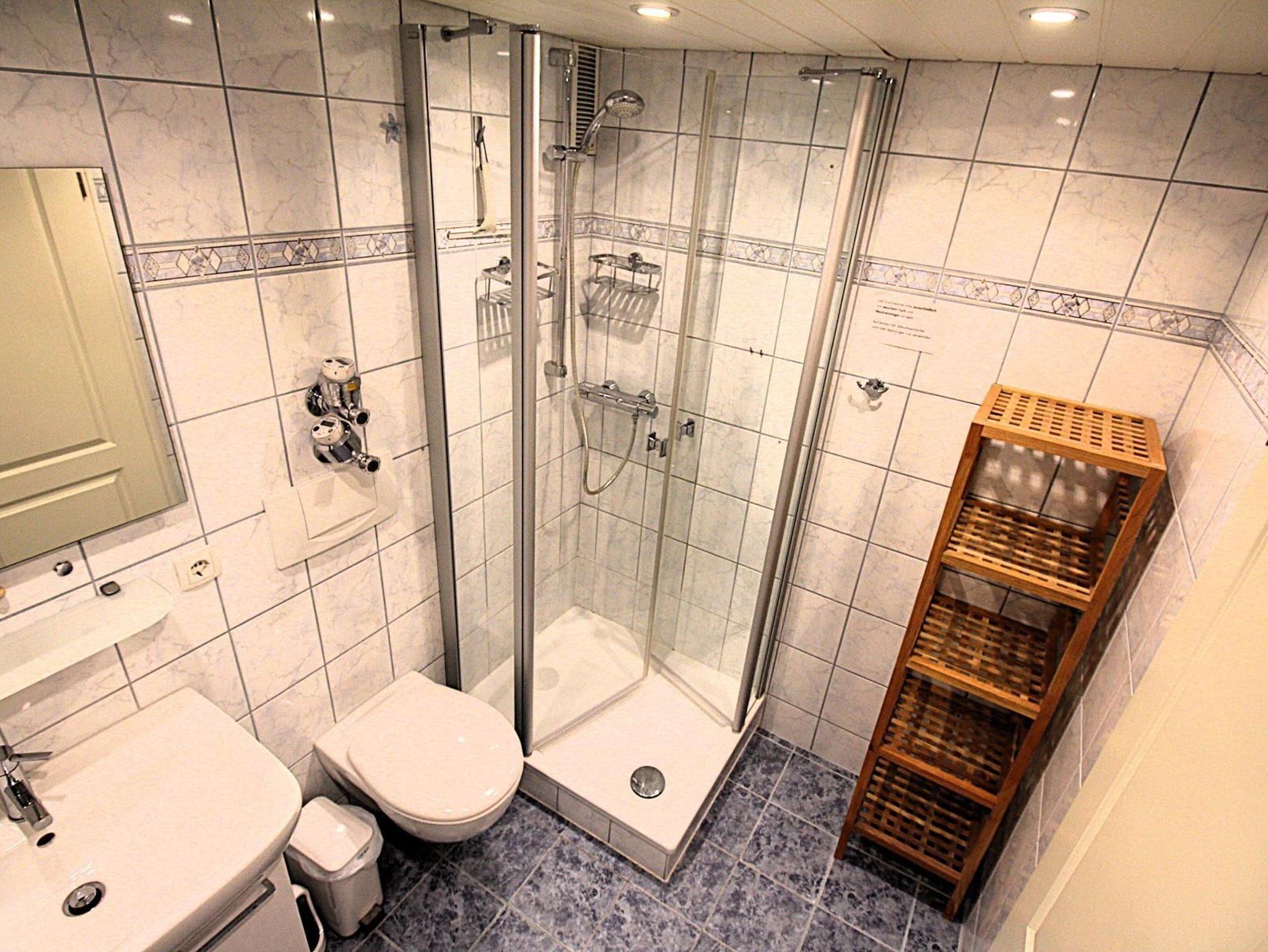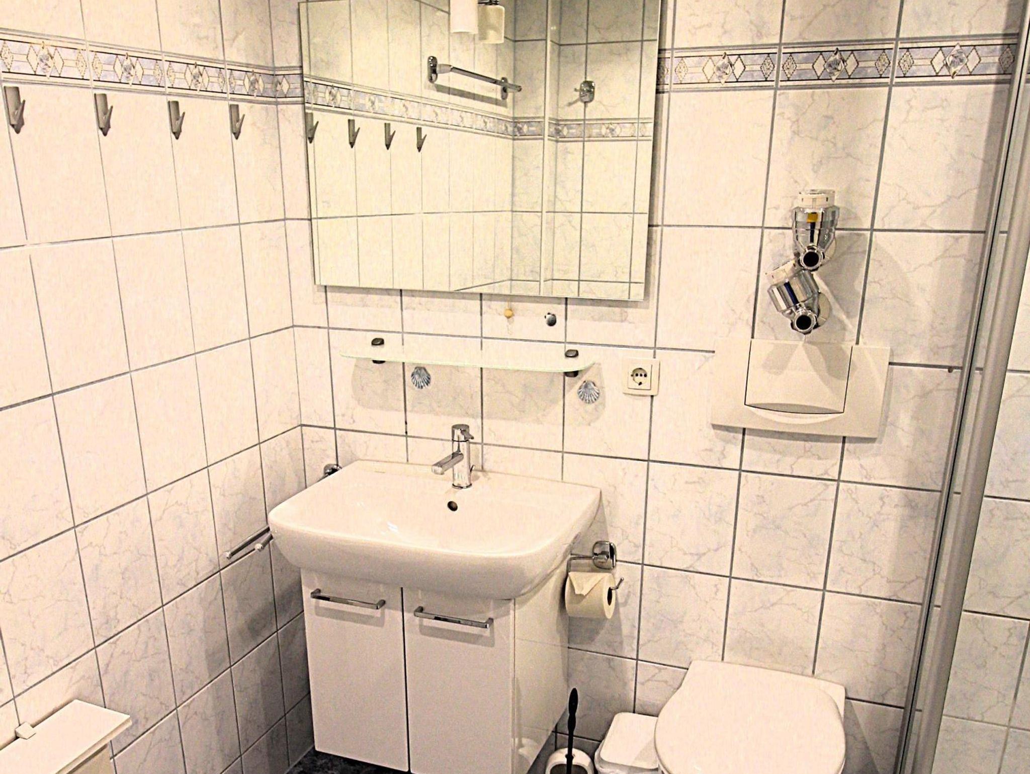 Das geräumige Badezimmer ist mit Dusche und WC ausgestattet.