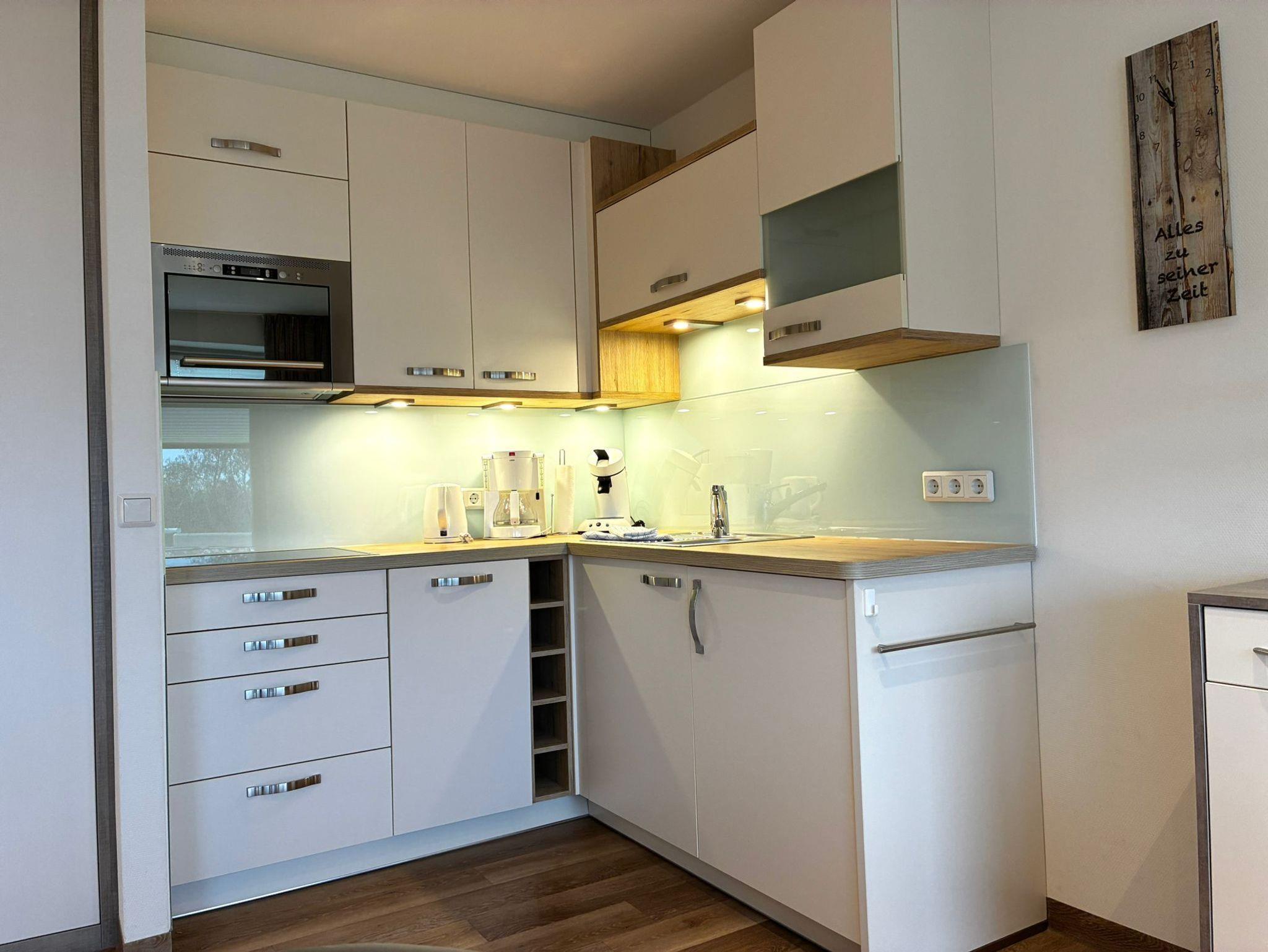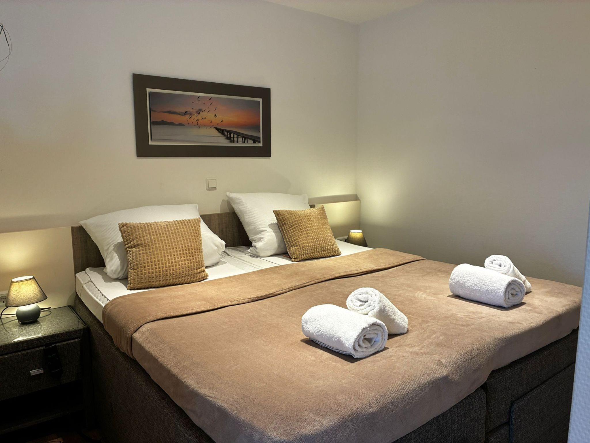 1-Zimmer-Appartement für bis zu 2 Personen, ca. 47 m². Wohn-/Schlafraum mit Schlafnische / Raumteiler und Doppelbett, separater Essplatz und voll ausgestatteter Küchenbereich mit Geschirrspüler und Mikrowelle, Dusche / WC, Balkon, Kabel-LED-TV. Blu-ray-Player, PKW-Stellplatz in der Tiefgarage, WLAN-Nutzung, Benutzung des Schwimmbades und der Saunen.