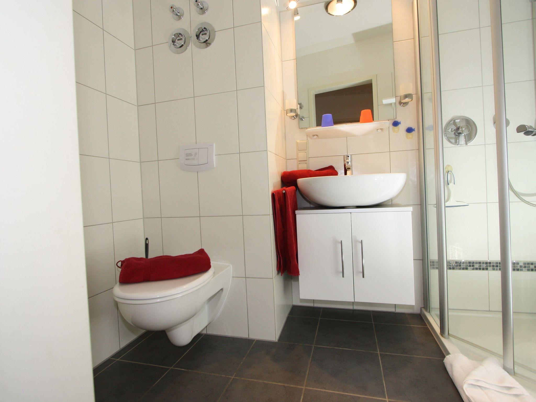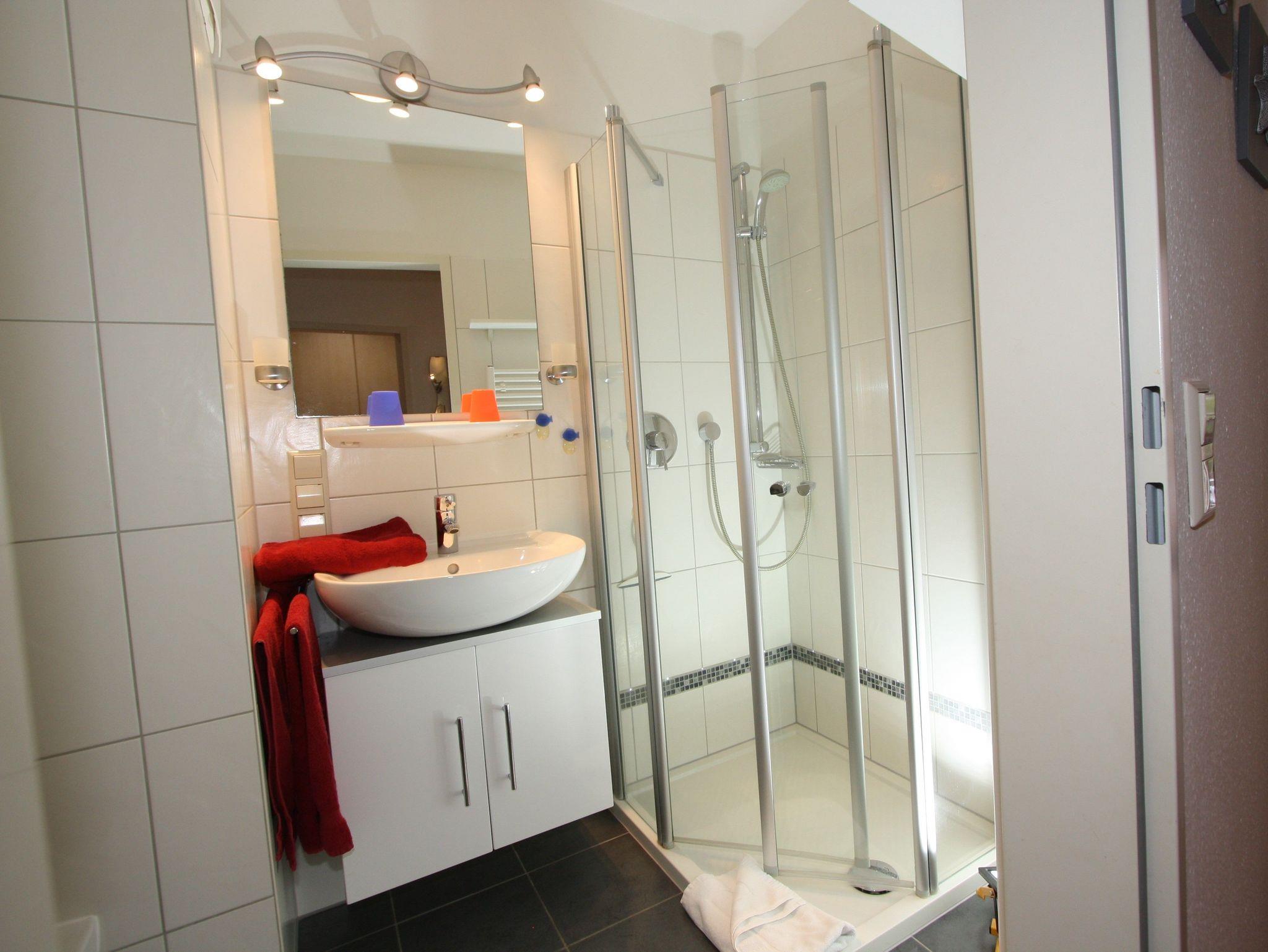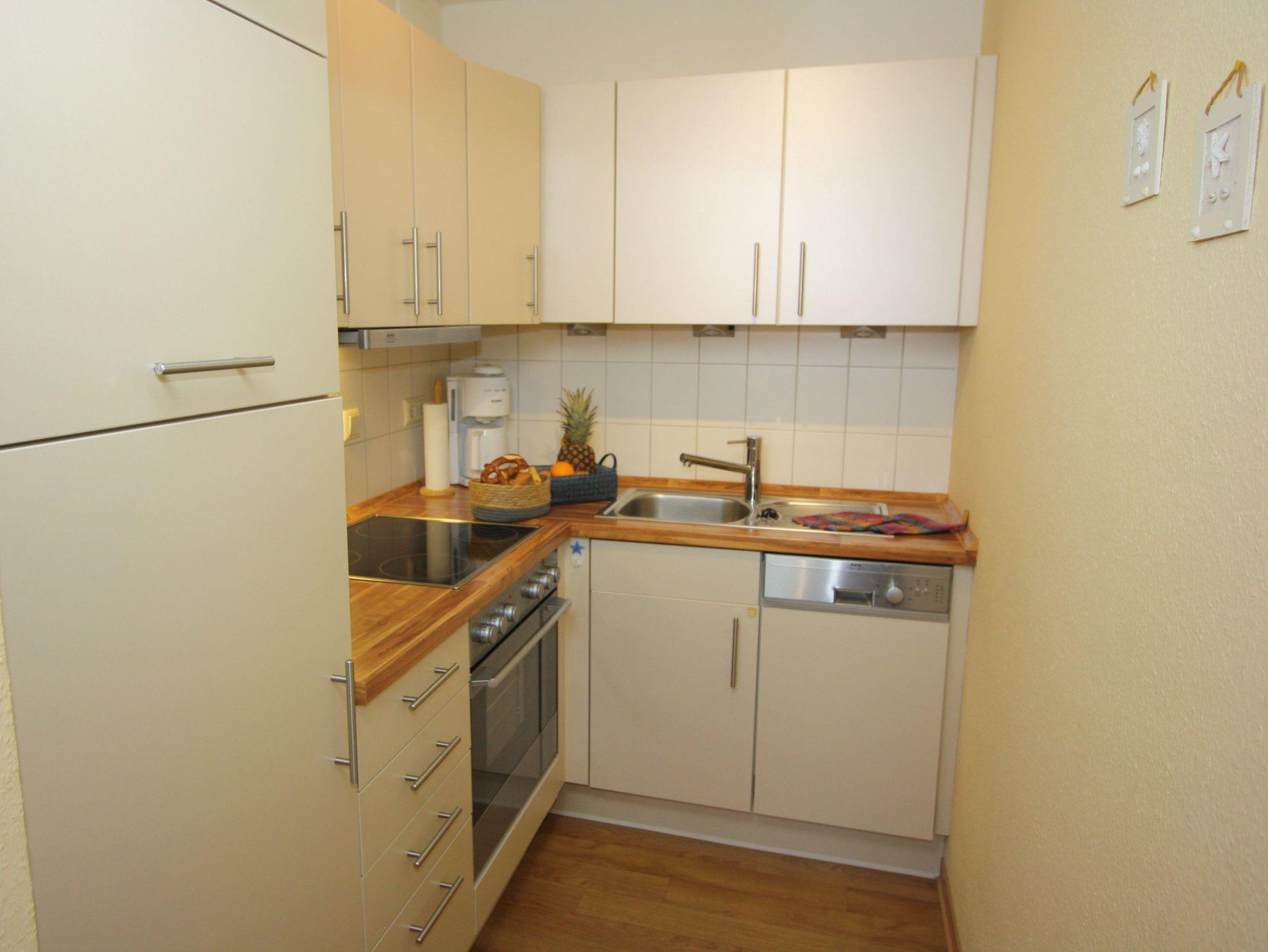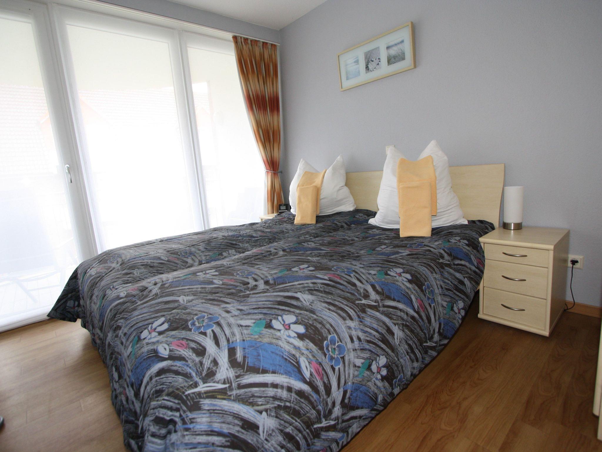 Die Wohnung (ca. 48m²) befindet sich im 1. OG und ist mit hochwertigen Möbeln modern und gemütlich eingerichtet. Sie bietet Platz für bis zu 4 Personen. Im Wohn-/Schlafraum befindet sich ein separater Essplatz sowie die bequeme Doppelbettcouch. Im Schlafzimmer finden Sie ein Doppelbett und einen großen Schrank für Ihre Urlaubsgarderobe. Die Küche ist komplett ausgestattet (auch für Kinder). Moderne Technik wie Geschirrspüler, Mikrowelle, E-Herd mit Ceranfeld und Backofen, Kühlschrank mit Gefrierfach erleichtern die Arbeit ebenso, wie Kaffeemaschine, SENSEO Kaffeepadmaschine, TASSIMO Kapselmaschine, Toaster, Wasser- und Eierkocher.