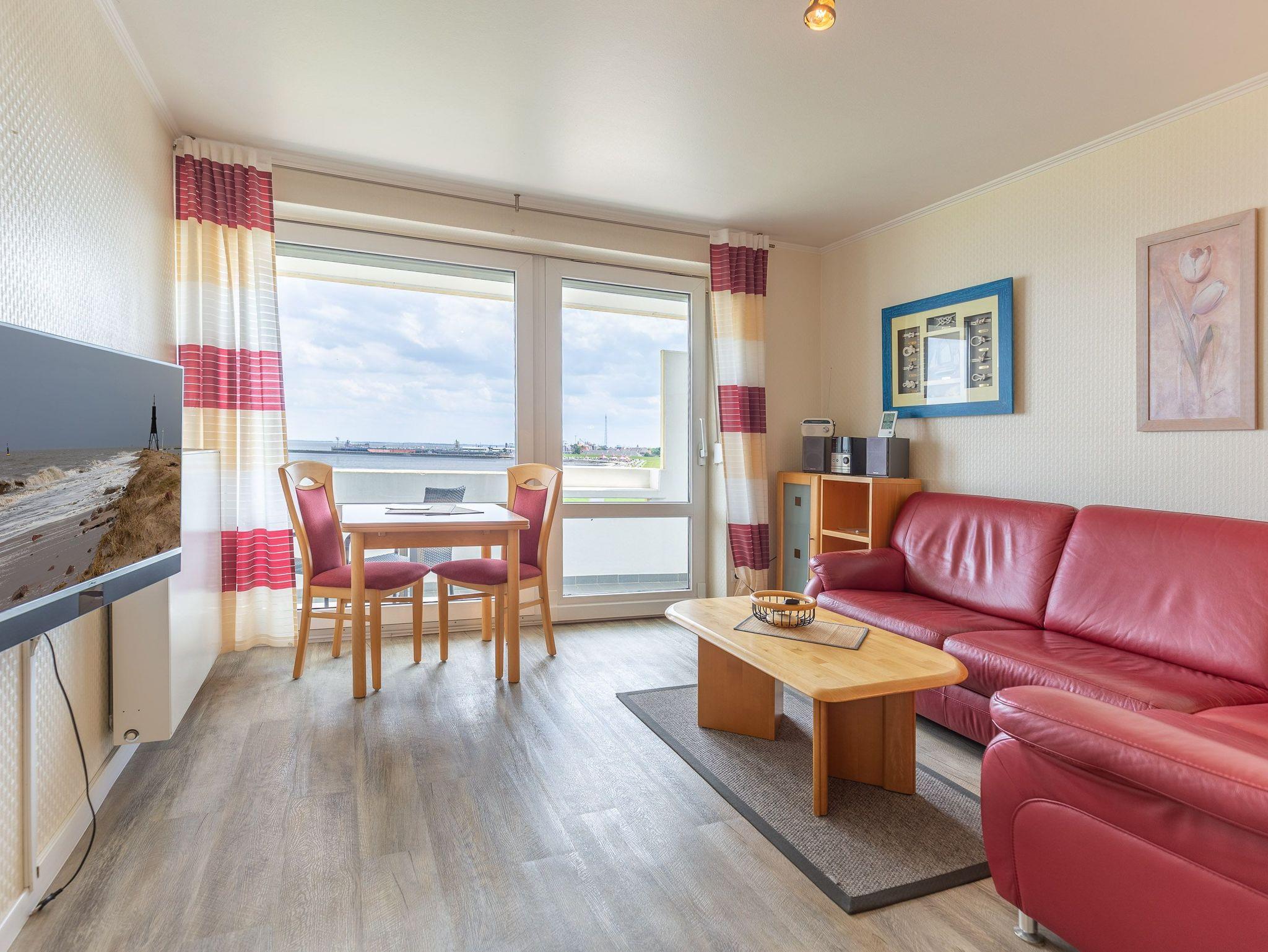 Im kombinierten Wohn- und Essbereich ist eine funktionale Küchenzeile mit Kühlschrank, Gefrierfach, Geschirrspüler und Mikrowelle integriert. Dank Flachbildfernseher müssen Sie auch im Urlaub nicht auf einen entspannten Fernsehabend verzichten. Der Balkon ist eine wahre Freiluft-Nordseeloge und erstreckt sich über die gesamte Fläche des Wohn- und Schlafzimmers. Selbstverständlich genießen Sie auch vom Balkon den traumhaften Meerblick.