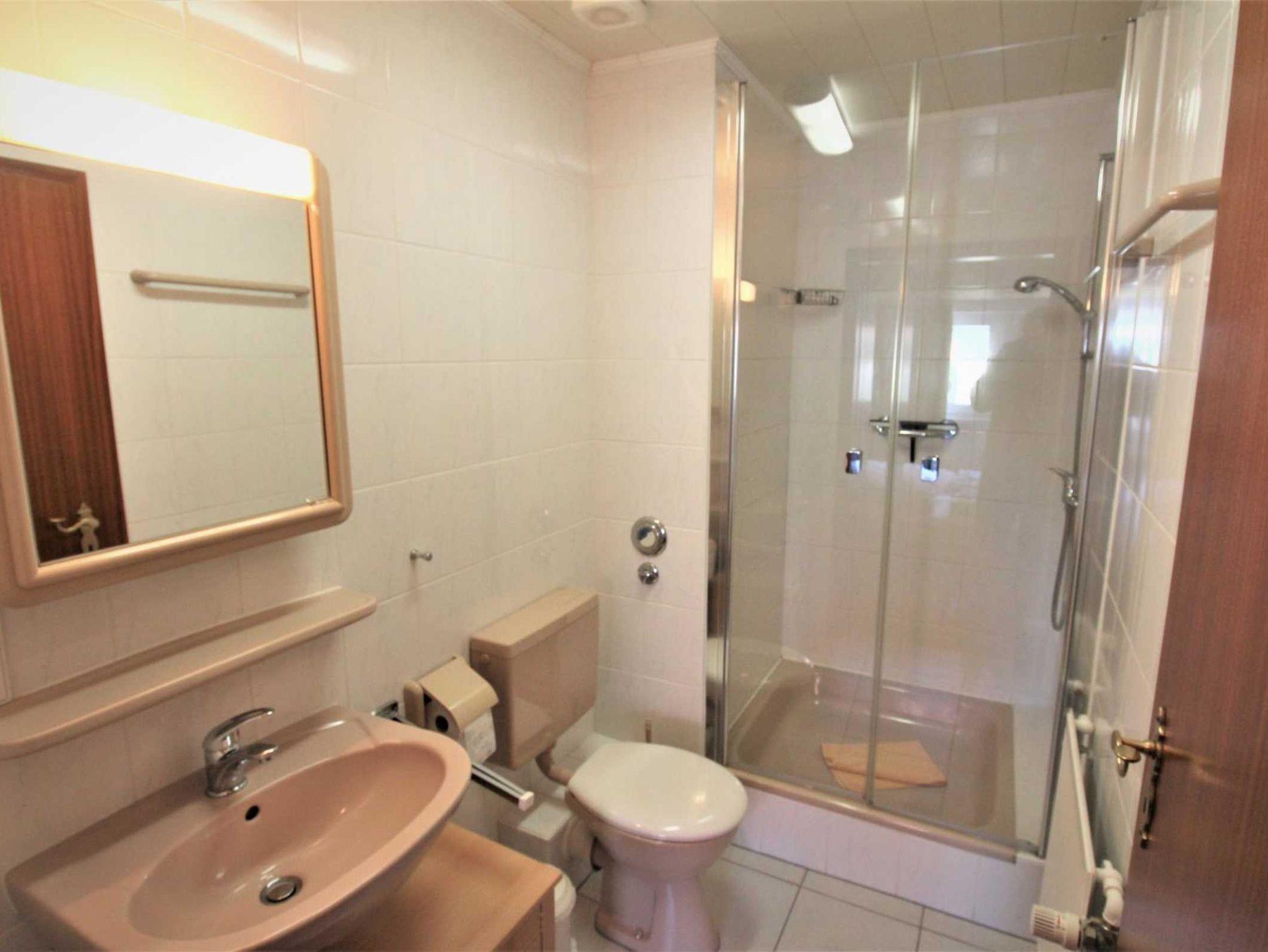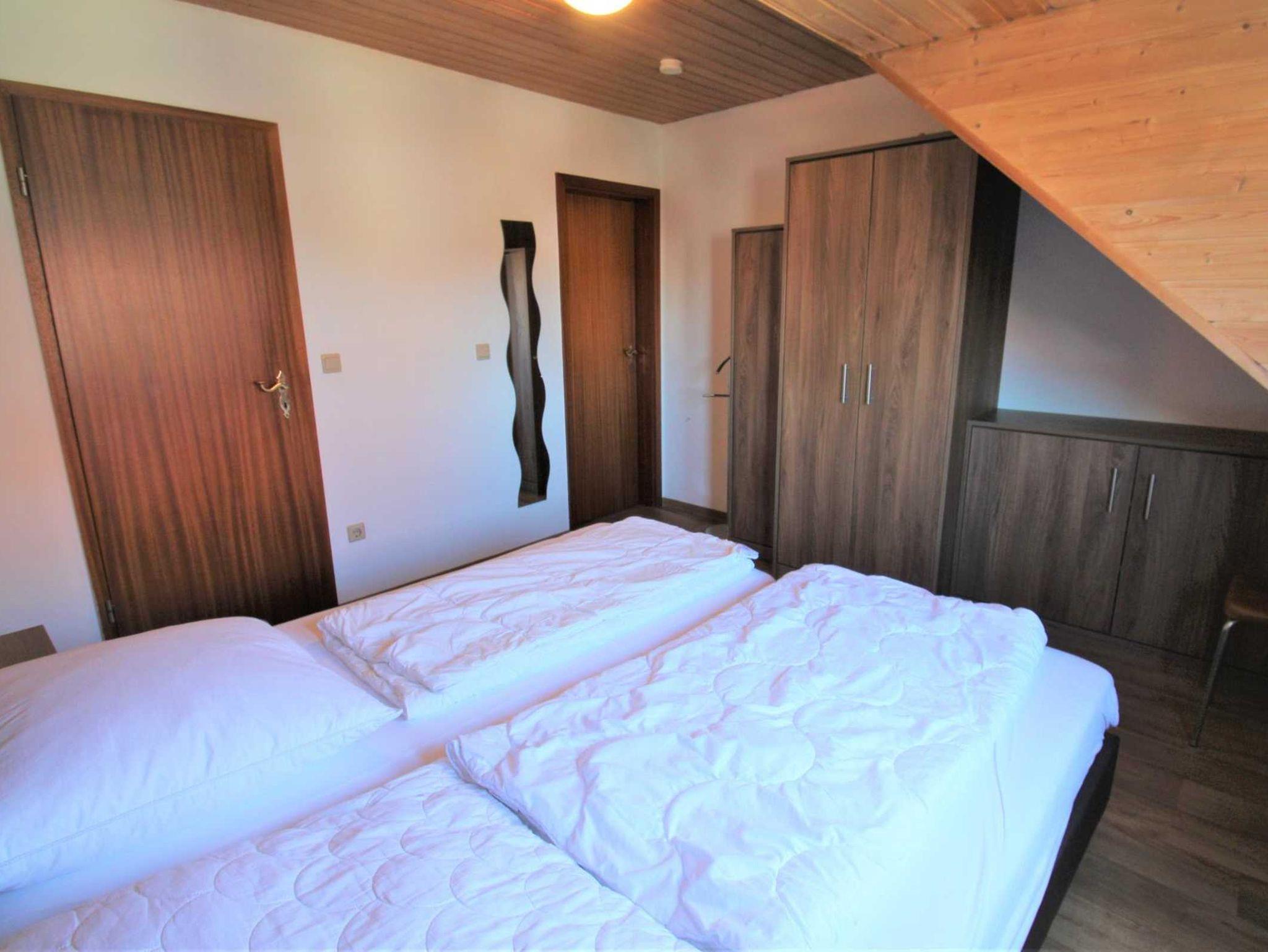 Oben: ein Schlafzimmer mit Doppelbett, Dusche/WC.