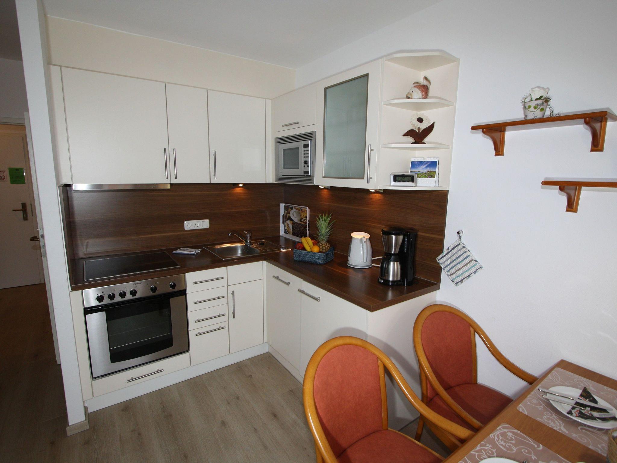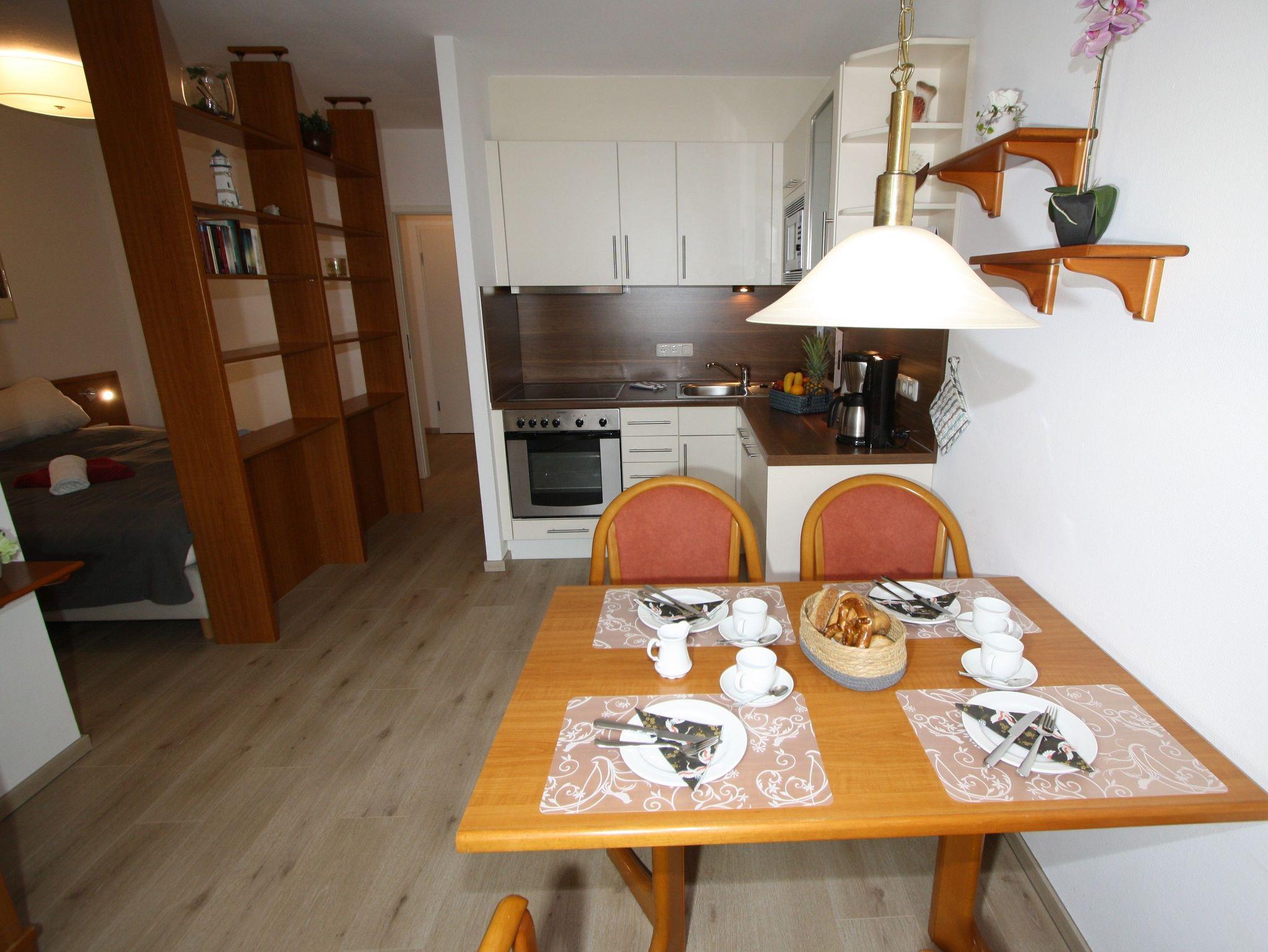 Das Doppelbett im Wohn-/Schlafraum ist mit einem Raumteiler vom Wohnraum abgetrennt. Der Küchen- und Essbereich ist mit Mikrowelle und Geschirrspüler bis hin zu Eierkocher und Rührmixer voll ausgestattet.