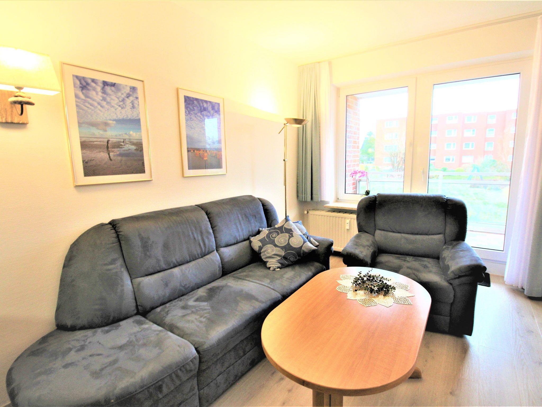 Der Wohnbereich ist mit einem gemütlichen 2,5 er Sofa und Sessel sowie SAT-TV eingerichtet.