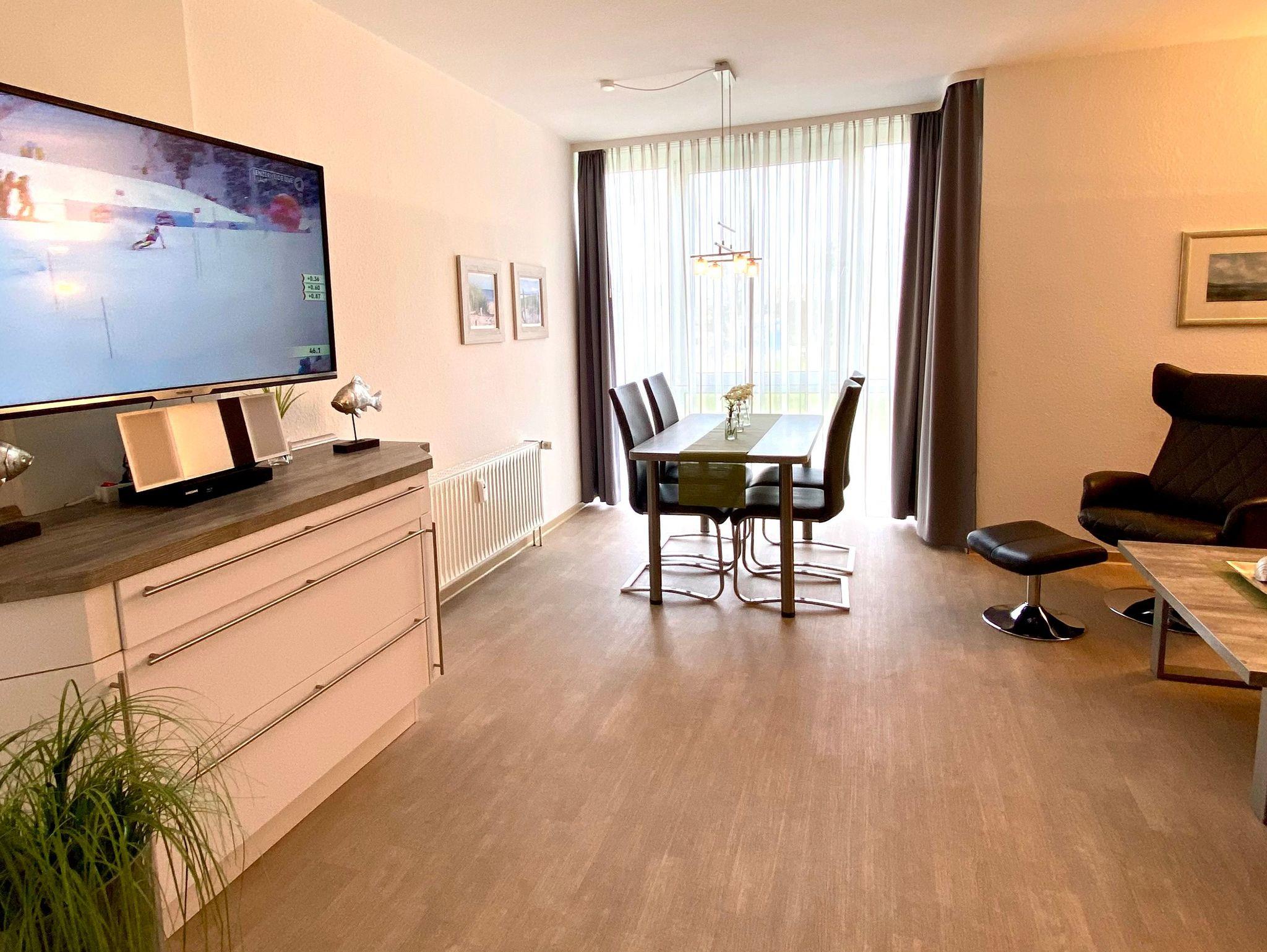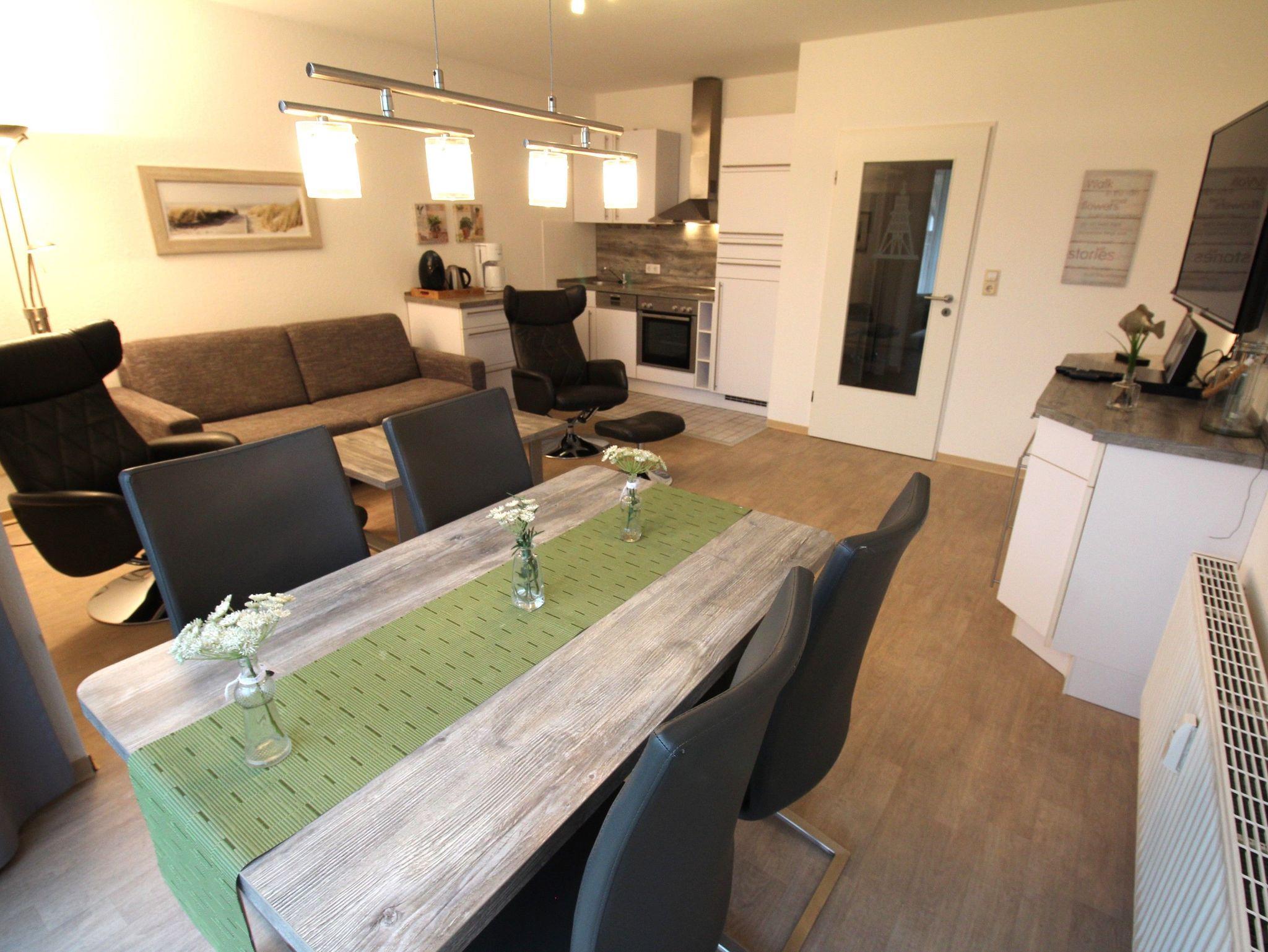 Im gemütlichen Wohnraum, mit bequemer Doppelbettcouch (150 cm x 200 cm) und den modernen Relaxsesseln genießen Sie entspannte Fernsehmomente mit Blick auf das komfortable TV (49 Zoll). Vom Essplatz aus, durch die große Fensterfront, haben Sie Blick auf Garten und Deich