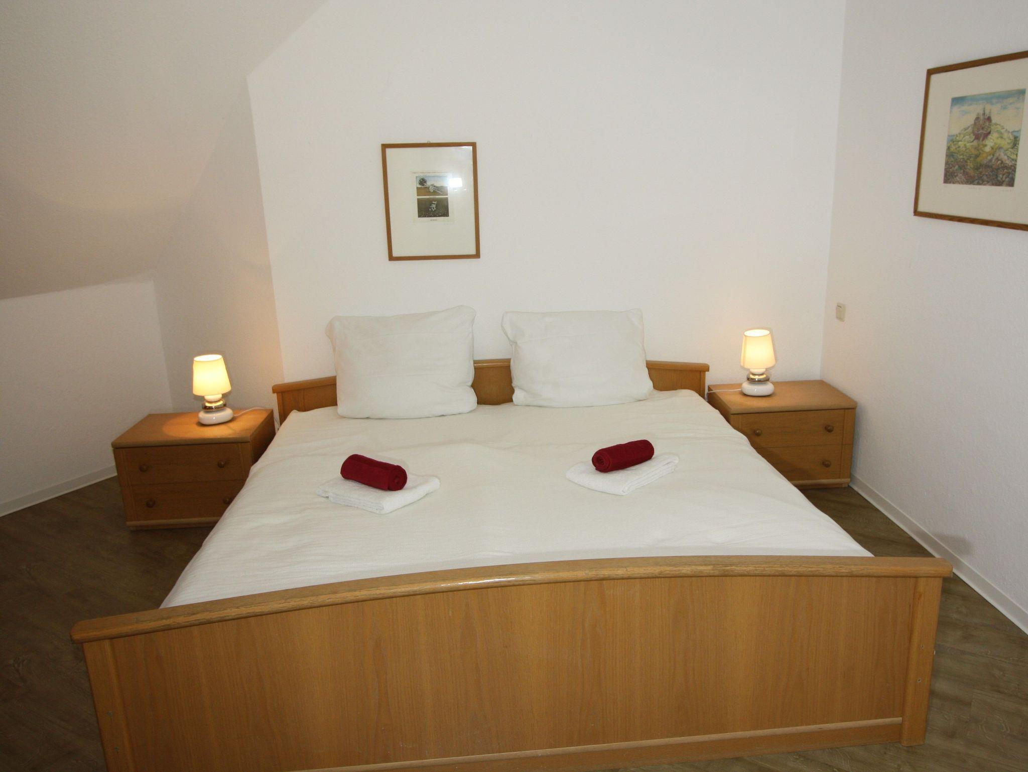 Schlafraum mit Doppelbett, ein Schlafraum im Spitzboden mit Doppelbett (einteilige Matratze) sowie