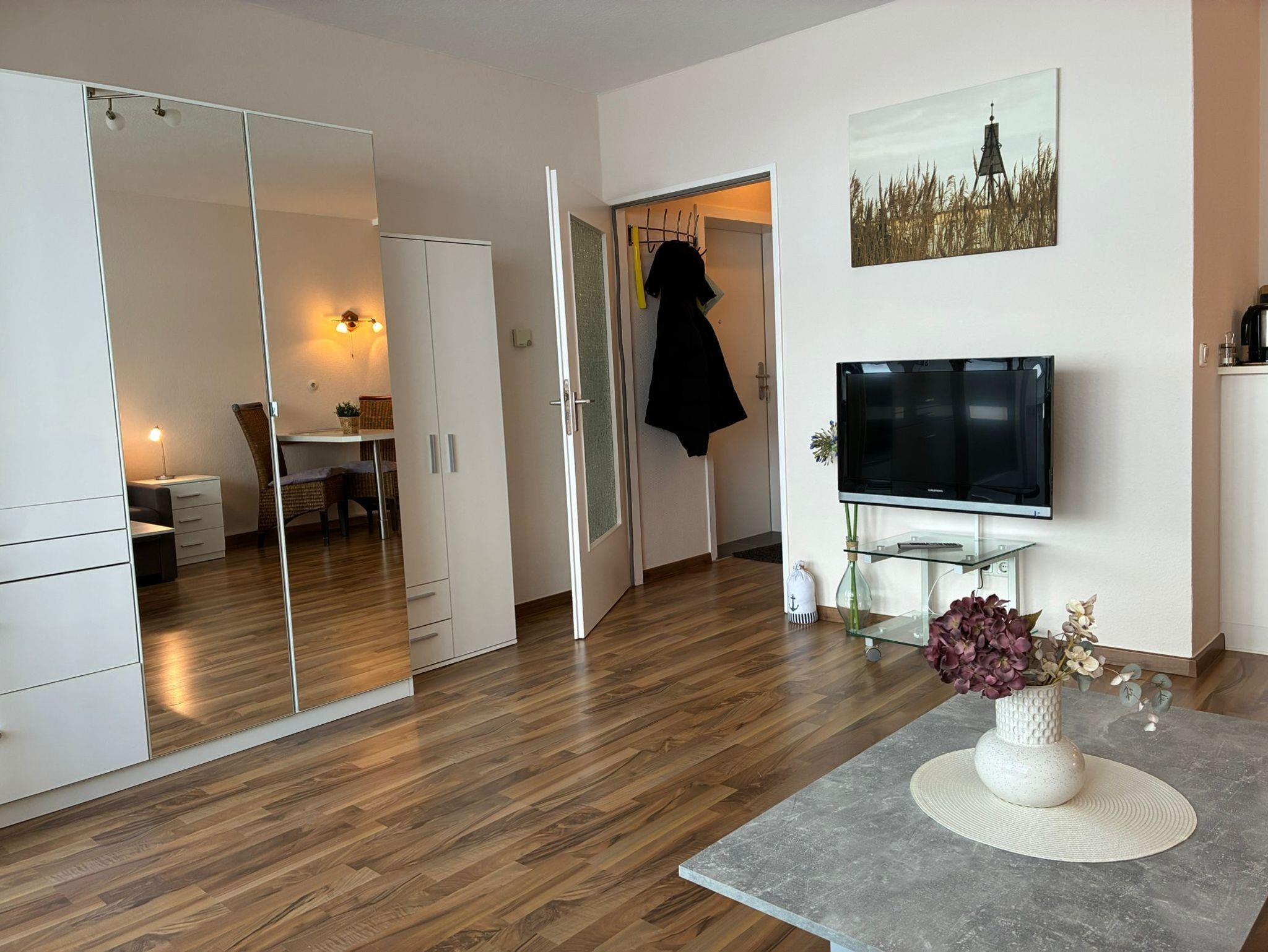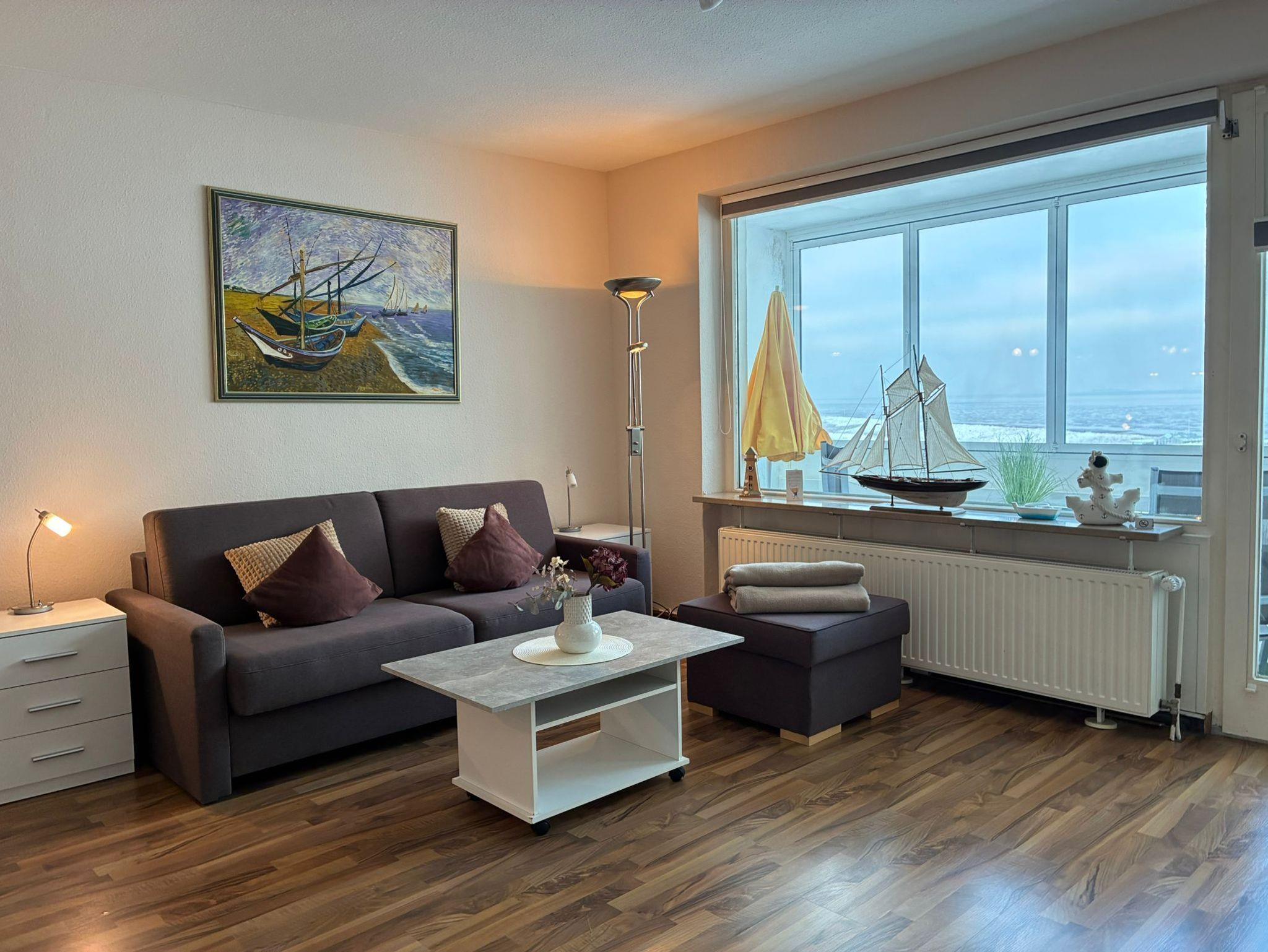 Sie wohnen in einem 1-Zimmer-Appartement für bis zu 2 Personen in der 6. Etage mit Panoramaseesicht auf ca. 35 m² Wohnfläche, ein Wohn-/Schlafraum mit Doppelbettcouch, separater Essplatz, Flachbild-TV, voll ausgestattete Küche mit Mikrowelle, Dusche/WC, verglaster Loggia (Fenster sind zum aufschieben), PKW-Stellplatz und abschließbarer Fahrradgarage.