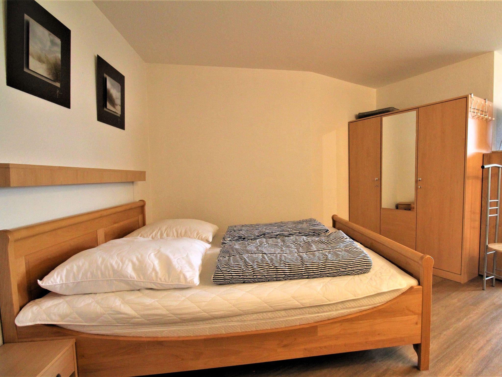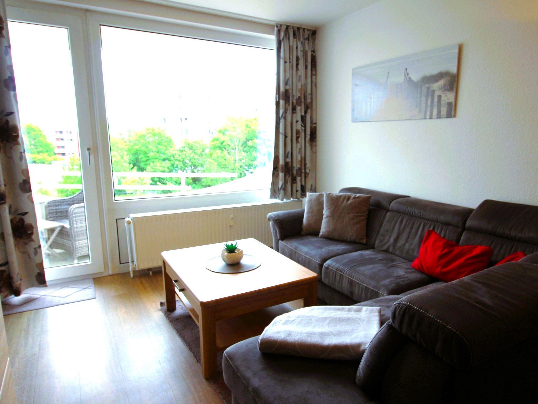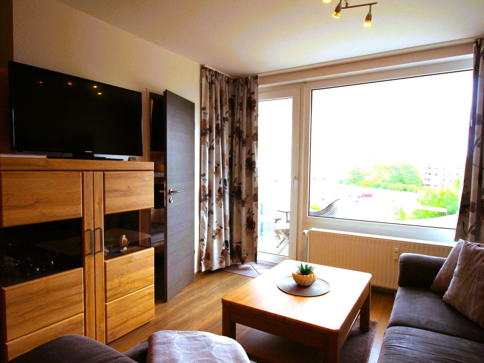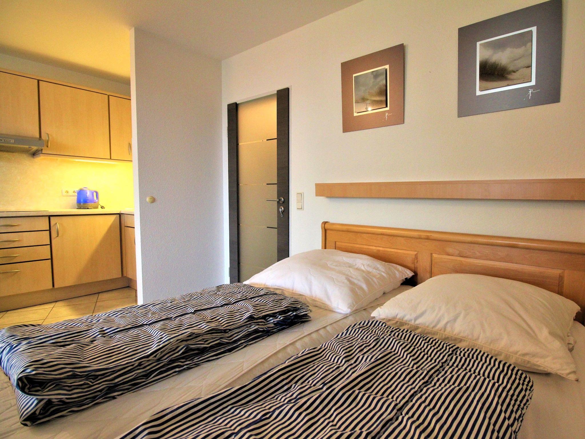 Sie wohnen in einem 1-Zimmer-Appartement für bis zu 4 Personen auf ca. 40 m² im 3. OG mit einem kleinen zusätzlichen Schlafzimmer mit Etagenbett für die 3. und 4. Person. Wohn-/Schlafzimmer mit Doppelbett, separater Essplatz, voll ausgestatteter Küchenbereich mit Geschirrspüler und Mikrowelle, Dusche/WC, möblierter Balkon mit Morgensonne und Blick auf die See, LCD-TV, Tiefgaragenplatz und Fahrradstellplatz in einem abschließbaren Raum.