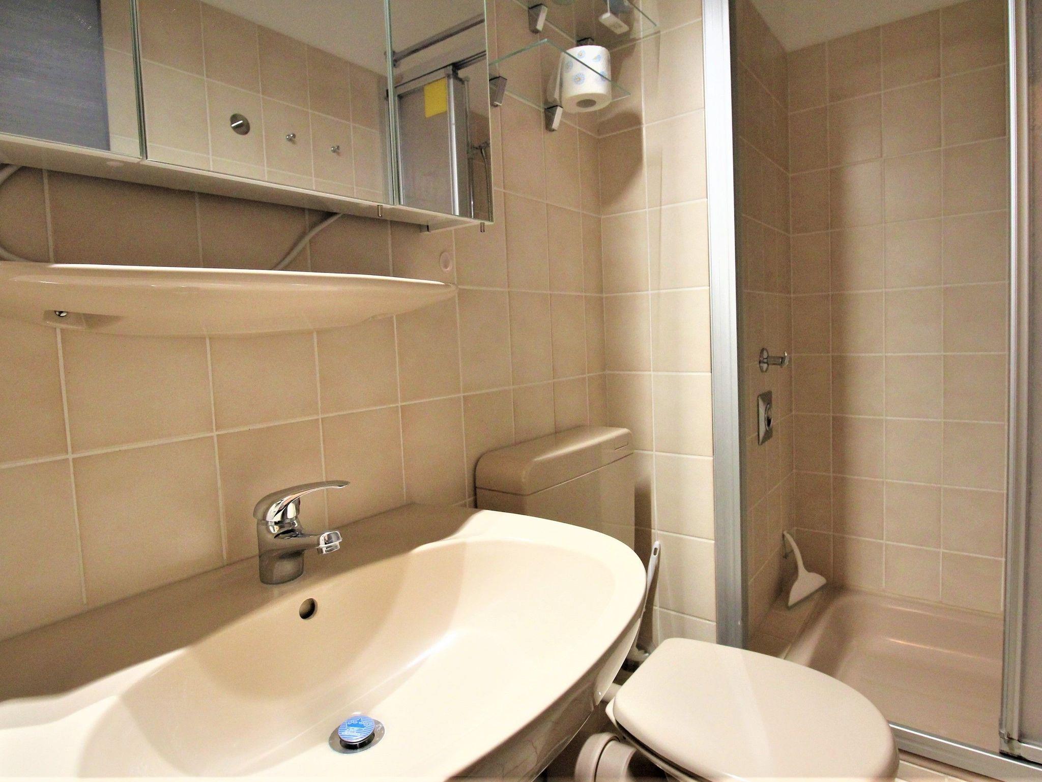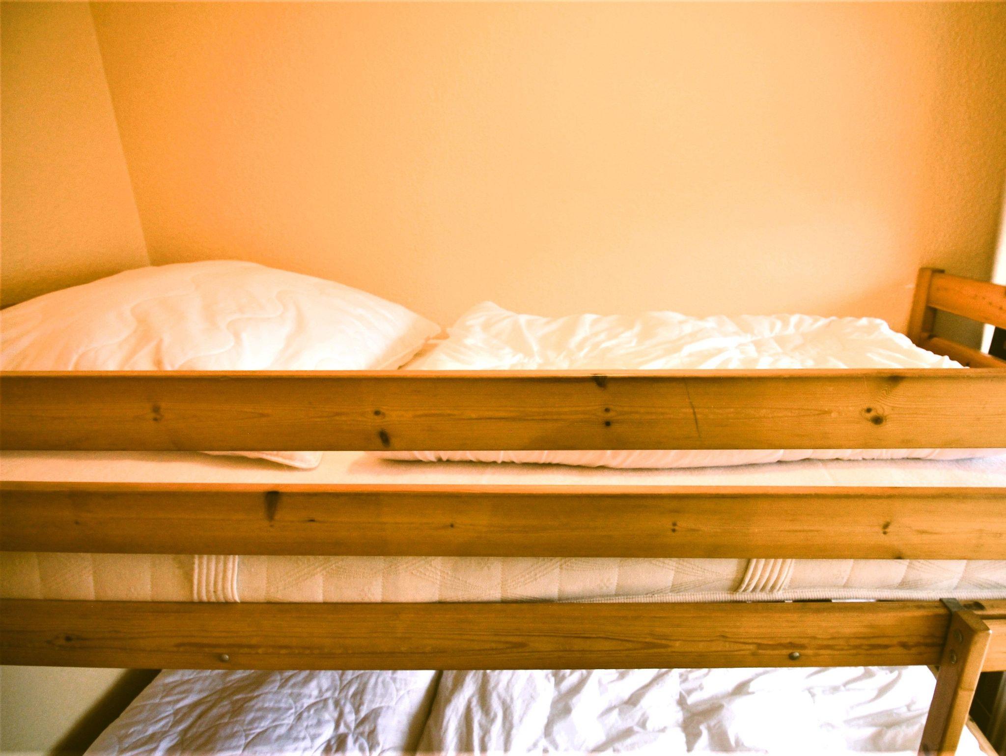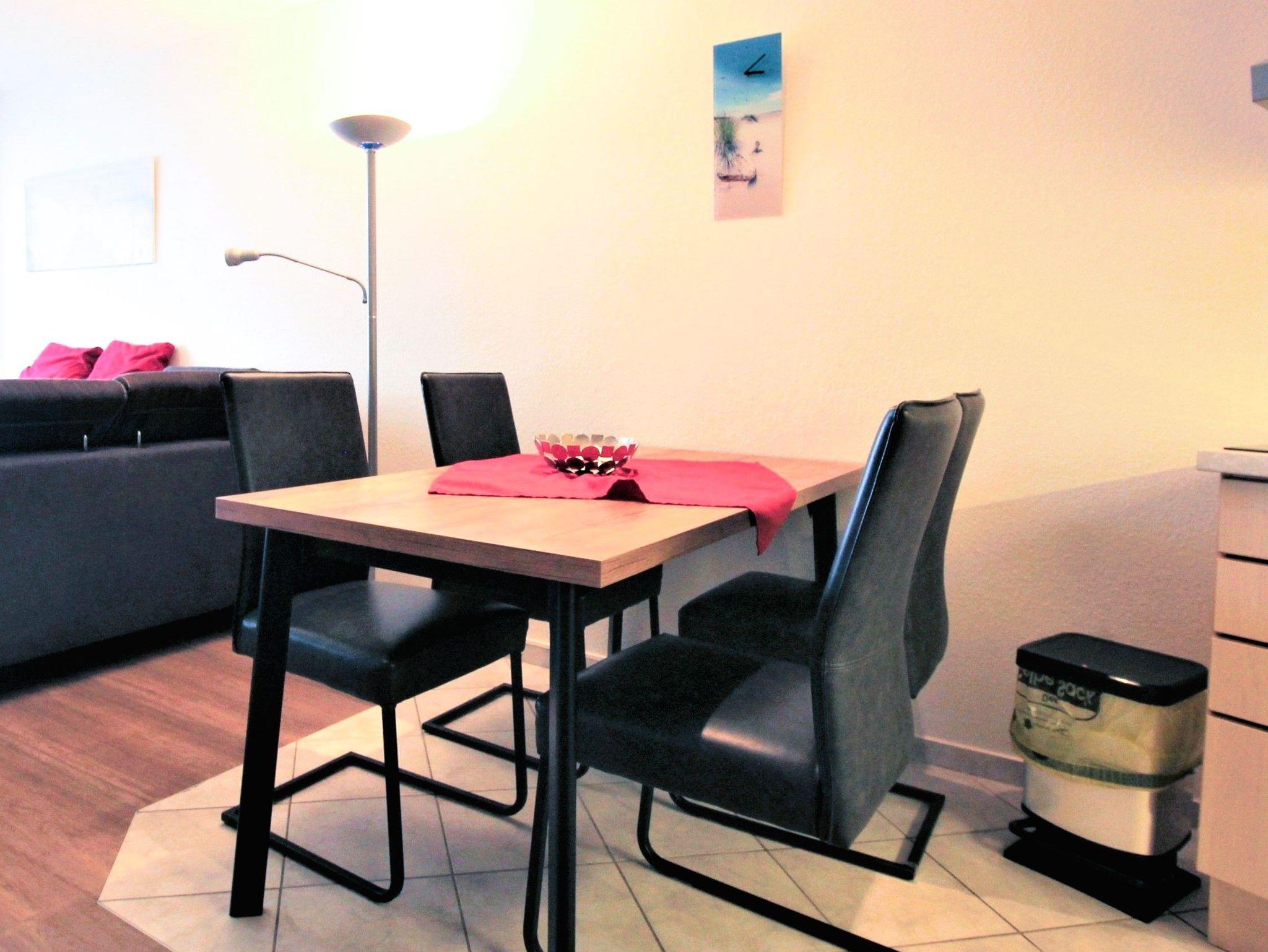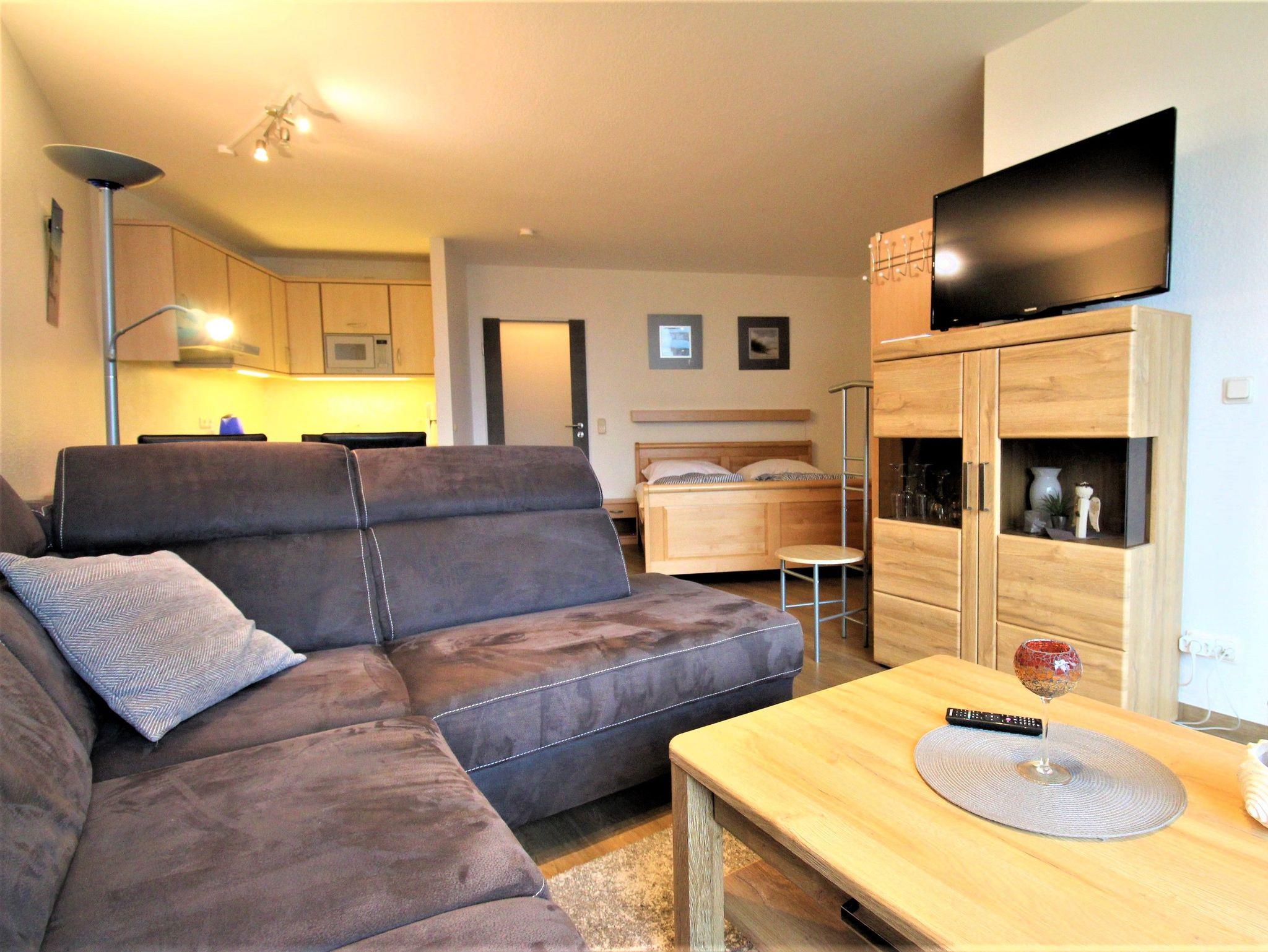 Sie wohnen in einem 1-Zimmer-Appartement für bis zu 4 Personen auf ca. 40 m² im 3. OG mit einem kleinen zusätzlichen Schlafzimmer mit Etagenbett für die 3. und 4. Person. Wohn-/Schlafzimmer mit Doppelbett, separater Essplatz, voll ausgestatteter Küchenbereich mit Geschirrspüler und Mikrowelle, Dusche/WC, möblierter Balkon mit Morgensonne und Blick auf die See, LCD-TV, Tiefgaragenplatz und Fahrradstellplatz in einem abschließbaren Raum.