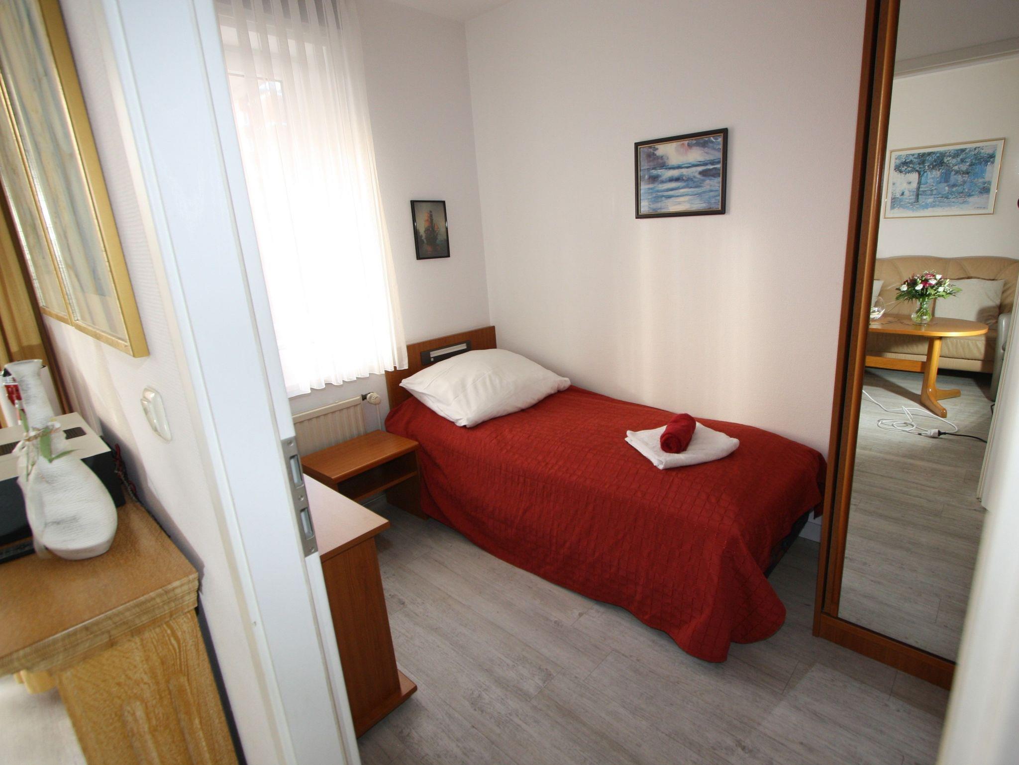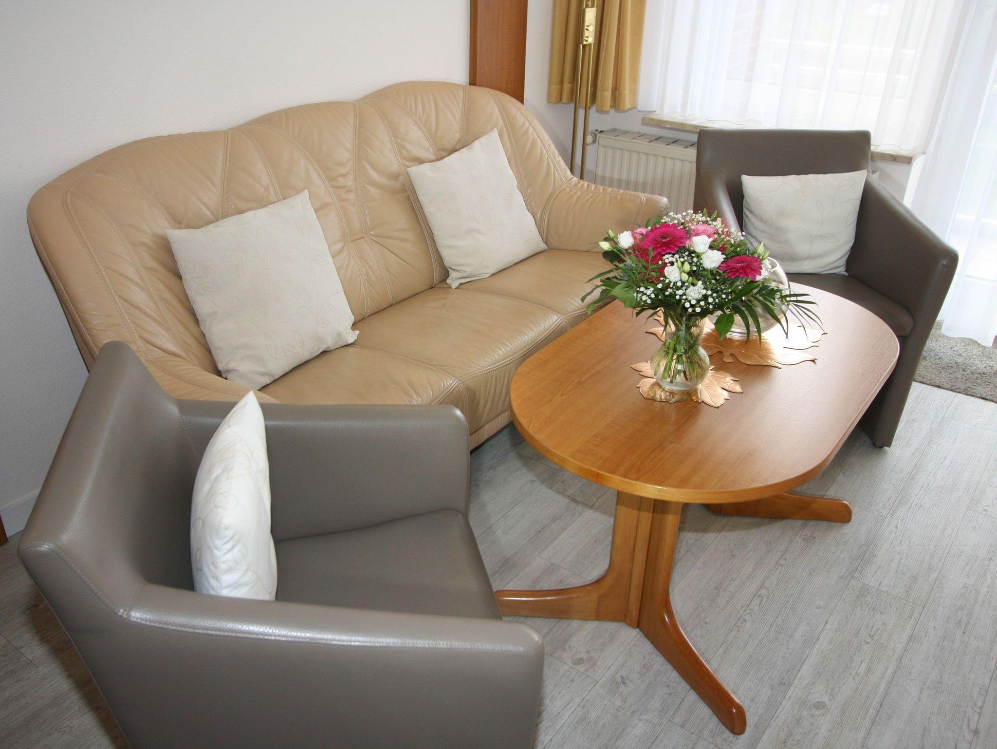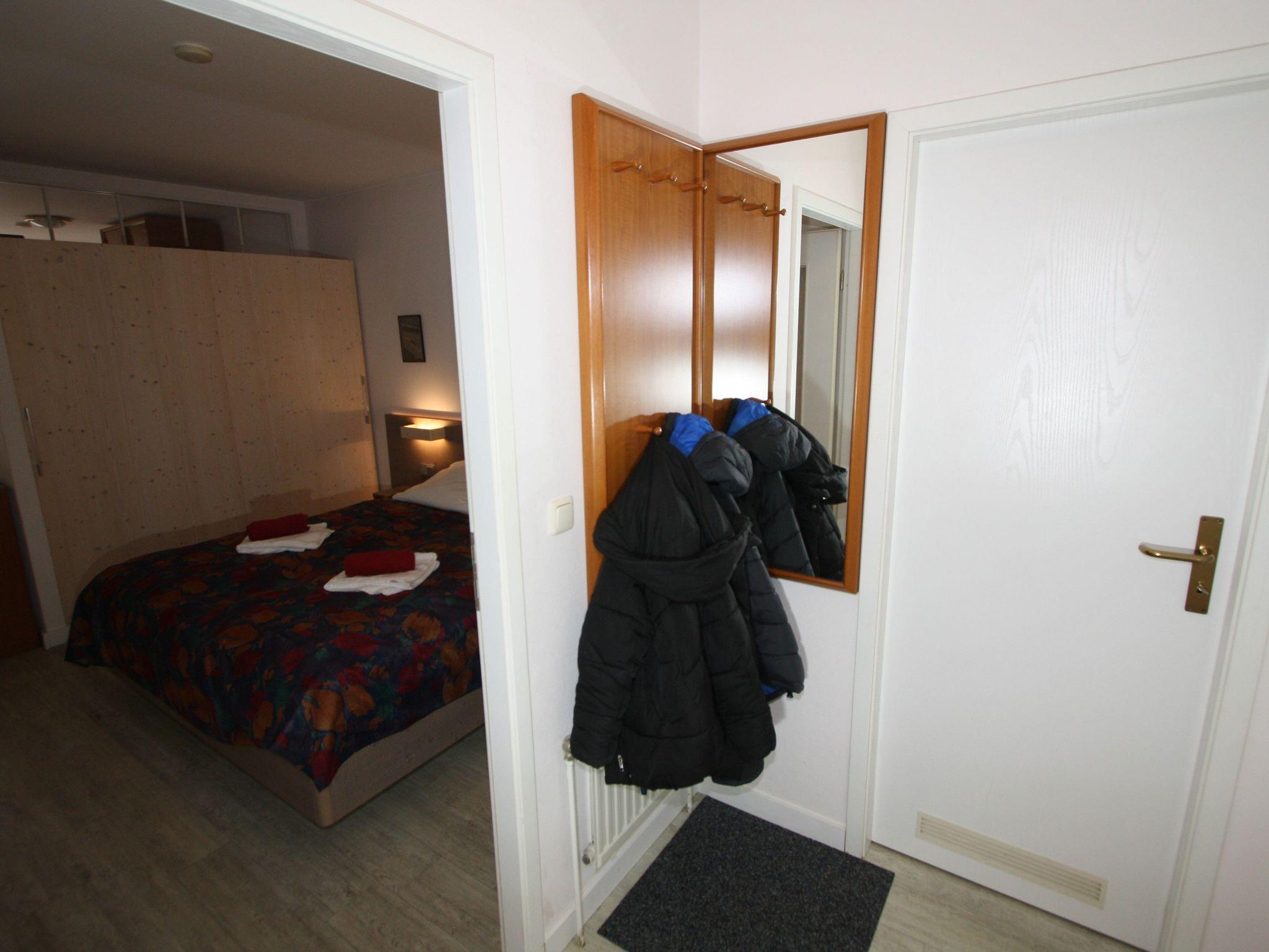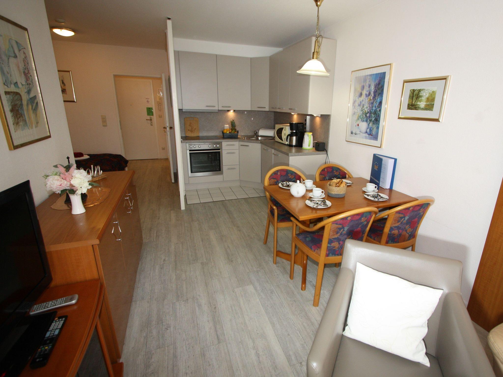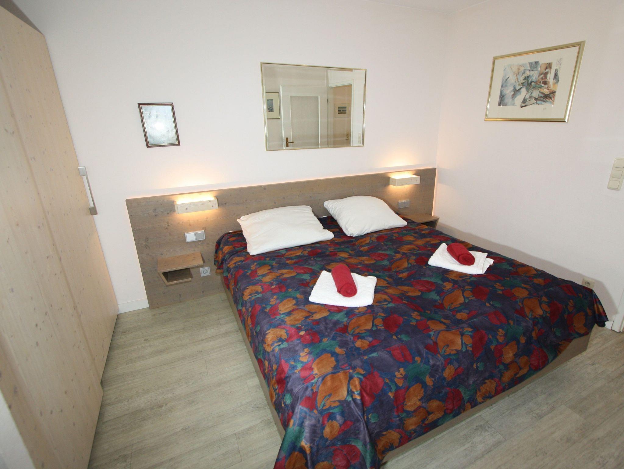 Sie wohnen in einem großzügigen 2-Zimmer-Appartement für bis zu 4 Personen auf 53 m² Wohnfläche im 2. Obergeschoss: ein separates Schlafzimmer mit zwei Einzelbetten, Wohnraum mit integriertem Schlafbereich und Doppelbett, Flachbild-TV, HiFi-Anlage, DVD-Player, separater Essplatz, voll ausgestatteter Küchenbereich mit Geschirrspüler, Ceranfeld, Backofen und Mikrowelle. Dusche/WC, Süd-Balkon, Tresor, WLAN.