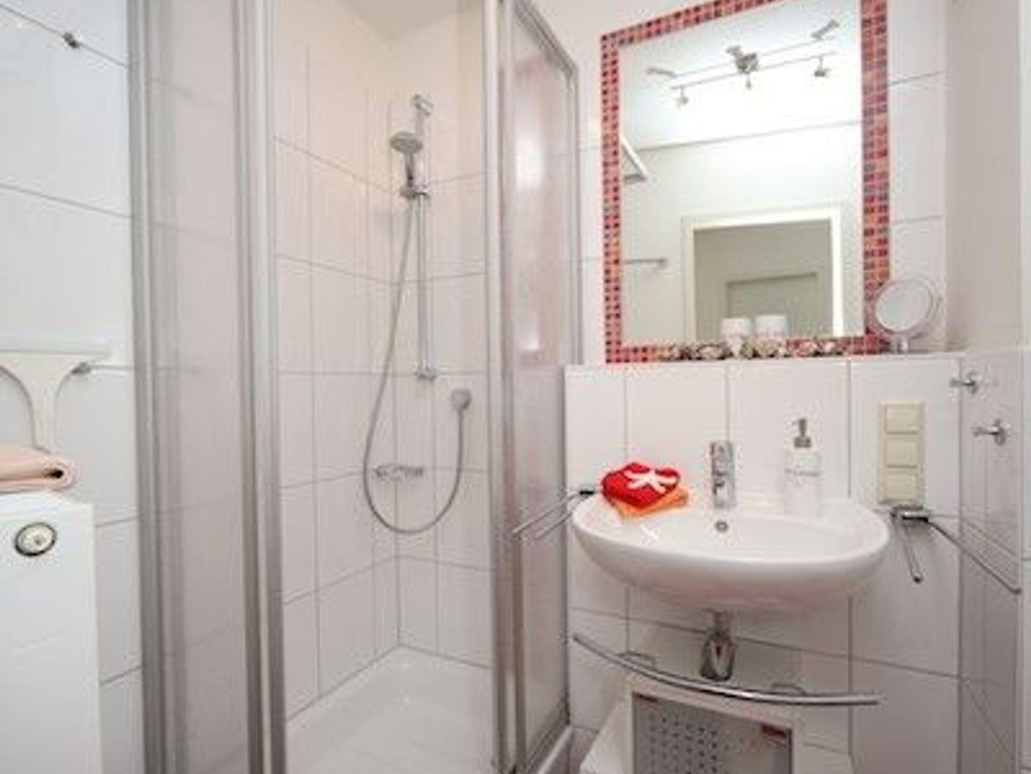 Unser Badezimmer verfügt über eine Dusche.