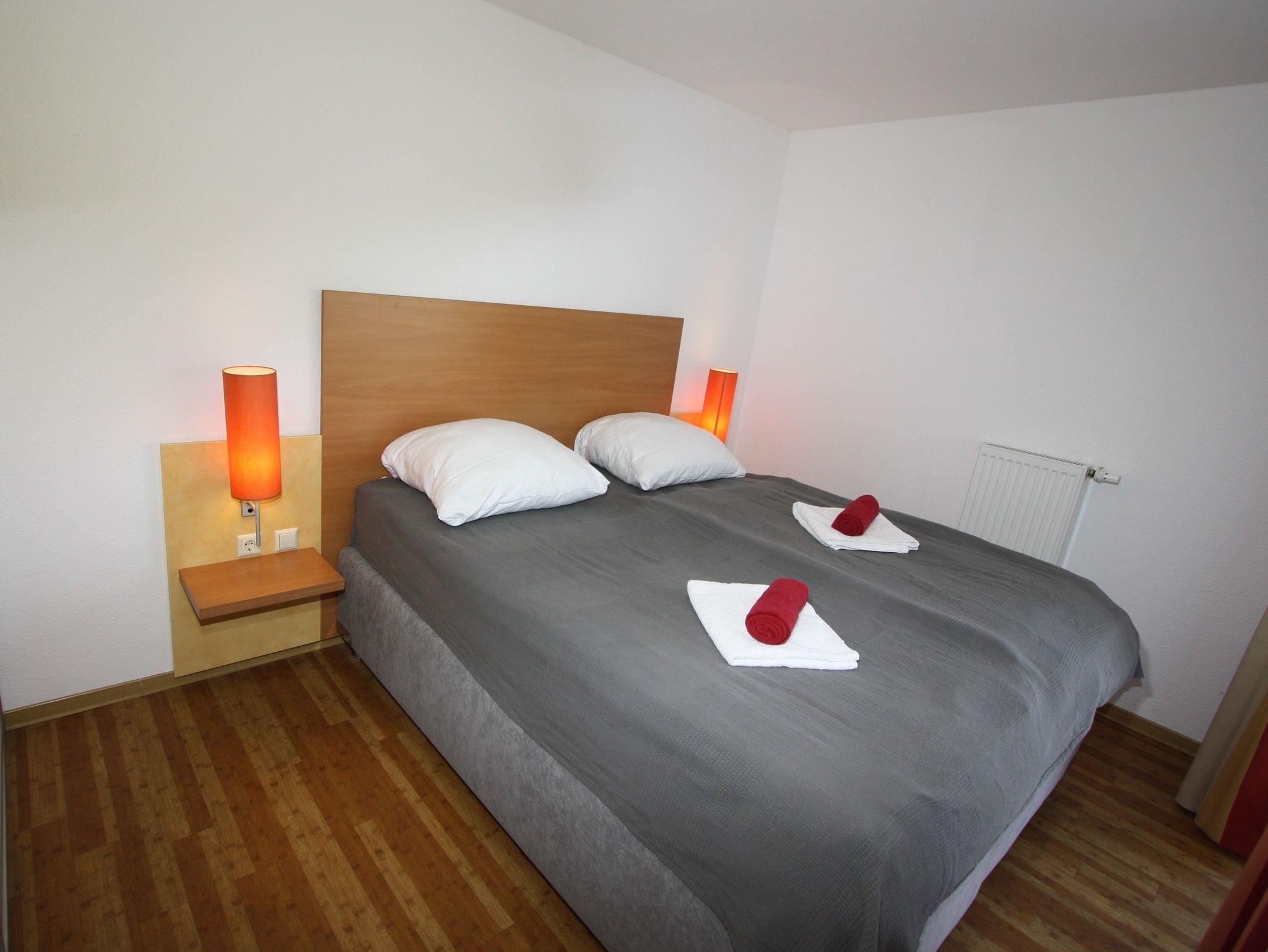 - ein Schlafzimmer mit Doppelbett (Boxspringbetten in Top-Qualität und Liegehöhe), Einbauschrank, Herrendiener und Radiowecker