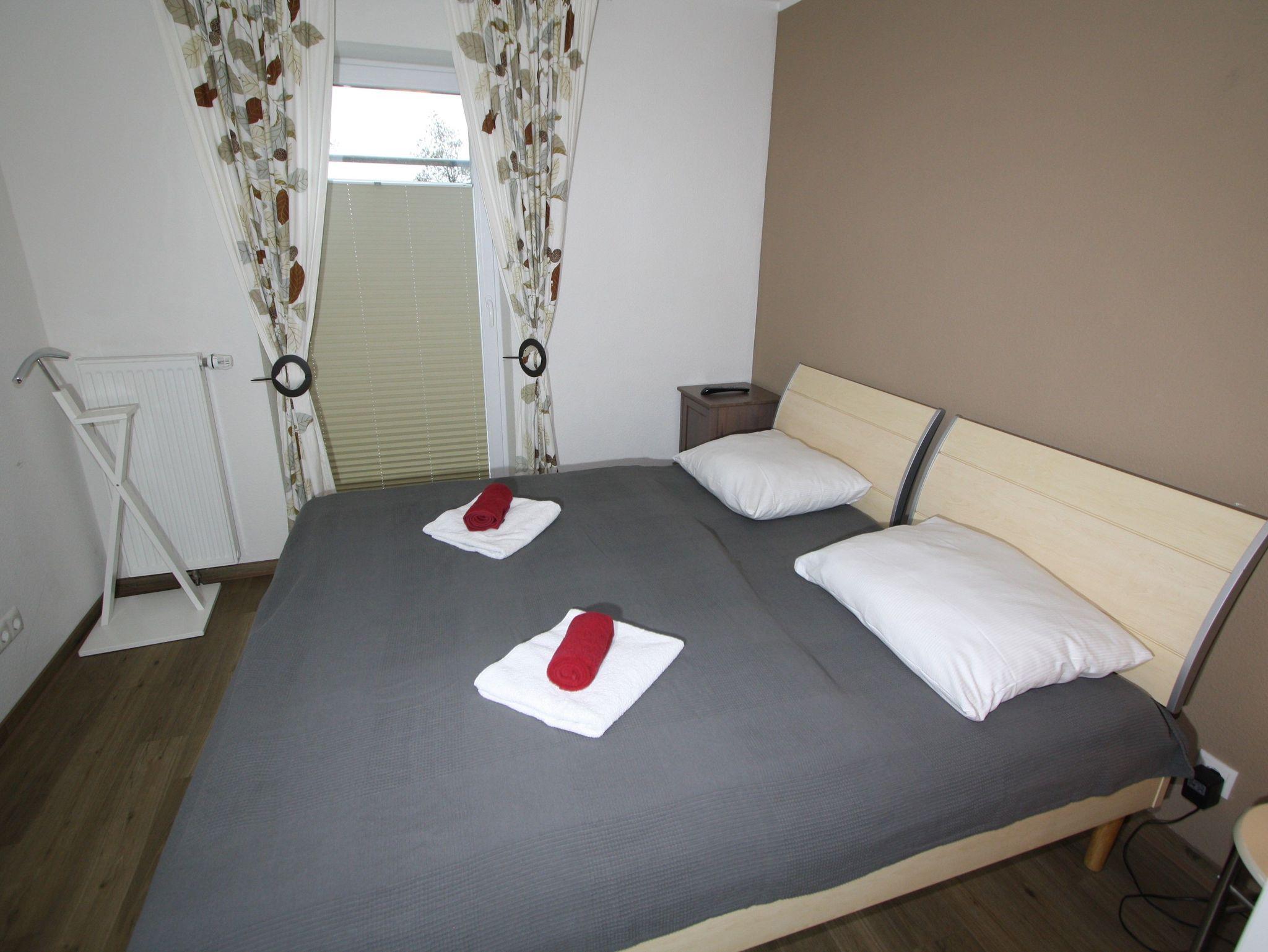 Das Schlafzimmer besteht aus einem Doppelbett mit einer Liegefläche von 180 cm x 200 cm.