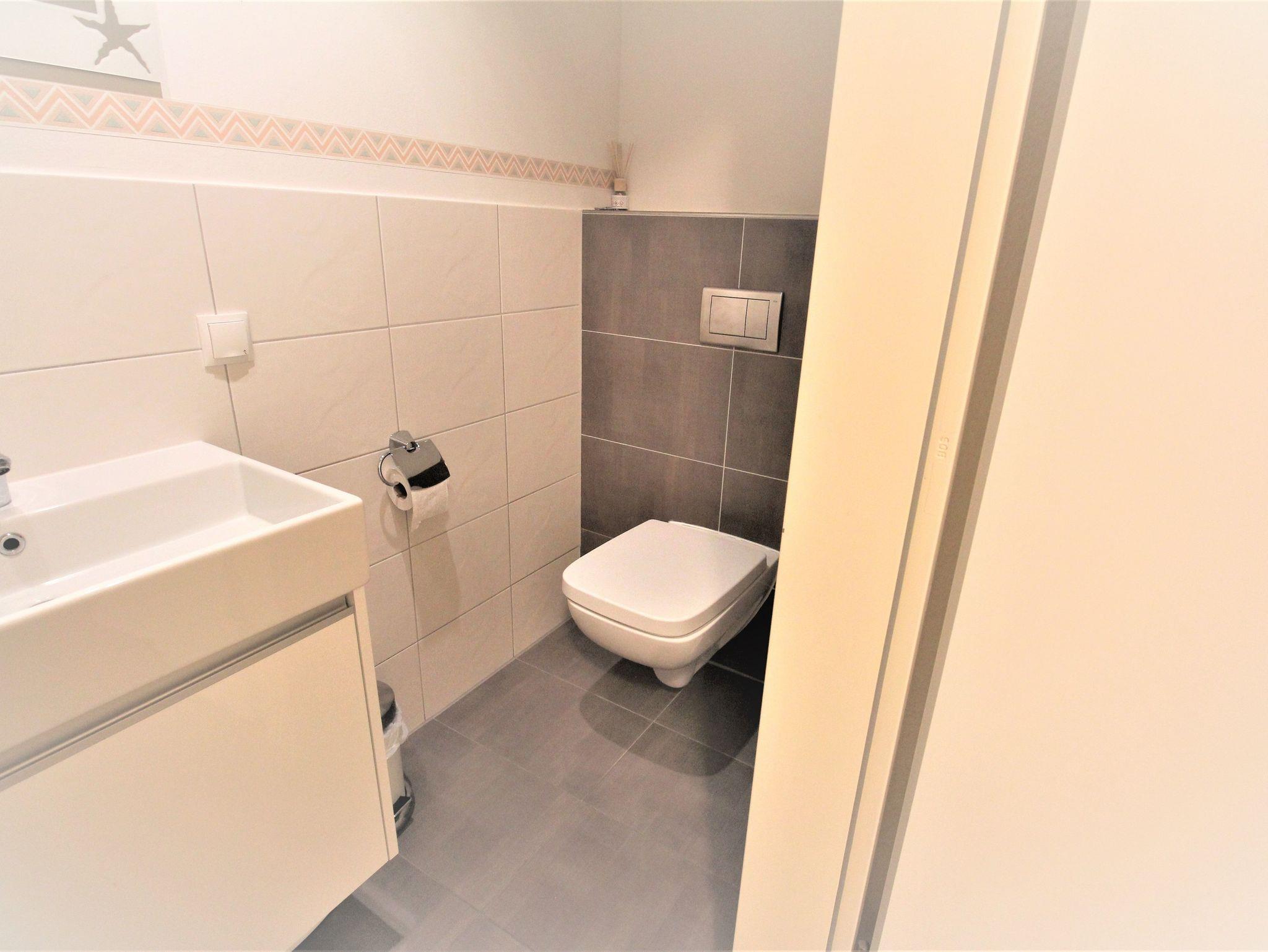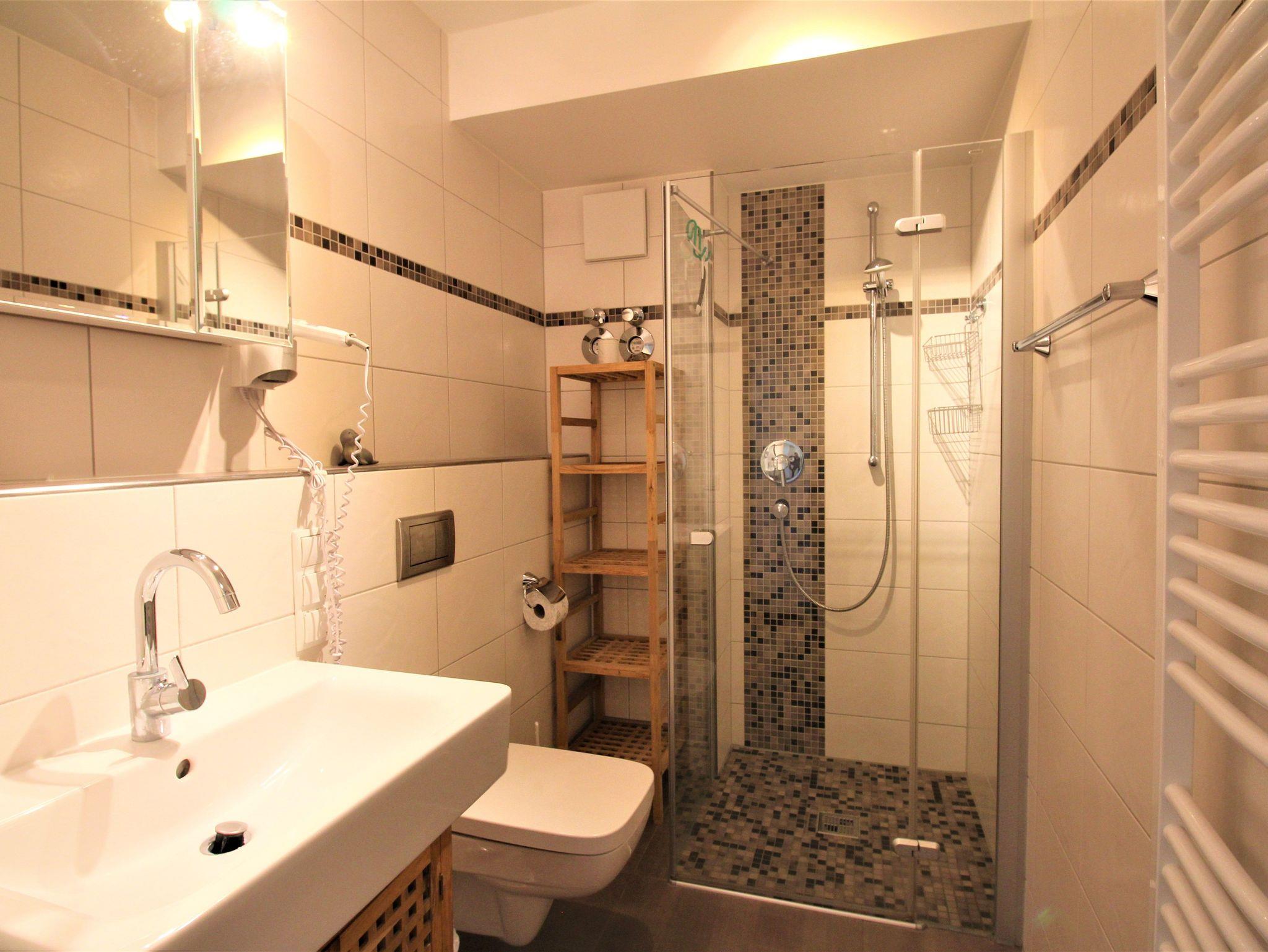 Im Bad finden Sie neben WC, Waschbecken und bodengleicher Dusche einen beleuchteten Spiegel und einen Föhn. Zusätzlich gibt es noch ein zweites WC mit großem Waschbecken.