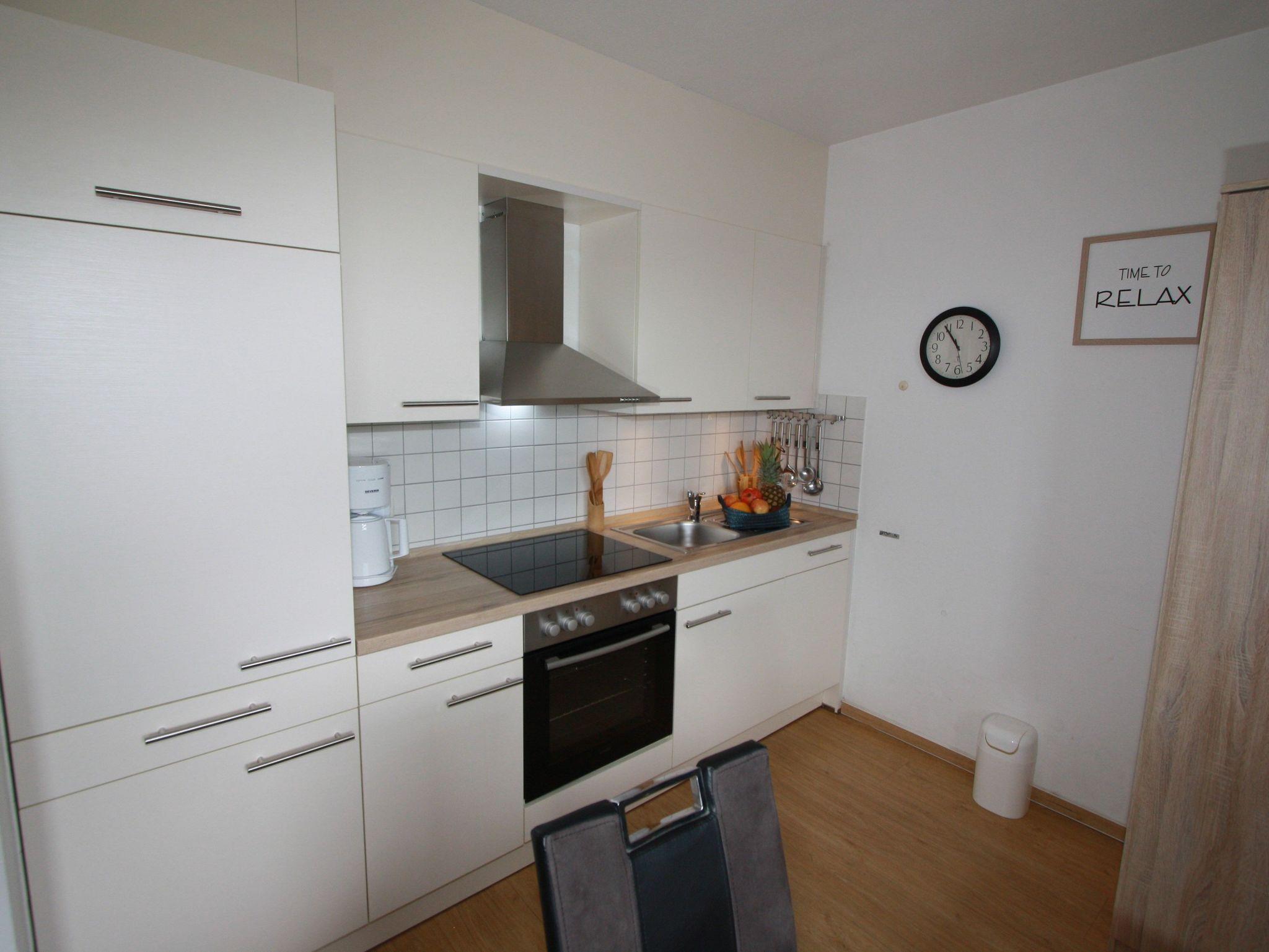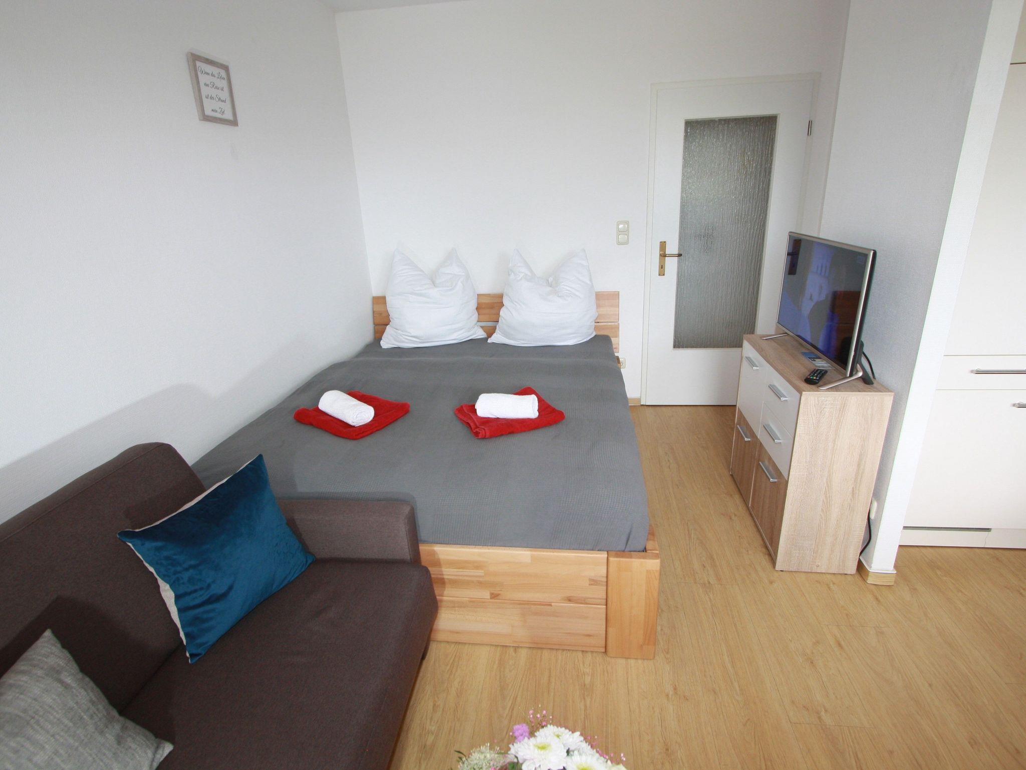 Sie wohnen in einem 1-Zimmer-Appartement für bis zu 2 Personen auf ca. 30 m² Wohnfläche. Die Ferienwohnung verfügt über einen Wohn-/Schlafraum mit hochwertiger Schlafcouch, LCD-TV, Mini-Hifi-Anlage, Internetzugang, voll ausgestattetem Küchenbereich mit Essplatz, Dusche/WC, ostseitigem Balkon (Morgensonne!) und Tiefgaragenplatz.
