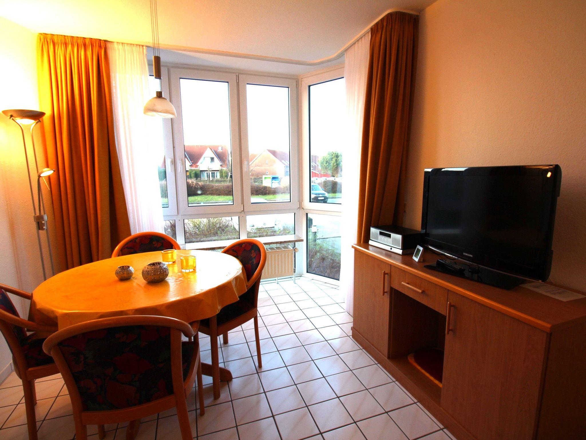 Sie wohnen in einem 2-Zimmer-Appartement für bis zu 2 Personen, ca. 40 m². EIn Schlafzimmer mit zwei Einzelbetten. Ein Bett hat eine Länge von 180 cm. Der Wohnraum ist mit einer bequemen Schlafcouch ausgestattet, separater Essplatz, voll ausgestatteter Küchenbereich, Diele mit Garderobe, Dusche/WC, Terrasse, SAT-LCD-TV und Telefon.
