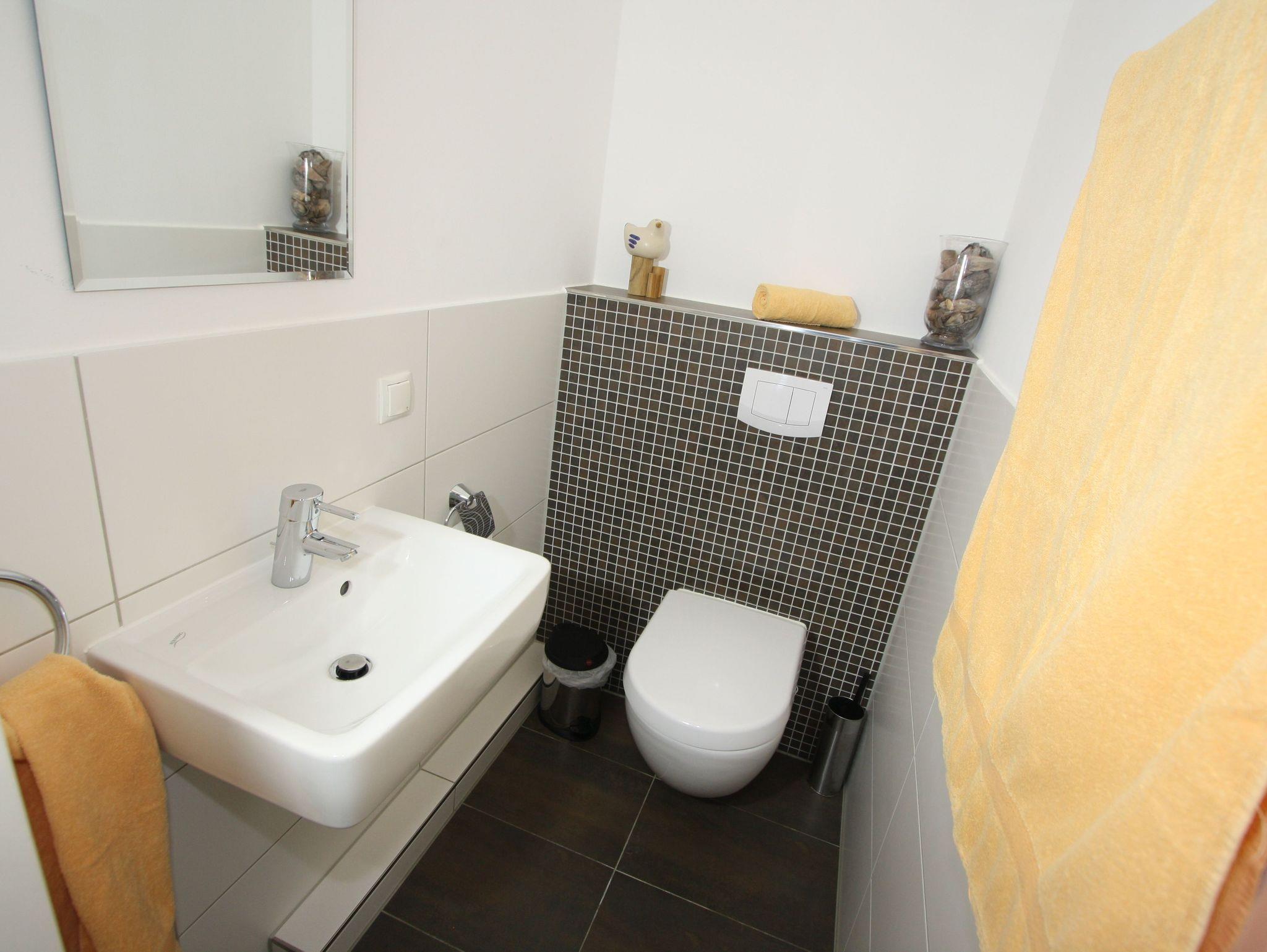 Alternativ können Sie nach einem schönen Urlaubstag in der gemütlichen Badewanne relaxen. Das moderne Bad verfügt zusätzlich über eine belebende Rainshower. Weiterhin gibt es ein separates Gäste-WC. Alle Bäder mit Fussbodenheizung.