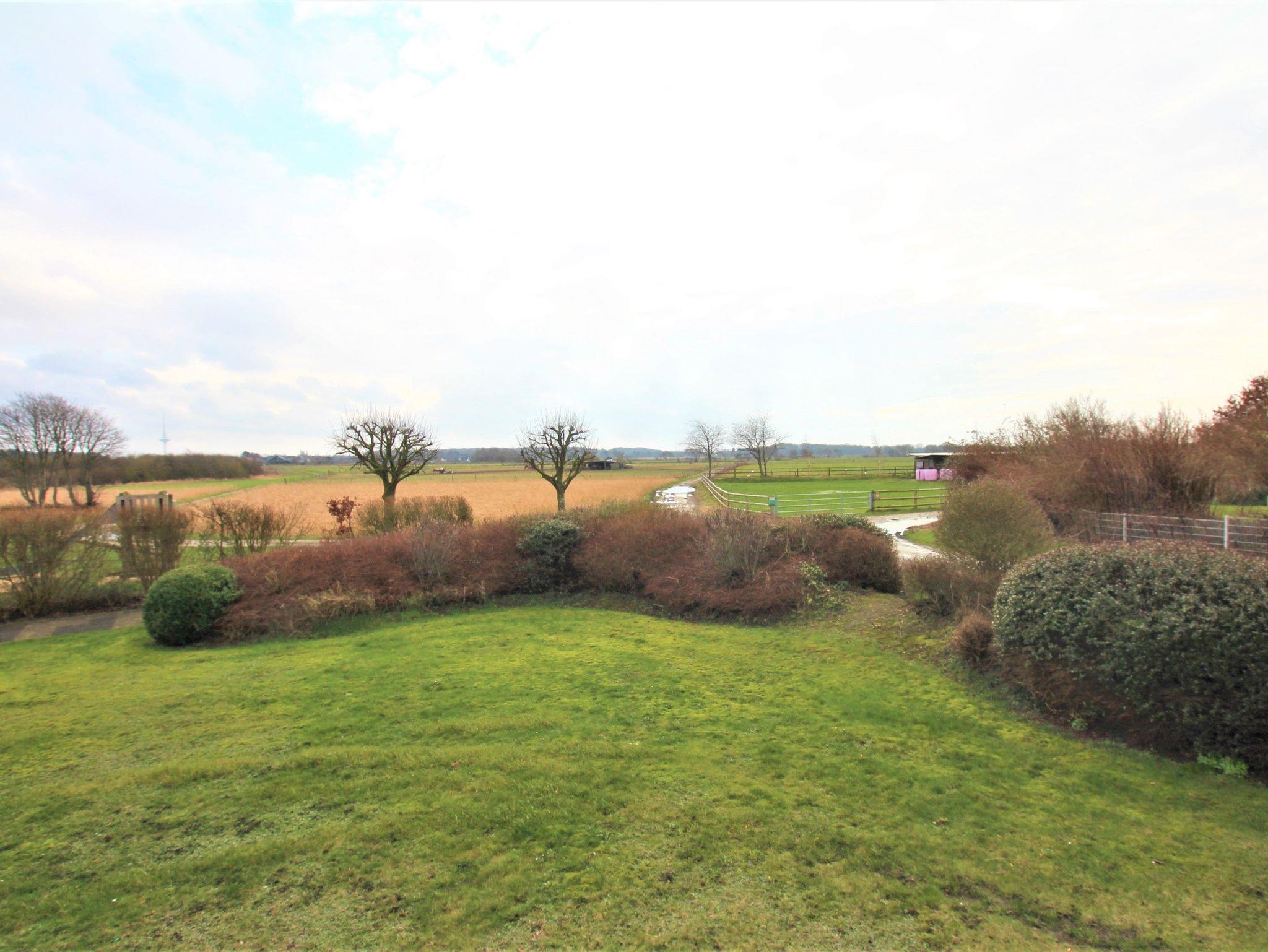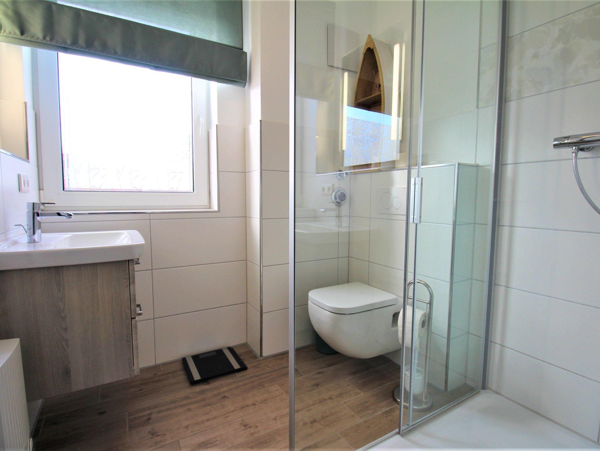 Ein Bad mit Außenfenster, WC und großer Dusche (120 cm x 90 cm), Handtuchheizkörper, ein separates Gäste-WC und ein kleiner Balkon mit Aussicht ins Grüne.