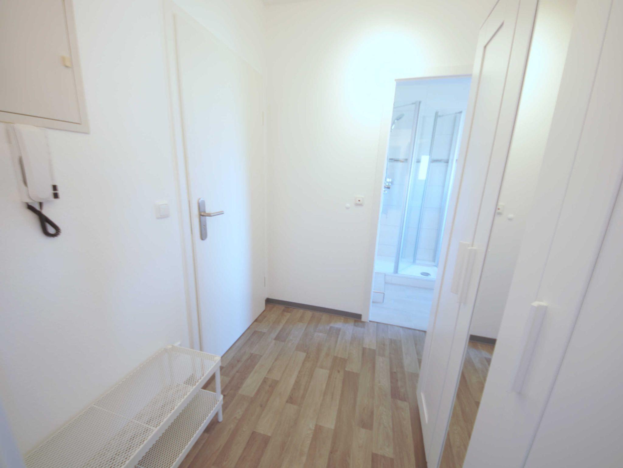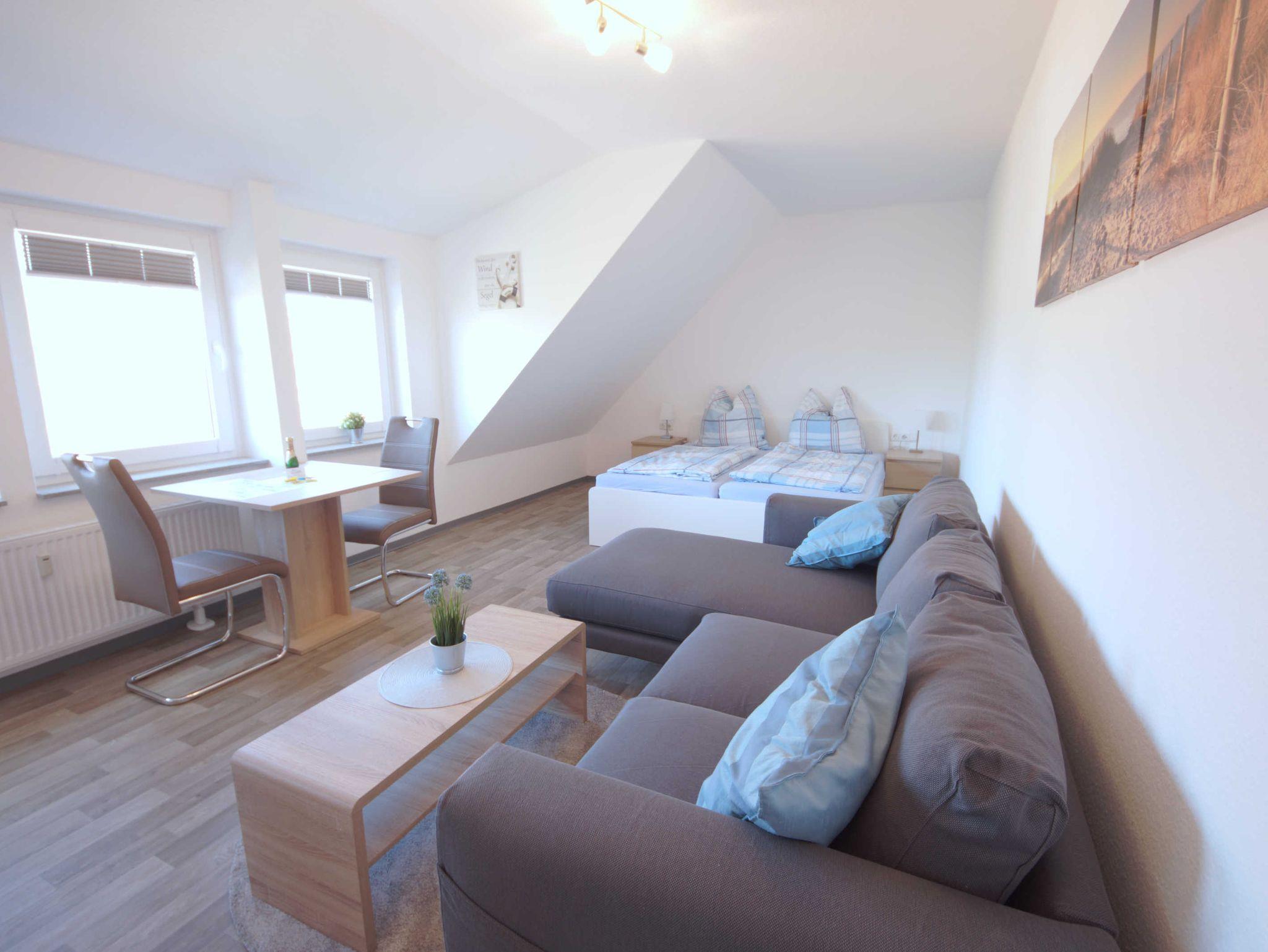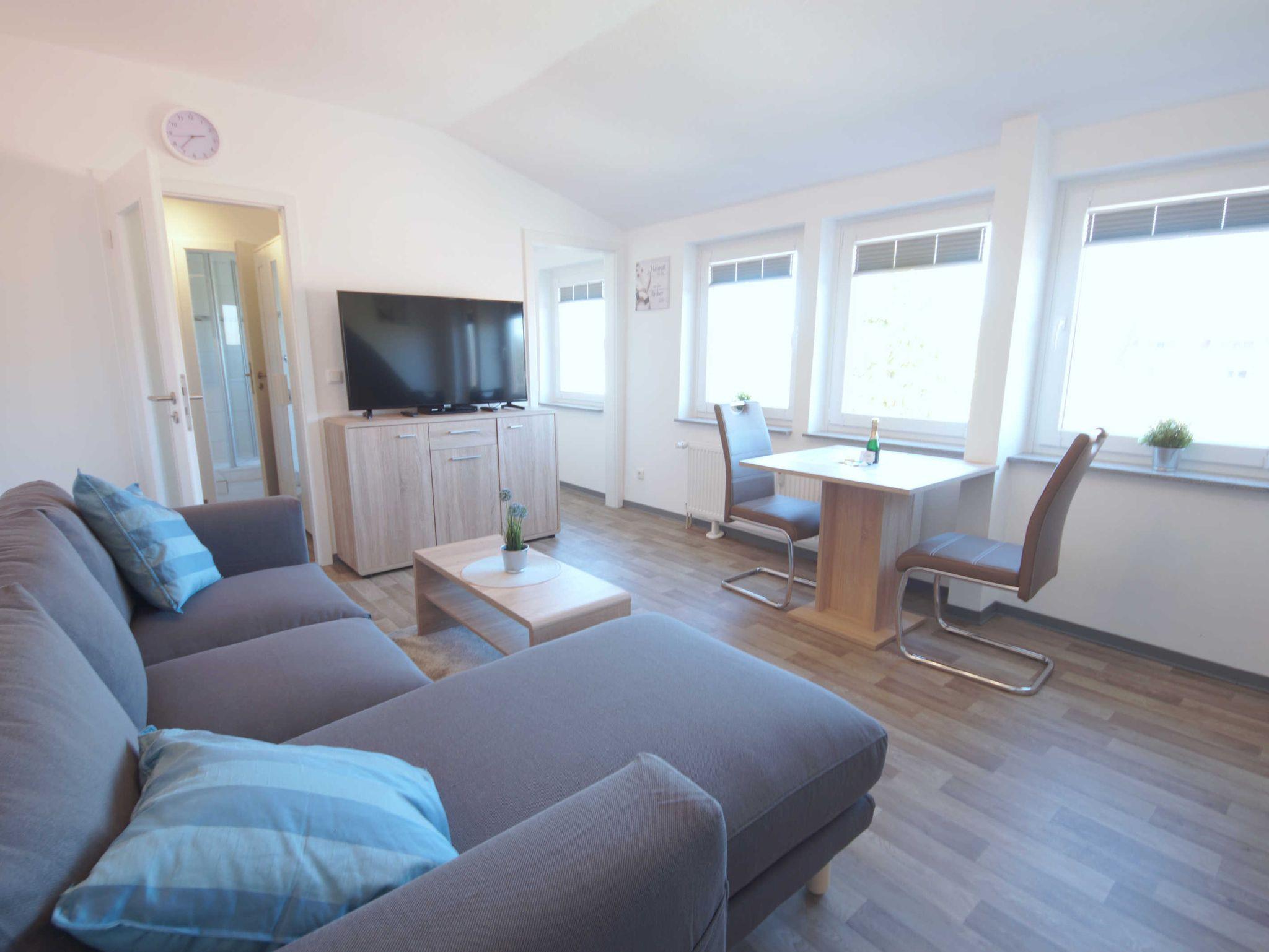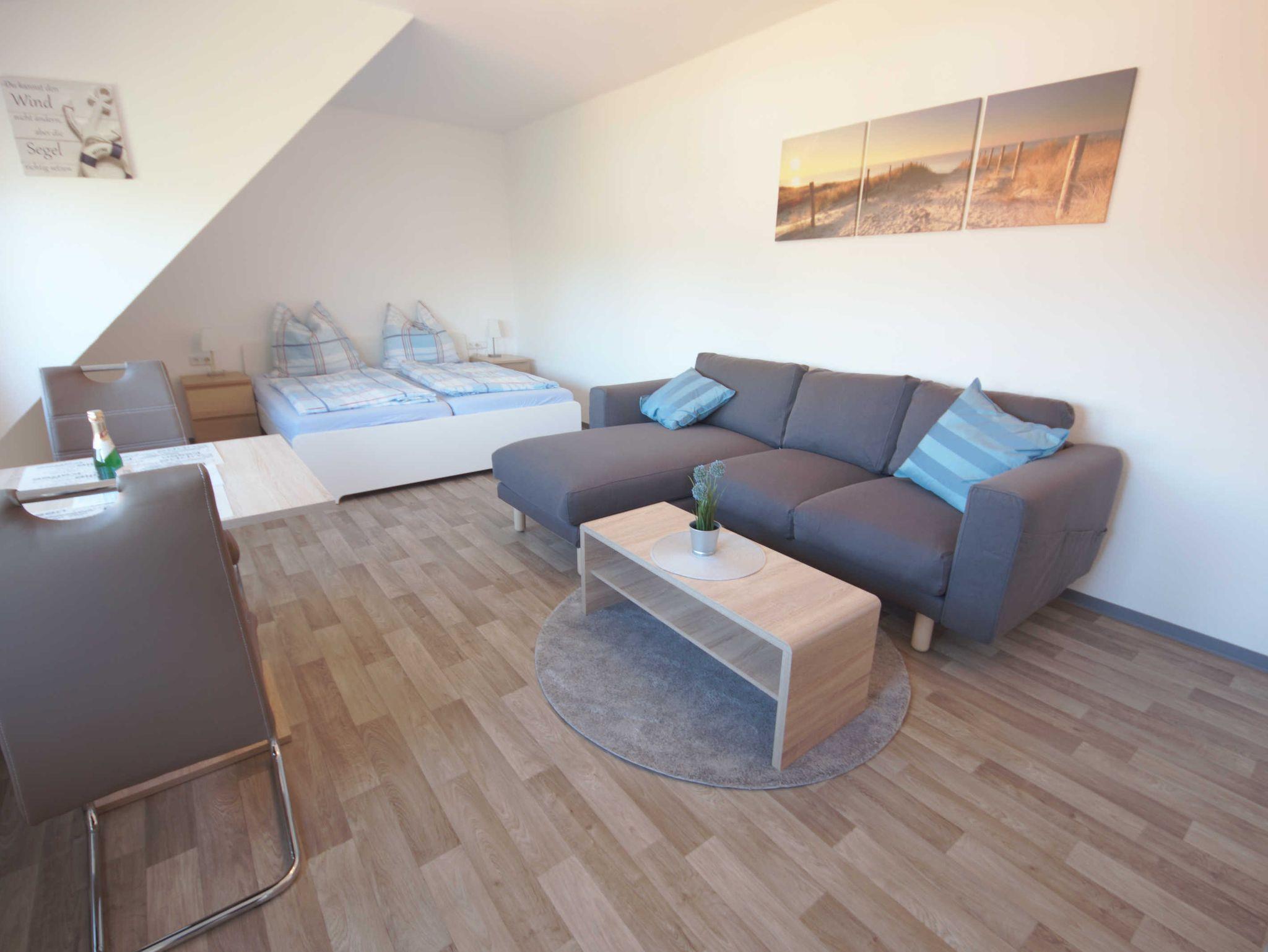 Die Wohnung bietet Platz 2 Personen. Bei Bedarf kann zusätzlich ein Kind in einem Kinderreisebett übernachten. Der Wohnraum ist ausgestattet mit einem Doppelbett, Essecke und Sofa. Das Bad ist hell und geräumig.