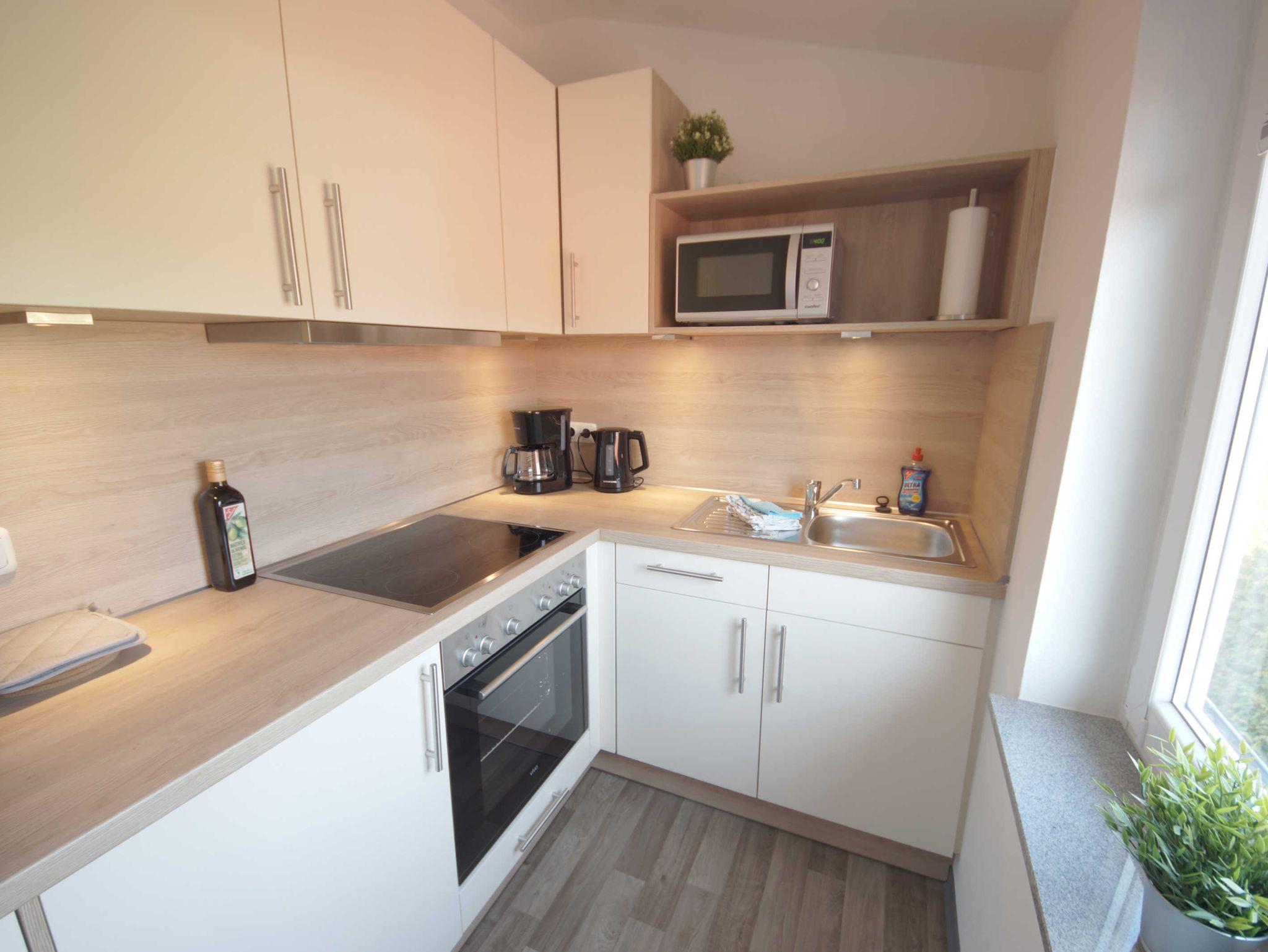 Die Küche ist mit einem Backofen, Kühlschrank mit Gefrierfach und einer Mikrowelle ausgestattet. Zudem finden Sie alle Utensilien in der Küche, die Sie sonst auch im Alltag benötigen. Im Keller befindet sich eine Waschmaschine, die kostenlos genutzt werden kann.